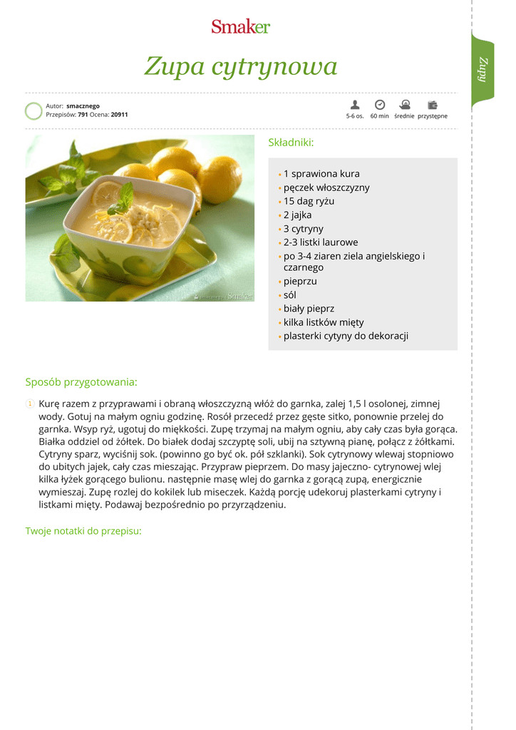 Zupa cytrynowa Autor: smacznego Przepisów: 791 Ocena: 20911 5-6 os. 60 min średnie przystępne Składniki: 1 sprawiona kura pęczek włoszczyzny 15 dag ryżu 2 jajka 3 cytryny 2-3 listki laurowe po 3-4 ziaren ziela angielskiego i czarnego pieprzu sól biały pieprz kilka listków mięty plasterki cytyny do dekoracji Sposób przygotowania: 1 Kurę razem z przyprawami i obraną włoszczyzną włóż do garnka, zalej 1,5 l osolonej, zimnej wody. Gotuj na małym ogniu godzinę. Rosół przecedź przez gęste sitko, ponownie przelej do garnka. Wsyp ryż, ugotuj do miękkości. Zupę trzymaj na małym ogniu, aby cały czas była gorąca. Białka oddziel od żółtek. Do białek dodaj szczyptę soli, ubij na sztywną pianę, połącz z żółtkami. Cytryny sparz, wyciśnij sok. (powinno go być ok. pół szklanki). Sok cytrynowy wlewaj stopniowo do ubitych jajek, cały czas mieszając. Przypraw pieprzem. Do masy jajeczno- cytrynowej wlej kilka łyżek gorącego bulionu. następnie masę wlej do garnka z gorącą zupą, energicznie wymieszaj. Zupę rozlej do kokilek lub miseczek. Każdą porcję udekoruj plasterkami cytryny i listkami mięty. Podawaj bezpośrednio po przyrządzeniu. Twoje notatki do przepisu: