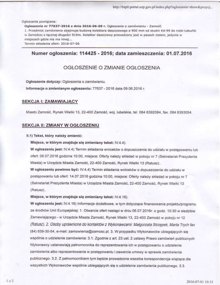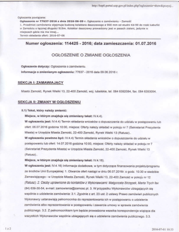 Ogłoszenie nr 114425-2016 o zmianie ogłoszenia o zamówieniu