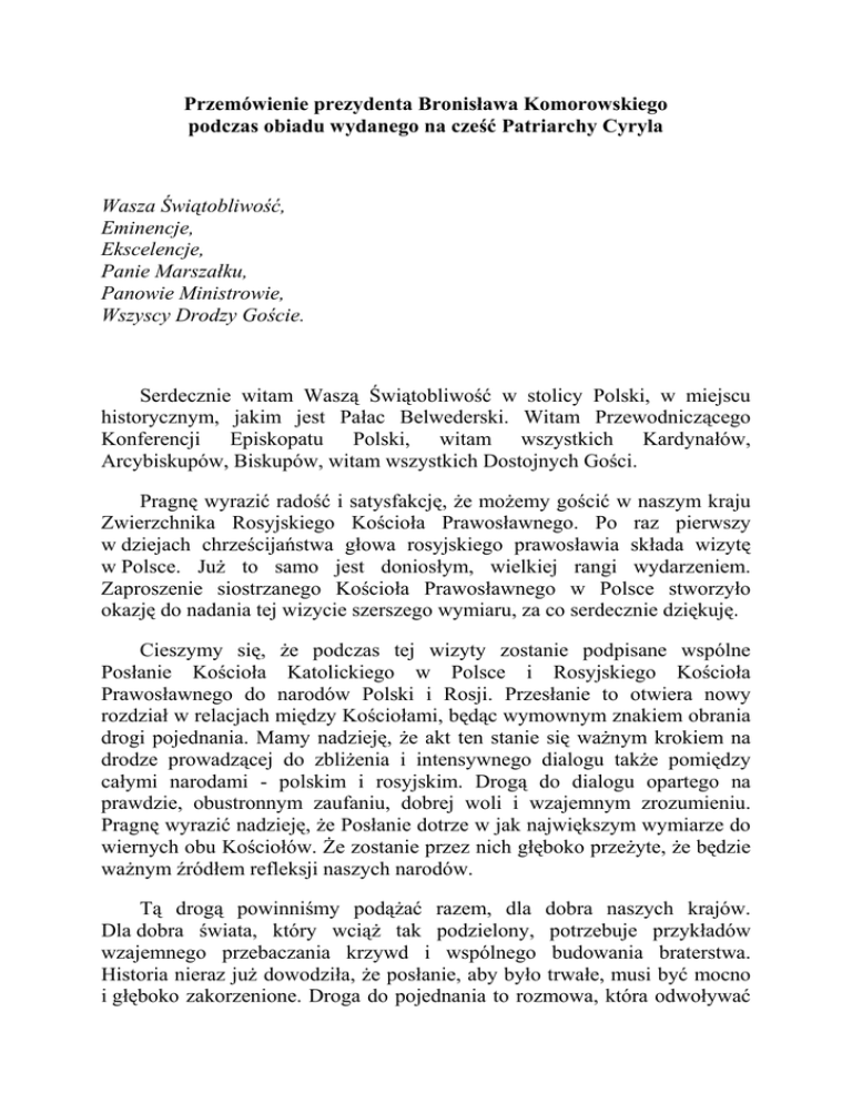 Przemówienie prezydenta Bronisława Komorowskiego podczas obiadu wydanego na cześć Patriarchy Cyryla Wasza Świątobliwość, Eminencje, Ekscelencje, Panie Marszałku, Panowie Ministrowie, Wszyscy Drodzy Goście. Serdecznie witam Waszą Świątobliwość w stolicy Polski, w miejscu historycznym, jakim jest Pałac Belwederski. Witam Przewodniczącego Konferencji Episkopatu Polski, witam wszystkich Kardynałów, Arcybiskupów, Biskupów, witam wszystkich Dostojnych Gości. Pragnę wyrazić radość i satysfakcję, że możemy gościć w naszym kraju Zwierzchnika Rosyjskiego Kościoła Prawosławnego. Po raz pierwszy w dziejach chrześcijaństwa głowa rosyjskiego prawosławia składa wizytę w Polsce. Już to samo jest doniosłym, wielkiej rangi wydarzeniem. Zaproszenie siostrzanego Kościoła Prawosławnego w Polsce stworzyło okazję do nadania tej wizycie szerszego wymiaru, za co serdecznie dziękuję. Cieszymy się, że podczas tej wizyty zostanie podpisane wspólne Posłanie Kościoła Katolickiego w Polsce i Rosyjskiego Kościoła Prawosławnego do narodów Polski i Rosji. Przesłanie to otwiera nowy rozdział w relacjach między Kościołami, będąc wymownym znakiem obrania drogi pojednania. Mamy nadzieję, że akt ten stanie się ważnym krokiem na drodze prowadzącej do zbliżenia i intensywnego dialogu także pomiędzy całymi narodami - polskim i rosyjskim. Drogą do dialogu opartego na prawdzie, obustronnym zaufaniu, dobrej woli i wzajemnym zrozumieniu. Pragnę wyrazić nadzieję, że Posłanie dotrze w jak największym wymiarze do wiernych obu Kościołów. Że zostanie przez nich głęboko przeżyte, że będzie ważnym źródłem refleksji naszych narodów. Tą drogą powinniśmy podążać razem, dla dobra naszych krajów. Dla dobra świata, który wciąż tak podzielony, potrzebuje przykładów wzajemnego przebaczania krzywd i wspólnego budowania braterstwa. Historia nieraz już dowodziła, że posłanie, aby było trwałe, musi być mocno i głęboko zakorzenione. Droga do pojednania to rozmowa, która odwoływać się będzie do fundamentalnych wartości, takich jak wolność i odpowiedzialność, miłość bliźniego i przebaczenie, tylko to może prowadzić nas w przyszłość w sposób pewny i trwały. Kościoły chrześcijańskie troskę o moralne fundamenty ludzkich wspólnot traktują jako swoje najważniejsze zadanie. Potrafią poruszyć sumieniem człowieka, otworzyć je na innego, na jego cierpienie i na jego potrzeby. I dlatego to właśnie Kościoły mogą wspólnie zapalić światło, które będzie oświetlać drogę pojednania pomiędzy narodami, pomiędzy społeczeństwami. Polska od 1989 roku kształtuje swój los w pełni suwerennie, opierając go na zasadach demokratycznego państwa prawa. Te zasady rządzą również naszym stosunkiem do Kościołów i wyznań. Wzajemna autonomia państwa i Kościoła, szanująca świecki charakter państwa oraz rolę Kościołów, przyznaje równe prawa wszystkim Kościołom. Na tych zasadach układają się również stosunki państwa z polskim Kościołem Prawosławnym, poprzez uznanie jego roli i jego potrzeb. Szanując zasadę wzajemnej autonomii chcemy ją jednak wypełniać treścią współpracy dla dobra wspólnego. Chcemy współpracy na rzecz dobra wspólnego z wszystkimi Kościołami w Polsce. Polska była i jest żywotnie zainteresowana ułożeniem dobrych stosunków z wszystkimi naszymi sąsiadami. Jest to ważne dla pokoju i rozwoju cywilizacyjnego naszych krajów i dla całej Europy. Dążymy więc i nadal będziemy dążyć do dobrego układania się stosunków pomiędzy naszymi państwami, pomiędzy Polską i Rosją. Prace podjęte w polskorosyjskiej grupie do spraw trudnych między intelektualistami, uczonymi i badaczami, stanowią ważny element kształtowania naszych stosunków. Wynikają z głębokiego przekonania, że pojednanie, aby było trwałe, powinno być budowane na wspólnym szukaniu i przeżywaniu prawdy o niełatwej, ale pokonanej historii. Dlatego w pełni doceniamy starania współczesnego Rosyjskiego Kościoła Prawosławnego służące odkrywaniu historycznej prawdy, służące jednoznacznemu i konsekwentnemu odrzucaniu zła, które w dziejach, zwłaszcza w XX wieku, wypływało z ideologii zwróconej przeciwko ludzkiej wolności i godności. Było to zło wszelkiego, także komunistycznego totalitaryzmu, które tak boleśnie ugodziło w naród polski, uderzyło także w duchownych i wiernych Kościoła Prawosławnego w Rosji. Wielu z nich zapłaciło najwyższą cenę za przywiązanie do wiary i do moralnego porządku. Ta historia prześladowań i cierpień stanowiąc doświadczenie obu Kościołów, jest czymś, co pozwala lepiej zrozumieć się nawzajem. I dlatego uważam, że właśnie Kościoły mogą w znaczący sposób przyczynić się do polsko-rosyjskiego zbliżenia. Mogą poprowadzić nasze narody ku przezwyciężeniu narosłych uprzedzeń i stereotypów, które przeszkadzają patrzeć na siebie ze wzajemną ufnością i ze wzajemną nadzieją na przyszłość. Wyrażam więc wdzięczność za gesty i działania podkreślające wspólnotę cierpienia obu naszych narodów w okresie nocy stalinowskiej. Między innymi za niedawne poświęcenie przez Waszą Świątobliwość cerkwi przy wejściu na teren cmentarza katyńskiego, gdzie leżą w sąsiadujących ze sobą mogiłach tysiące pomordowanych polskich oficerów - jeńców wojennych i tysiące Rosjan - obywateli ZSRR wymordowanych w czasie czystek komunistycznych. Pamiętamy też, że tam wśród polskich ofiar są także wyznawcy prawosławia - a wśród nich naczelny prawosławny kapelan Wojska Polskiego ks. Szymon Fedorońko. Byłem naprawdę głęboko poruszony piękną, wspólną modlitwą polskich i rosyjskich, katolickich i prawosławnych kapłanów nad tymi wszystkimi mogiłami, nad mogiłami polskimi i rosyjskimi. Piękną, wspaniałą, głęboką modlitwą zwieńczoną gestem przekazania polskim duchownym 