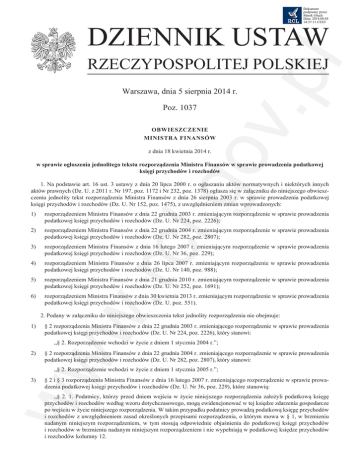 Dokument podpisany przez Marek Głuch Data: 2014.08.05 14:37:11 CEST DZIENNIK USTAW v.p l RZECZYPOSPOLITEJ POLSKIEJ Warszawa, dnia 5 sierpnia 2014 r. Poz. 1037 OBWIESZCZENIE MINISTRA FINANSÓW .go z dnia 18 kwietnia 2014 r. w sprawie ogłoszenia jednolitego tekstu rozporządzenia Ministra Finansów w sprawie prowadzenia podatkowej księgi przychodów i rozchodów 1. Na podstawie art. 16 ust. 3 ustawy z dnia 20 lipca 2000 r. o ogłaszaniu aktów normatywnych i niektórych innych aktów prawnych (Dz. U. z 2011 r. Nr 197, poz. 1172 i Nr 232, poz. 1378) ogłasza się w załączniku do niniejszego obwieszczenia jednolity tekst rozporządzenia Ministra Finansów z dnia 26 sierpnia 2003 r. w sprawie prowadzenia podatkowej księgi przychodów i rozchodów (Dz. U. Nr 152, poz. 1475), z uwzględnieniem zmian wprowadzonych: rozporządzeniem Ministra Finansów z dnia 22 grudnia 2003 r. zmieniającym rozporządzenie w sprawie prowadzenia podatkowej księgi przychodów i rozchodów (Dz. U. Nr 224, poz. 2226); 2) rozporządzeniem Ministra Finansów z dnia 22 grudnia 2004 r. zmieniającym rozporządzenie w sprawie prowadzenia podatkowej księgi przychodów i rozchodów (Dz. U. Nr 282, poz. 2807); 3) 4) 5) 6) w. rcl 1) rozporządzeniem Ministra Finansów z dnia 16 lutego 2007 r. zmieniającym rozporządzenie w sprawie prowadzenia podatkowej księgi przychodów i rozchodów (Dz. U. Nr 36, poz. 229); rozporządzeniem Ministra Finansów z dnia 26 lipca 2007 r. zmieniającym rozporządzenie w sprawie prowadzenia podatkowej księgi przychodów i rozchodów (Dz. U. Nr 140, poz. 988); rozporządzeniem Ministra Finansów z dnia 21 grudnia 2010 r. zmieniającym rozporządzenie w sprawie prowadzenia podatkowej księgi przychodów i rozchodów (Dz. U. Nr 252, poz. 1691); rozporządzeniem Ministra Finansów z dnia 30 kwietnia 2013 r. zmieniającym rozporządzenie w sprawie prowadzenia podatkowej księgi przychodów i rozchodów (Dz. U. poz. 551). 2. Podany w załączniku do niniejszego obwieszczenia tekst jednolity rozporządzenia nie obejmuje: 1) § 2 rozporządzenia Ministra Finansów z dnia 22 grudnia 2003 r. zmieniającego rozporządzenie w sprawie prowadzenia podatkowej księgi przychodów i rozchodów (Dz. U. Nr 224, poz. 2226), który stanowi: „§ 2. Rozporządzenie wchodzi w życie z dniem 1 stycznia 2004 r.”; § 2 rozporządzenia Ministra Finansów z dnia 22 grudnia 2004 r. zmieniającego rozporządzenie w sprawie prowadzenia podatkowej księgi przychodów i rozchodów (Dz. U. Nr 282, poz. 2807), który stanowi: ww 2) „§ 2. Rozporządzenie wchodzi w życie z dniem 1 stycznia 2005 r.”; 3) § 2 i § 3 rozporządzenia Ministra Finansów z dnia 16 lutego 2007 r. zmieniającego rozporządzenie w sprawie prowadzenia podatkowej księgi przychodów i rozchodów (Dz. U. Nr 36, poz. 229), które stanowią: „§ 2. 1. Podatnicy, którzy przed dniem wejścia w życie niniejszego rozporządzenia założyli podatkową księgę przychodów i rozchodów według wzoru dotychczasowego, mogą ewidencjonować w tej księdze zdarzenia gospodarcze po wejściu w życie niniejszego rozporządzenia. W takim przypadku podatnicy prowadzą podatkową księgę przychodów i rozchodów z uwzględnieniem zasad określonych przepisami rozporządzenia, o którym mowa w § 1, w brzmieniu nadanym niniejszym rozporządzeniem, w tym stosują odpowiednie objaśnienia do podatkowej księgi przychodów i rozchodów w brzmieniu nadanym niniejszym rozporządzeniem i nie wypełniają w podatkowej księdze przychodów i rozchodów kolumny 12. Dziennik Ustaw –2– Poz. 1037 v.p l 2. Podatkową księgę przychodów i rozchodów prowadzoną przed wejściem w życie niniejszego rozporządzenia zgodnie z przepisami rozporządzenia, o którym mowa w § 1, w brzmieniu dotychczasowym, z uwzględnieniem przepisów ustawy z dnia 26 lipca 1991 r. o podatku dochodowym od osób fizycznych, w brzmieniu obowiązującym od dnia 1 stycznia 2007 r., uznaje się za niewadliwą. W takim przypadku przepis § 11 ust. 2 rozporządzenia, o którym mowa w § 1, nie ma zastosowania. 3. Przepisy ust. 1 i 2 stosuje się odpowiednio w razie prowadzenia podatkowej księgi przychodów i rozchodów przy zastosowaniu technik informatycznych. § 3. Rozporządzenie wchodzi w życie po upływie 14 dni od dnia ogłoszenia.”; 4) § 2 rozporządzenia Ministra Finansów z dnia 26 lipca 2007 r. zmieniającego rozporządzenie w sprawie prowadzenia podatkowej księgi przychodów i rozchodów (Dz. U. Nr 140, poz. 988), który stanowi: „§ 2. Rozporządzenie wchodzi w życie po upływie 7 dni od dnia ogłoszenia.”; § 2 rozporządzenia Ministra Finansów z dnia 21 grudnia 2010 r. zmieniającego rozporządzenie w sprawie prowadzenia podatkowej księgi przychodów i rozchodów (Dz. U. Nr 252, poz. 1691), który stanowi: .go 5) „§ 2. Rozporządzenie wchodzi w życie z dniem 1 stycznia 2011 r.”; § 2 i § 3 rozporządzenia Ministra Finansów z dnia 30 kwietnia 2013 r. zmieniającego rozporządzenie w sprawie prowadzenia podatkowej księgi przychodów i rozchodów (Dz. U. poz. 551), które stanowią: w. rcl „§ 2. 1. Jeżeli w okresie od dnia 1 stycznia 2013 r. do dnia wejścia w życie niniejszego rozporządzenia podatnik zmniejszał koszty uzyskania przychodów (zwiększał przychody) lub zwiększał koszty uzyskania przychodów, zgodnie z art. 24d ustawy z dnia 26 lipca 1991 r. o podatku dochodowym od osób fizycznych, kwoty, których nie wykazał w księdze w tym okresie, powinien wpisać we właściwej kolumnie, w miesiącu, w którym niniejsze rozporządzenie wchodzi w życie. W kolumnie „Uwagi” należy wskazać pozycję księgi, w której zaewidencjonowano koszty uzyskania przychodów. Kwoty zmniejszające koszty uzyskania przychodów należy wpisać ze znakiem minus (-) albo kolorem czerwonym. 2. Księgę uznaje się za niewadliwą także w przypadku, gdy przed dniem wejścia w życie niniejszego rozporządzenia zapisy w księdze dokonywane były na podstawie fak