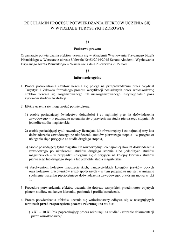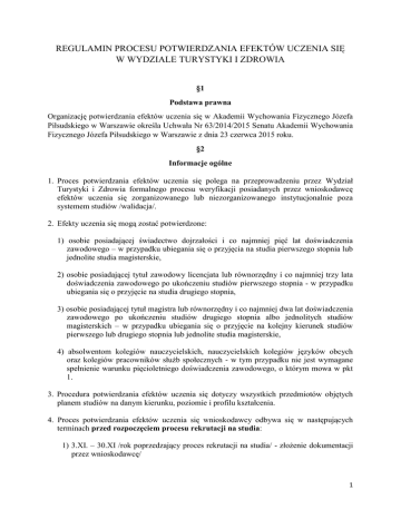 REGULAMIN PROCESU POTWIERDZANIA EFEKTÓW UCZENIA SIĘ W WYDZIALE TURYSTYKI I ZDROWIA §1 Podstawa prawna Organizację potwierdzania efektów uczenia się w Akademii Wychowania Fizycznego Józefa Piłsudskiego w Warszawie określa Uchwała Nr 63/2014/2015 Senatu Akademii Wychowania Fizycznego Józefa Piłsudskiego w Warszawie z dnia 23 czerwca 2015 roku. §2 Informacje ogólne 1. Proces potwierdzania efektów uczenia się polega na przeprowadzeniu przez Wydział Turystyki i Zdrowia formalnego procesu weryfikacji posiadanych przez wnioskodawcę efektów uczenia się zorganizowanego lub niezorganizowanego instytucjonalnie poza systemem studiów /walidacja/. 2. Efekty uczenia się mogą zostać potwierdzone: 1) osobie posiadającej świadectwo dojrzałości i co najmniej pięć lat doświadczenia zawodowego – w przypadku ubiegania się o przyjęcia na studia pierwszego stopnia lub jednolite studia magisterskie, 2) osobie posiadającej tytuł zawodowy licencjata lub równorzędny i co najmniej trzy lata doświadczenia zawodowego po ukończeniu studiów pierwszego stopnia - w przypadku ubiegania się o przyjęcie na studia drugiego stopnia, 3) osobie posiadającej tytuł magistra lub równorzędny i co najmniej dwa lat doświadczenia zawodowego po ukończeniu studiów drugiego stopnia albo jednolitych studiów magisterskich – w przypadku ubiegania się o przyjęcie na kolejny kierunek studiów pierwszego lub drugiego stopnia lub jednolite studia magisterskie, 4) absolwentom kolegiów nauczycielskich, nauczycielskich kolegiów języków obcych oraz kolegiów pracowników służb społecznych - w tym przypadku nie jest wymagane spełnienie warunku pięcioletniego doświadczenia zawodowego, o którym mowa w pkt 1. 3. Procedura potwierdzania efektów uczenia się dotyczy wszystkich przedmiotów objętych planem studiów na danym kierunku, poziomie i profilu kształcenia. 4. Proces potwierdzania efektów uczenia się wnioskodawcy odbywa się w następujących terminach przed rozpoczęciem procesu rekrutacji na studia: 1) 3.XI. – 30.XI /rok poprzedzający proces rekrutacji na studia/ - złożenie dokumentacji przez wnioskodawcę/ 1 2) 1.XII – 20.XII /rok poprzedzający proces rekrutacji na studia/ - ocena efektów uczenia się i podjęcie decyzji przez Wydziałową Komisję ds. Potwierdzania Efektów Uczenia się o dopuszczeniu/niedopuszczeniu wnioskodawcy do egzaminów walidacyjnych. 3) 7.I. – 31.I. /w roku odbywania się rekrutacji na studia/ - przeprowadzenie egzaminów walidacyjnych przez poszczególne komisje i wydanie decyzji w sprawie potwierdzenia/niepotwierdzenia efektów uczenia się. 4) 1.II. – 15.III. / w roku odbywania się rekrutacji na studia/ - procedura odwoławcza w sprawie decyzji Wydziałowej Komisji ds. Potwierdzania Efektów Uczenia się Dziekana Wydziału 5) 1.IV. – rekrutacja na studia 5. Pozytywna decyzja komisji wydziałowej o potwierdzeniu efektów uczenia się jest ważna w tym roku akademickim, w którym została wydana, umożliwiając wnioskodawcy rozpoczęcie studiów w Uczelni od kolejnego roku akademickiego, w przypadku zakwalifikowania się wnioskodawcy (pomyślnego przejścia procesu rekrutacji) na studia na danym kierunku, poziomie i profilu w WTiZ. 6. Wnioskodawca po potwierdzeniu danych efektów uczenia się przystępuje do procesu rekrutacji na studia, a następnie, jeśli ten przebiegnie pomyślnie, przedstawia osobom odpowiedzialnym za realizację danego przedmiotu na studiach decyzję o potwierdzeniu efektów uczenia się. Zgodnie z Regulaminem Studiów AWF Józefa Piłsudskiego w Warszawie §15 Zaliczenie przedmiotów i praktyk pkt.3 „(…) Do średniej ocen ze studiów nie wlicza się zajęć, które zostały uznane studentowi w procesie walidacji posiadanych efektów uczenia się”. Wnioskodawca otrzymuje liczbę punktów ECTS, przyporządkowaną do zajęć, które zaliczył w wyniku potwierdzenia efektów uczenia się; 7. W wyniku potwierdzania efektów uczenia się można zaliczyć studentowi nie więcej niż 50% punktów ECTS przypisanych do danego programu kształcenia określonego kierunku, poziomu i profilu kształcenia. 8. Wydział Turystyki i Zdrowia dla osób przyjętych w wyniku przeprowadzenia procedury potwierdzania efektów uczenia się nie tworzy odrębnych „skróconych” programów kształcenia, ani odrębnych grup studenckich. 9. Za przeprowadzenie postępowania związanego z potwierdzaniem efektów uczenia się pobierane są opłaty. Konkretna wysokość opłaty za przeprowadzenie procedury potwierdzania efektów uczenia się, w stosunku do danej osoby podlegającej tej procedurze, ustalana jest przez Dziekana WTiZ. Wniesione opłaty, nie podlegają zwrotowi, bez względu na wynik procesu potwierdzania efektów uczenia się, tzn. czy dany efekt uczenia się został przez właściwą komisję faktycznie potwierdzony, czy też nie, w wyniku braku pozytywnego przejścia procedury w zakresie danego efektu. 2 §3 Indentyfikacja EUs Proces potwierdzania efektów uczenia się realizowany jest w oparciu o pogram studiów kierunku turystyka i rekreacja studia stacjonarne I i II stopnia. §4 Dokumentacja EUs 1. Wnioskodawca składa wniosek o potwierdzenie efektów uczenia się, portfolio oraz opłatę za przeprowadzenie procedury potwierdzania efektów uczenia się w Dziekanacie Wydziału Turystyki i Zdrowia lub u Sekretarza Wydziałowej Komisji ds. Potwierdzania Efektów Uczenia się: 1) wniosek o potwierdzenie efektów uczenia się stanowi załącznik nr 1, 2) portfolio/wykaz dokumentów kandydata/ stanowi załącznik nr 2 do niniejszego regulaminu. §5 Ocena efektów uczenia się Do oceny efektów uczenia się Rada Wydziału Turystyki i Zdrowia powoła Wydziałową Komisję ds. Potwierdzania Efektów Uczenia się. §6 Procedura oceny efektów uczenia się wnioskodawcy 1. W przypadku uznania przez Wydziałową Komisję ds. Potwierdzania Efektów Uczenia się wniosku o potwierdzenie efektów uczenia się za niekompletny, wniosk