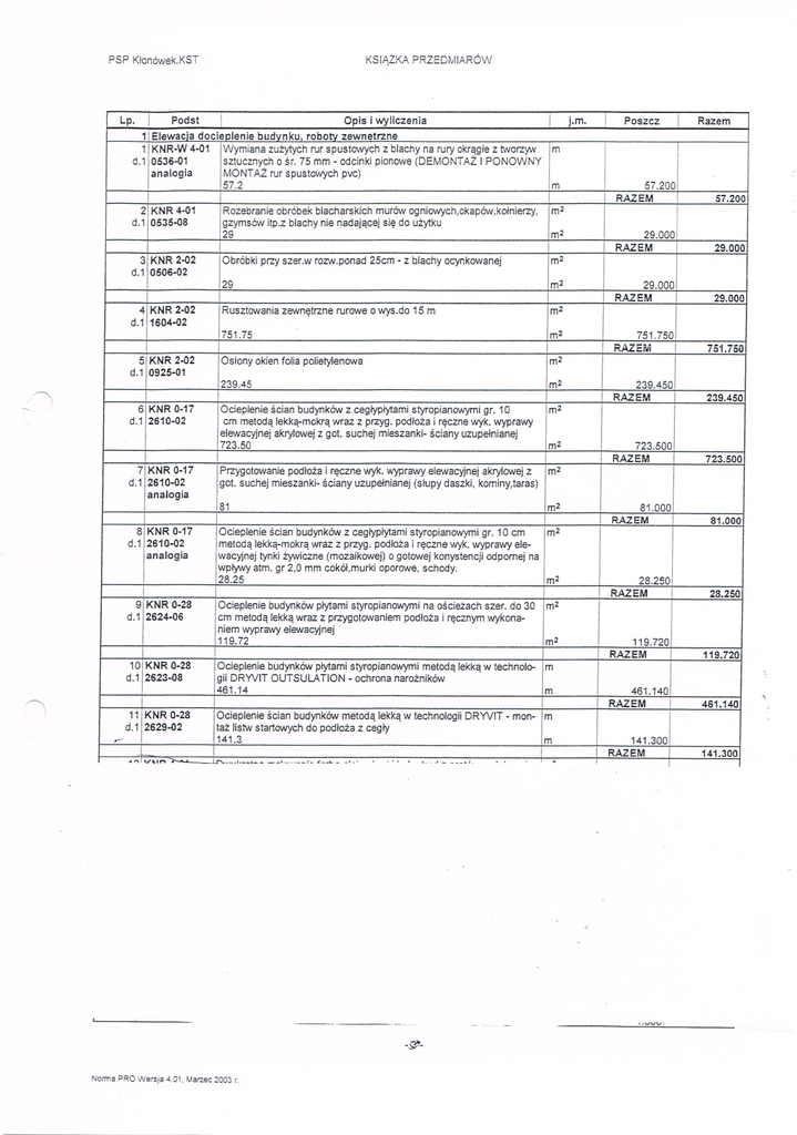PSP Kłonówek.KST Lp. KSIĄŻ KA PRZEDMIARÓW Opis i wyliczenia Podst j.m. Poszcz Elewacja docieplenie budynku, roboty zewnetrzne 1 KNR-W 4-01 Wymiana zu żytych rur spustowych z blachy na rury okr ąg łe z tworzyw sztucznych o ś r. 75 mm - odcinki pionowe (DEMONTA Ż I PONOWNY di 0536 -01 analogia MONTAZ rur spustowych pyc) 57.2 im 2 KNR 4-01 d.1 0535-08 Rozebranie obróbek blacharskich murów ogniowych,okapów,kołnierzy, gzymsów itp.z blachy nie nadaj ącej się do użytku 29 m Obróbki przy szer.w rozw.ponad 25cm - z blachy ocynkowanej m2 29 m2 Rusztowania zewn ętrzne rurowe O wys.do 15 m m2 5 KNR 2-02 cLi 0925-01 751.75 1 m2 Os łony okien folia polietylenowa m2 239.45 m Ocieplenie ś cian budynków z cegłypłytami styropianowymi gr. 10 cm metod ą lekką-mokr ą wraz z przyg. podłoża i ręczne wyk. wyprawy elewacyjnej akrylowej z got. suchej mieszanki- ś ciany uzupełnianej 723.50 m2 1 71KNR 0-17 d.1 2610 _02 analogia 91 KNR 0-28 d.1 2624-06 10 KNR 0-28 d.1 2623-08 11 KNR 0-28 d.1 2629-02 57.200 29.0001 RAZEM 1 29.000 29.000 RAZEM 1 29.000 751.750 RAZEM 751.750 239.450 RAZEM 239.450 i M2 RAZEM 723.500 RAZEM 81.000 28.250 RAZEM 28.250 119.720 RAZEM 119.720 461.140 1 RAZEM 461.140 141.300 RAZEM 141.300 Przygotowanie pod łoża i ręczne wyk. wyprawy elewacyjnej akrylowej z im2 got. suchej mieszanki- ś ciany uzupełnianej (s łupy daszki, kominytaras) 81 8 KNR 0-17 d.1 2610-02 analogia 57.2001 RAZEM I 4 KNR 2-02 d.1 1604-02 6i KNR 0-17 d.l 2610-02 Razem m2 I 3 KNR 2-02 d.1 0506-02 I rn 2 1m2 Ocieplenie ś cian budynków z ceg łypłytami styropianowymi gr. 10 cm metod ą lekką-mokrą wraz z przyg. pod łoż a i ręczne wyk. wyprawy elewacynej tynki żywiczne (mozaikowej) o gotowej konystencji odpornej na wpływy atm. gr 2,0 mm cokół murki oporowe, schody. 28.25 m2 Ocieplenie budynków płytami styropianowymi na o ś cież ach szer. do 30 cm metod ą lekk ą wraz z przygotowaniem pod łoża i ręcznym wykonaniem wyprawy elewacyjnej 119.72 Ocieplenie budynków płytami styropianowymi metod ą lekką w technologil DRWIT OUTSULATION - ochrona naroż ników 461.14 I M2 m2 m m Ocieplenie ś cian budynków metod ą lekką w technologii DRWIT - mon- m taż listw startowych do pod łoż a z ceg ły 141.3 m Norma PRO Wersja 4.01, Marzec 2003 r.