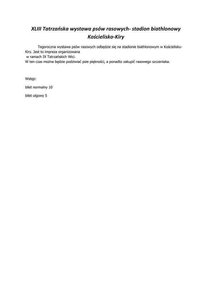 XLIII Tatrzańska wystawa psów rasowych- stadion biathlonowy Kościelisko-Kiry Tegoroczna wystawa psów rasowych odbędzie się na stadionie biathlonowym w KościeliskuKiry. Jest to impreza organizowana w ramach IX Tatrzańskich Wici. W ten czas można będzie podziwiać psie piękności, a ponadto zakupić rasowego szczeniaka. Wstęp: bilet normalny 10 bilet ulgowy 5