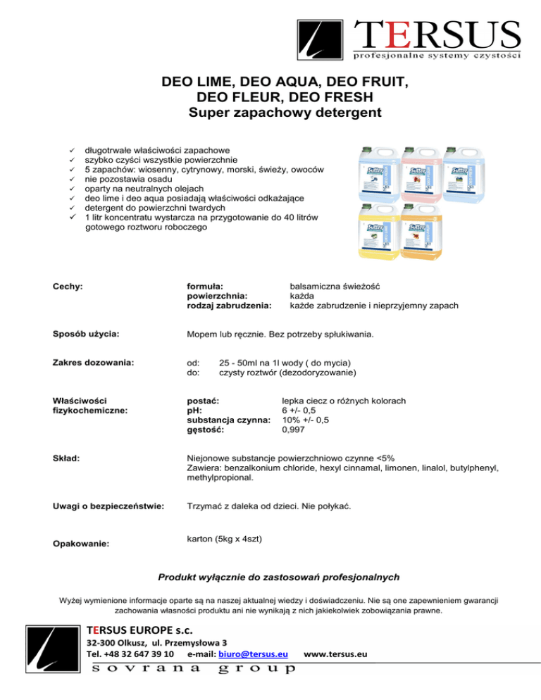 DEO LIME, DEO AQUA, DEO FRUIT, DEO FLEUR, DEO FRESH Super zapachowy detergent długotrwałe właściwości zapachowe szybko czyści wszystkie powierzchnie 5 zapachów: wiosenny, cytrynowy, morski, świeży, owoców nie pozostawia osadu oparty na neutralnych olejach deo lime i deo aqua posiadają właściwości odkażające detergent do powierzchni twardych 1 litr koncentratu wystarcza na przygotowanie do 40 litrów gotowego roztworu roboczego Cechy: formuła: powierzchnia: rodzaj zabrudzenia: Sposób użycia: Mopem lub ręcznie. Bez potrzeby spłukiwania. Zakres dozowania: od: do: Właściwości fizykochemiczne: postać: pH: substancja czynna: gęstość: Skład: Niejonowe substancje powierzchniowo czynne <5% Zawiera: benzalkonium chloride, hexyl cinnamal, limonen, linalol, butylphenyl, methylpropional. Uwagi o bezpieczeństwie: Trzymać z daleka od dzieci. Nie połykać. Opakowanie: balsamiczna świeżość każda każde zabrudzenie i nieprzyjemny zapach 25 - 50ml na 1l wody ( do mycia) czysty roztwór (dezodoryzowanie) lepka ciecz o różnych kolorach 6 +/- 0,5 10% +/- 0,5 0,997 karton (5kg x 4szt) Produkt wyłącznie do zastosowań profesjonalnych Wyżej wymienione informacje oparte są na naszej aktualnej wiedzy i doświadczeniu. Nie są one zapewnieniem gwarancji zachowania własności produktu ani nie wynikają z nich jakiekolwiek zobowiązania prawne. TERSUS EUROPE s.c. 32-300 Olkusz, ul. Przemysłowa 3 Tel. +48 32 647 39 10 e-mail: [email protected] www.tersus.eu TERSUS EUROPE s.c. 32-300 Olkusz, ul. Przemysłowa 3 Tel. +48 32 647 39 10 e-mail: [email protected] www.tersus.eu