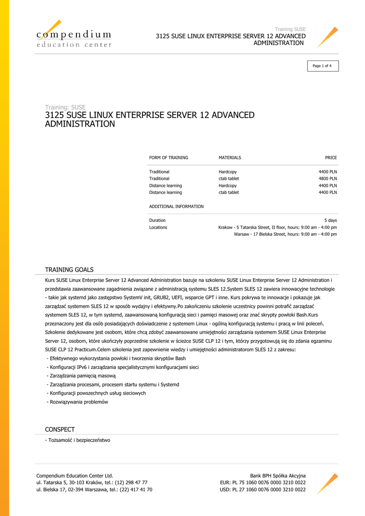 Training SUSE 3125 SUSE LINUX ENTERPRISE SERVER 12 ADVANCED ADMINISTRATION Page 1 of 4 Training: SUSE 3125 SUSE LINUX ENTERPRISE SERVER 12 ADVANCED ADMINISTRATION FORM OF TRAINING MATERIALS PRICE Traditional Hardcopy 4400 PLN Traditional ctab tablet 4800 PLN Distance learning Hardcopy 4400 PLN Distance learning ctab tablet 4400 PLN ADDITIONAL INFORMATION Duration Locations 5 days Krakow - 5 Tatarska Street, II floor, hours: 9:00 am - 4:00 pm Warsaw - 17 Bielska Street, hours: 9:00 am - 4:00 pm TRAINING GOALS Kurs SUSE Linux Enterprise Server 12 Advanced Administration bazuje na szkoleniu SUSE Linux Enterprise Server 12 Administration i przedstawia zaawansowane zagadnienia związane z administracją systemu SLES 12.System SLES 12 zawiera innowacyjne technologie - takie jak systemd jako zastępstwo SystemV init, GRUB2, UEFI, wsparcie GPT i inne. Kurs pokrywa te innowacje i pokazuje jak zarządzać systemem SLES 12 w sposób wydajny i efektywny.Po zakończeniu szkolenie uczestnicy powinni potrafić zarządzać systemem SLES 12, w tym systemd, zaawansowaną konfiguracją sieci i pamięci masowej oraz znać skrypty powłoki Bash.Kurs przeznaczony jest dla osób posiadających doświadczenie z systemem Linux - ogólną konfiguracją systemu i pracą w linii poleceń. Szkolenie dedykowane jest osobom, które chcą zdobyć zaawansowane umiejętności zarządzania systemem SUSE Linux Enterprise Server 12, osobom, które ukończyły poprzednie szkolenie w ścieżce SUSE CLP 12 i tym, którzy przygotowują się do zdania egzaminu SUSE CLP 12 Practicum.Celem szkolenia jest zapewnienie wiedzy i umiejętności administratorom SLES 12 z zakresu: - Efektywnego wykorzystania powłoki i tworzenia skryptów Bash - Konfiguracji IPv6 i zarządzania specjalistycznymi konfiguracjami sieci - Zarządzania pamięcią masową - Zarządzania procesami, procesem startu systemu i Systemd - Konfiguracji powszechnych usług sieciowych - Rozwiązywania problemów CONSPECT - Tożsamość i bezpieczeństwo Compendium Education Center Ltd. ul. Tatarska 5, 30-103 Kraków, tel.: (12) 298 47 77 ul. Bielska 17, 02-394 Warszawa, tel.: (22) 417 41 70 Bank BPH Spółka Akcyjna EUR: PL 75 1060 0076 0000 3210 0022 USD: PL 27 1060 0076 0000 3210 0022 Training SUSE 3125 SUSE LINUX ENTERPRISE SERVER 12 ADVANCED ADMINISTRATION Page 2 of 4 - Delegacja uprawnień (sudo/polkit) - Listy kontroli dostępu (ACL) - AppArmor - Zaawansowana konfiguracja sieci - Bonding - VLAN - IPv6 - Zarządzanie pamięcią masową - iSCSI - MPIO - Monitoring i rozwiązywanie problemów - Konfiguracja logów systemowych - Kopie zapasowe/przywracanie, Snapper - Utrzymanie stanu serwera - Rozwiązywanie problemów Compendium Education Center Ltd. ul. Tatarska 5, 30-103 Kraków, tel.: (12) 298 47 77 ul. Bielska 17, 02-394 Warszawa, tel.: (22) 417 41 70 Bank BPH Spółka Akcyjna EUR: PL 75 1060 0076 0000 3210 0022 USD: PL 27 1060 0076 0000 3210 0022 Training SUSE 3125 SUSE LINUX ENTERPRISE SERVER 12 ADVANCED ADMINISTRATION Page 3 of 4 - Usługi sieciowe - SSH - xinetd - NFSv4 - Apache2 - Samba 4 - Skrypty powłoki - Elementy skryptów powłoki - Struktury kontrolne - Skrypty interaktywne REQUIREMENTS Zalecane jest, aby uczestnicy posiadali doświadczenie z systemem Linux i potrafili: - Przeprowadzić partycjonowanie i konfigurację systemu plików - Przeprowadzić konfigurację systemu, sieci i zarządzania użytkownikami - Zarządzać pakietami oprogramowania - Pracować w linii komend, zarządzać plikami i używać edytorów tekstu Compendium Education Center Ltd. ul. Tatarska 5, 30-103 Kraków, tel.: (12) 298 47 77 ul. Bielska 17, 02-394 Warszawa, tel.: (22) 417 41 70 Bank BPH Spółka Akcyjna EUR: PL 75 1060 0076 0000 3210 0022 USD: PL 27 1060 0076 0000 3210 0022 Training SUSE 3125 SUSE LINUX ENTERPRISE SERVER 12 ADVANCED ADMINISTRATION Page 4 of 4 Wymagana wiedza zawarta jest w kursie SUSE Linux Enterprise 12 Administration. CERTIFICATE Uczestnicy otrzymują certyfikat sygnowany przez firmę Novell. Kurs przygotowuje również do egzaminu SUSE Certified Linux Professional 12 Practicum. TRAINER Certified Novell Trainer (CNI). Compendium Education Center Ltd. ul. Tatarska 5, 30-103 Kraków, tel.: (12) 298 47 77 ul. Bielska 17, 02-394 Warszawa, tel.: (22) 417 41 70 Bank BPH Spółka Akcyjna EUR: PL 75 1060 0076 0000 3210 0022 USD: PL 27 1060 0076 0000 3210 0022