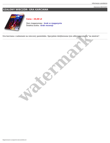 Informacje o produkcie Utworzono 08-03-2017 SZALONY WIECZÓR- GRA KARCIANA Cena : 20,00 zł Stan magazynowy : brak w magazynie Średnia ocena : brak recenzji w at er m ar k Gra karciana z zadaniami na wieczory panieńskie. Specjalnie dedykowana tym odbywającym się "na mieście". Wygenerowano w programie www.oscGold.com