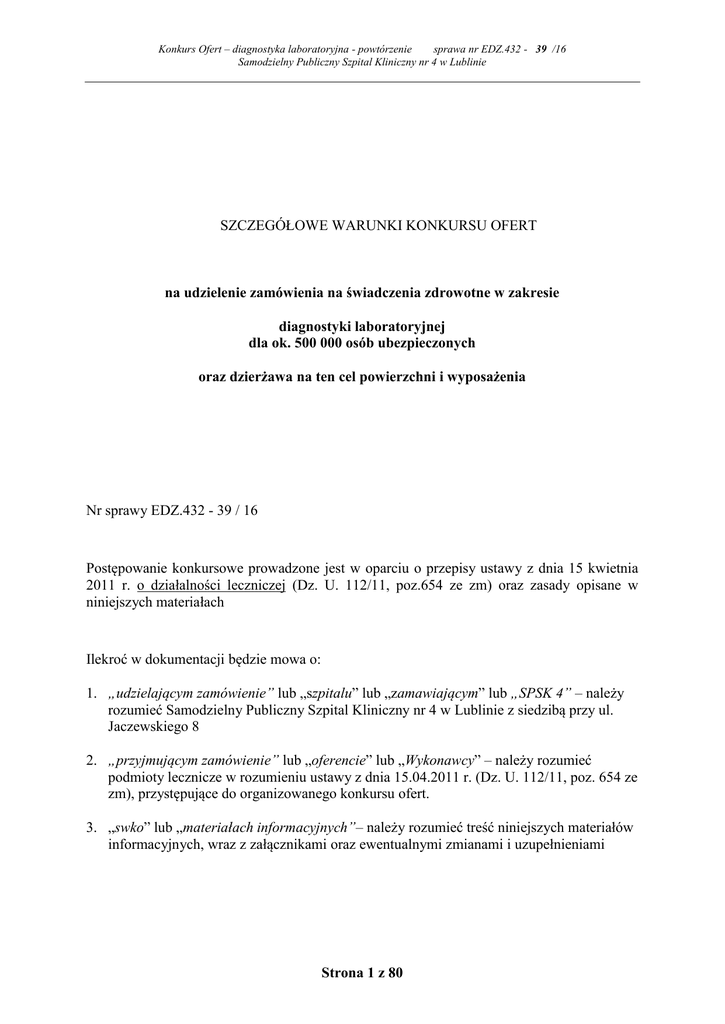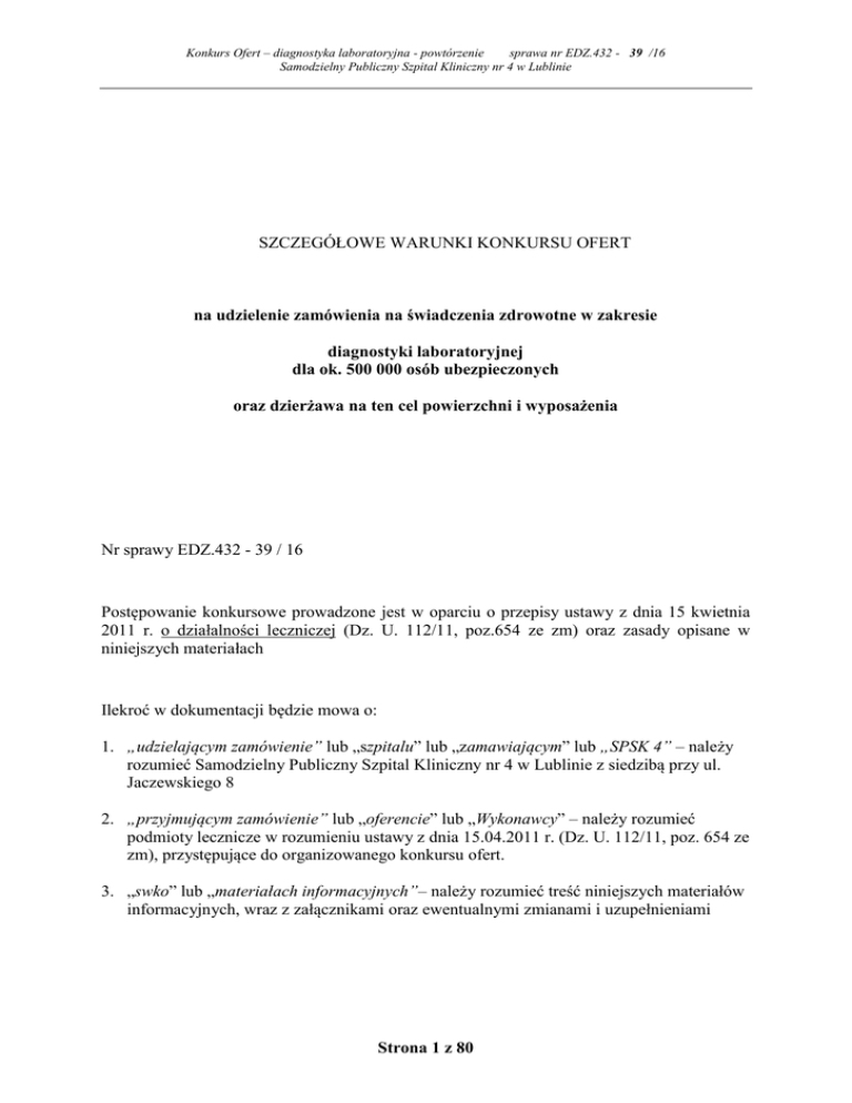 Konkurs Ofert – diagnostyka laboratoryjna - powtórzenie sprawa nr EDZ.432 - 39 /16 Samodzielny Publiczny Szpital Kliniczny nr 4 w Lublinie SZCZEGÓŁOWE WARUNKI KONKURSU OFERT na udzielenie zamówienia na świadczenia zdrowotne w zakresie diagnostyki laboratoryjnej dla ok. 500 000 osób ubezpieczonych oraz dzierżawa na ten cel powierzchni i wyposażenia Nr sprawy EDZ.432 - 39 / 16 Postępowanie konkursowe prowadzone jest w oparciu o przepisy ustawy z dnia 15 kwietnia 2011 r. o działalności leczniczej (Dz. U. 112/11, poz.654 ze zm) oraz zasady opisane w niniejszych materiałach Ilekroć w dokumentacji będzie mowa o: 1. „udzielającym zamówienie” lub „szpitalu” lub „zamawiającym” lub „SPSK 4” – należy rozumieć Samodzielny Publiczny Szpital Kliniczny nr 4 w Lublinie z siedzibą przy ul. Jaczewskiego 8 2. „przyjmującym zamówienie” lub „oferencie” lub „Wykonawcy” – należy rozumieć podmioty lecznicze w rozumieniu ustawy z dnia 15.04.2011 r. (Dz. U. 112/11, poz. 654 ze zm), przystępujące do organizowanego konkursu ofert. 3. „swko” lub „materiałach informacyjnych”– należy rozumieć treść niniejszych materiałów informacyjnych, wraz z załącznikami oraz ewentualnymi zmianami i uzupełnieniami Strona 1 z 80 Konkurs Ofert – diagnostyka laboratoryjna - powtórzenie sprawa nr EDZ.432 - 39 /16 Samodzielny Publiczny Szpital Kliniczny nr 4 w Lublinie Przedmiot konkursu ofert obejmuje: a) udzielanie świadczeń z zakresu badań laboratoryjnych i mikrobiologicznych na rzecz Udzielającego zamówienie na zasadach określonych w niniejszych materiałach informacyjnych. b) dzierżawę pomieszczeń i fakultatywną dzierżawę urządzeń od Udzielającego zamówienie z przeznaczeniem na wykonywanie zadań objętych udzielonym zamówieniem. Kod CPV: 85145000-7 usługi świadczone przez laboratoria medyczne Opis szczegółowych warunków jakie powinni spełniać Przyjmujący zamówienie wraz z warunkami określającymi przygotowanie oferty konkursowej w zakresie diagnostyki laboratoryjnej na rzecz Samodzielnego Publicznego Szpitala Klinicznego nr 4 w Lublinie. I. Do konkursu ofert może przystąpić podmiot – przyjmujący zamówienie, który: 1. jest uprawniony do występowania w obrocie prawnym zgodnie z wymaganiami ustawowymi i jest zarejestrowany we właściwych rejestrach, 2. jest uprawniony do wykonywania laboratoryjnych badań diagnostycznych, w tym wymienionych szczegółowo w formularzu oferty, 3. znajduje się w sytuacji finansowej zapewniającej wykonanie zamówienia, przez co rozumie się, iż posiada środki w banku w wysokości nie mniejszej niż 1,5 mln PLN lub zdolność kredytową nie mniejszą niż 1,5 mln PLN 4. zatrudnia odpowiednią do wielkości laboratorium liczbę odpowiednio wykształconych osób, przez co rozumie się, iż: a) kierownik laboratorium posiada specjalizację z diagnostyki laboratoryjnej b) zatrudnia co najmniej 6 diagnostów laboratoryjnych, posiadających II stopień z diagnostyki laboratoryjnej lub specjalizację równorzędną c) zatrudnia co najmniej 1 specjalistę II stopnia laboratoryjnej hematologii medycznej lub ze specjalizacją równorzędną, który będzie udzialał świadczeń w siedzibie Zamawiającego przez co najmniej 7 godzin w każdy dzień roboczy od poniedziałku do piątku d) zatrudnia dodatkowo co najmniej 10 diagnostów laboratoryjnych 5. nie zalega w płaceniu składek na ubezpieczenie społeczne, 6. nie zalega w płaceniu podatków i opłat publiczno - prawnych, 7. nie był skazany prawomocnym wyrokiem za popełnione przestępstwo w związku z postępowaniem o udzielenia zamówienia publicznego, przestępstwo przeciwko prawom osób wykonujących pracę zarobkową, przestępstwi przeciwko środowisku, przestępstwo przekupstwa, przestępstwo przeciwko obrotowi gospodarczemu lub inne przestępstwo popełnione w celu osiągnięcia korzyści majątkowych, a także za przestępstwo skarbowe lub przestępstwo udziału w zorganizowanej grupie albo związku mających na celu popełnienie przestępstwa lub przestępstwa skarbowego tj. jeśli podmiotem jest: a) b) c) d) e) osoba fizyczna - w odniesieniu do tej osoby, spółka jawna - w odniesieniu do wspólników, spółka partnerska - w odniesieniu do partnerów lub członków zarządu, spółka komandytowa lub komandytowo akcyjna - w odniesieniu do których komplementariuszy, osoba prawna - w odniesieniu do urzędujących członków organu zarządzającego:, 8. jeśli podmiotem jest spółka prawa handlowego - nie orzeczono sądownie w stosunku do Strona 2 z 80 Konkurs Ofert – diagnostyka laboratoryjna - powtórzenie sprawa nr EDZ.432 - 39 /16 Samodzielny Publiczny Szpital Kliniczny nr 4 w Lublinie niej zakazu ubiegania się o zamówienia, na podstawie przepisów o odpowiedzialności podmiotów zbiorowych za czyny zabronione pod groźbą kary 9. posiada wiedzę i doświadczenie odpowiednie do realizacji kontraktowanych świadczeń; Zamawiający uzna spełnienie tego warunku udziału w postępowaniu, jeśli Oferent wykonał w okresie ostatnich czterech lat przed upływem terminu składania ofert, a jeżeli okres prowadzenia działalności jest krótszy – w tym okresie - co najmniej trzy zamówienia, z których każde spełnia łącznie poniższe elementy: 1..jedno z zamówień referencyjnych to zamówienie realizowane co najmniej przez trzy lata i dotyczyło prowadzenia diagnostycznego laboratorium medycznego w wieloprofilowym (min. 10 oddziałów specjalistycznych) szpitalu, który posiadał w okresie realizacji kontraktu nie mniej niż 600 łóżek 2.. drugie i trzecie z zamówień referencyjnych to zamówienia realizowane co najmniej przez trzy lata i dotyczyło prowadzenia diagnostycznego laboratorium medycznego w wieloprofilowym (min. 10 oddziałów specjalistycznych) szpitalu uniwersyteckim (tj. prowadzącym zadania dydaktyczne wynikające ze statutu tej jednostki w powiązaniu z udzielaniem świadczeń zdrowotnych [np. zamówieni