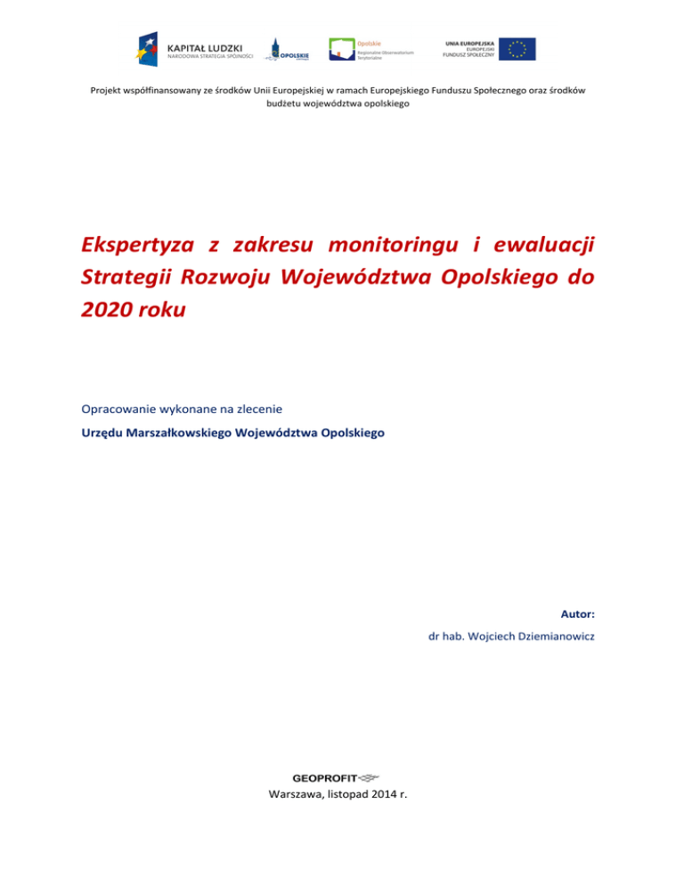 Projekt współfinansowany ze środków Unii Europejskiej w ramach Europejskiego Funduszu Społecznego oraz środków budżetu województwa opolskiego Ekspertyza z zakresu monitoringu i ewaluacji Strategii Rozwoju Województwa Opolskiego do 2020 roku Opracowanie wykonane na zlecenie Urzędu Marszałkowskiego Województwa Opolskiego Autor: dr hab. Wojciech Dziemianowicz Warszawa, listopad 2014 r. Spis treści: WPROWADZENIE ............................................................................................................................................. 3 1. OGÓLNE UWAGI NA TEMAT ZAŁOŻEŃ MONITORINGU I EWALUACJI ZAPREZENTOWANYCH W STRATEGII WOJEWÓDZKIEJ ............................................................................................................................................... 3 2. WSKAŹNIKI MONITOROWANIA STRATEGII .............................................................................................. 4 3. POZYSKIWANIE DANYCH PRZEZ OPOLSKIE OBSERWATORIUM TERYTORIALNE ........................................ 8 4. NARZĘDZIA MONITORINGU ................................................................................................................... 11 5. W KIERUNKU LEPSZYCH BADAŃ ............................................................................................................. 13 6. ZAKOŃCZENIE ........................................................................................................................................ 19 ZAŁĄCZNIK ..................................................................................................................................................... 20 Używane skróty: Skrót B+R GUS IOB JST NGO OCRG OOT OSI PKB PUP RDOŚ RPO WO RSI SRWO UMWO Rozwinięcie Badania i rozwój Główny Urząd Statystyczny Instytucje otoczenia biznesu Jednostka samorządu terytorialnego Organizacje pozarządowe (ang. Non-Governmental Organisations) Opolskie Centrum Rozwoju Gospodarczego Opolskie Obserwatorium Terytorialne Obszar strategicznej interwencji Produkt Krajowy Brutto Powiatowy Urząd Pracy Regionalna Dyrekcja Ochrony Środowiska w Opolu Regionalny Program Operacyjny Województwa Opolskiego na lata 2014-2020 Regionalna Strategia Innowacji Strategia Rozwoju Województwa Opolskiego do 2020 r. Urząd Marszałkowski Województwa Opolskiego Strona 2 WPROWADZENIE Ekspertyza przygotowana została w układzie zaproponowanym w umowie, tj. koncentruje się na następujących zagadnieniach: • propozycje uzupełnienia/modyfikacji wskaźników oraz źródeł i częstotliwości pozyskiwania danych (w szczególności weryfikujących oddziaływanie SRWO, w tym postęp we wdrażaniu); • sposoby (w tym procedury monitorowania) umożliwiające terminowe dostarczenie odpowiedniego zakresu danych m.in. na użytek Opolskiego Obserwatorium Terytorialnego; • praktyczne rekomendacje w zakresie narzędzi do przeprowadzenia monitoringu wśród interesariuszy SRWO (w zakresie postępów z realizacji SRWO); • propozycje ewaluacji, badań, analiz i ekspertyz, które powinny być zrealizowane pod kątem SRWO m.in. na użytek OOP (zawierające temat i zakres ich realizacji wraz z uzasadnieniem, metody przewidziane do zastosowania wraz z danymi źródłowymi, harmonogram ich realizacji oraz wymagany budżet). Za podstawę uwag przyjąłem dokument Strategii Rozwoju Województwa Opolskiego do 2020 roku, uchwalony przez Sejmik Województwa Opolskiego w 2012 roku (posługiwałem się wersją książkową). W dokumencie tym szczegółowo opisano system realizacji Strategii (rozdz. 5), w którym podrozdział 5.6. dotyczy stricte monitoringu i ewaluacji. Bardzo ważny jest fakt, że opis każdego z dziesięciu celów strategicznych kończy się zestawem wskaźników, które następnie umieszczono w wersji zbiorczej w załączniku do Strategii nr 4 – uwaga, w mojej wersji publikacji brakuje w załączniku celów 8-10, ale wskaźniki do tych celów są w tekście zasadniczym). Wstępnie założyłem, że ew. sugestie zmian powinny dotyczyć kluczowych kwestii, gdyż ich wprowadzenie wymagać będzie odrębnej uchwały sejmiku. Wszystkie zaproponowane w ekspertyzie rozwiązania wynikają z subiektywnej oceny i własnego doświadczenia, nabytego we współpracy z kilkoma województwami w Polsce. Oczywiście moje sugestie mają charakter jedynie doradczy, a ich przydatność powinna zostać oceniona w momencie podjęcia decyzji o budowie systemu monitorowania Strategii. 1. OGÓLNE UWAGI NA TEMAT ZAŁOŻEŃ MONITORINGU I EWALUACJI ZAPREZENTOWANYCH W STRATEGII WOJEWÓDZKIEJ Omawiany rozdział Strategii zawiera obietnicę „zbudowania zintegrowanego procesu monitorowania i ewaluacji Strategii” co należy ocenić jako wymagające zobowiązanie, a jednocześnie przejaw dojrzałości współtwórców dokumentu. Planowany system ma charakteryzować się: • przemyślaną konstrukcją; • odwołaniem do zasad, które trudno podważyć: o integralność procesów monitorowania i ewaluacji różnych poziomów; Strona 3 o obiektywność realizacji Strategii i polityk w kontekście wiarygodnych faktów, danych i ekonomiczno-społecznych teorii naukowych; o komplementarność działań monitoringowych i ewaluacyjnych; o upowszechnienie wyników badań szerokiemu gronu odbiorców; o partnerstwo i współuczestnictwo; • nakreśleniem przejrzystego schematu instytucjonalnego monitoringu i ewaluacji, w którym bardzo dużo miejsca poświęcono opisowi zadań Opolskiego Obserwatorium Terytorialnego; • zobrazowaniem relacji między monitoringiem i ewaluacją w kontekście produktowym. Propozycja 1. Zróżnicowanie między monitoringiem a ewaluacją Częściowo zapisy Strategii są jednak nieco dyskusyjne, ale nie na tyle, by oczekiwać zmian dokumentu. Proponuję natomiast w dalszych pracach OOT zmodyfikować nieco schemat 12. ze Strategii. Uważam, że „ewaluacja” w Polsce przyjęła się w kontekście „dużych” ewaluacji, czyli głównie ex 