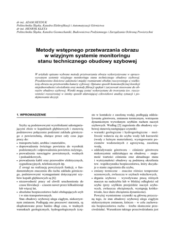 dr inż. ADAM HEYDUK Politechnika Śląska, Katedra Elektryfikacji i Automatyzacji Górnictwa dr inż. HENRYK KLETA Politechnika Śląska, Katedra Geomechaniki, Budownictwa Podziemnego i Zarządzania Ochroną Powierzchni Metody wstępnego przetwarzania obrazu w wizyjnym systemie monitoringu stanu technicznego obudowy szybowej W artykule opisano wybrane metody przetwarzania obrazu wykorzystywane w opracowywanym systemie wizyjnego monitoringu stanu technicznego obudowy szybowej. Przedstawiono ilościowe zależności między rozmiarami obiektu rzeczywistego a wielkością obrazu na przetworniku kamery cyfrowej. Opisano sposób homomorficznej korekcji niejednorodności oświetlenia oraz metody filtracji spękań i zarysowań stosowane do obrazów obudowy szybowej. Wyniki mogą zostać wykorzystane do tworzenia tzw. rzeczywistości rozszerzonej w istotny sposób ułatwiającej człowiekowi analizę sytuacji i podejmowanie decyzji. 1. WPROWADZENIE Szyby są podstawowymi wyrobiskami udostępniającymi złoże w kopalniach głębinowych i stanowią podstawowe połączenie podziemi zakładu górniczego z powierzchnią, służące przez cały czas jego pracy do: transportu ludzi, urobku i materiałów, doprowadzenia świeżego powietrza do wyrobisk podziemnych i odprowadzenia powietrza zużytego, prowadzenia rurociągów powietrznych, wodnych i podsadzkowych, prowadzenia kabli oraz przewodów elektrycznych, sygnalizacyjnych, telefonicznych itp. Z uwagi na realizację powyższych funkcji, o fundamentalnym znaczeniu dla ruchu zakładu górniczego, podstawowymi wymaganiami dotyczącymi szybów kopalń głębinowych są [6]: niezawodność pracy od chwili uruchomienia do czasu likwidacji – czasem nawet przez kilkadziesiąt lub więcej lat, absolutne bezpieczeństwo ludzi obsługujących szyb i w nim transportowanych. Stan obudowy szybowej ulega ciągłym, niekorzystnym zmianom. Podlegają one procesowi starzenia, są eksploatowane przez bardzo długi czas, w trudnych warunkach geologicznych, hydrogeologicznych (czę- sto w kontakcie z zasoloną wodą), podlegają oddziaływaniu górotworu, zmianom termicznym, wstrząsom dynamicznym wywołanym szybkim ruchem naczyń szybowych. Według [2] zagrożenia dla obudowy szybowej stanowią następujące czynniki: warunki geologiczne i hydrogeologiczne – możliwość wdarcia się do szybu wody lub kurzawki (wody z luźnym materiałem), występowanie poziomów wodonośnych z agresywną, zasoloną wodą, oddziaływanie górotworu – ciśnienie górotworu niekorzystnie oddziałujące na obudowę – znajomość wartości ciśnienia oraz aktualnego stanu i wytrzymałości obudowy są podstawą określenia tzw. współczynnika bezpieczeństwa, który decyduje o stanie zagrożenia dla szybu, zmiany termiczne – znaczne różnice temperatur sezonowych, zwłaszcza w szybach wdechowych, drgania szybowe – wywoływane pracą różnych maszyn na nadszybiu lub w bliskiej odległości od szybu (przy szybkim przejeździe naczyń szybowych, zwłaszcza obciążonych, występują krótkotrwałe, lecz duże obciążenia dynamiczne). Powyżej wymienione czynniki są główną przyczyną tego, że stan obudowy szybowej ulega ciągłym niekorzystnym zmianom, którym – w celu zachowania bezpieczeństwa ruchu – trzeba skutecznie przeciwdziałać. Warunkiem takiego przeciwdziałania jest Nr 10(488) PAŹDZIERNIK 2011 41 Rys. 1. Schemat układu optycznego i oznaczenia parametrów decydujących o wielkości obrazu obiektu rzeczywistego odpowiednio wczesne wykrycie symptomów narastających uszkodzeń, określenie fragmentów obudowy podlegających największym wytężeniom i podjęcie odpowiednich środków zaradczych. W przypadku, gdy szyb pełni funkcję, np. studni głębinowej w obszarach zlikwidowanych kopalń lub zły stan obudowy szybu uniemożliwia użycie wyciągu rewizyjnego, o stanie obudowy można wnioskować jedynie na podstawie oceny obrazu – filmu uzyskanego z rejestracji za pomocą kamer opuszczonych do szybu. W tym przypadku ocena stanu technicznego i bezpieczeństwa szybu jest oceną subiektywną, zależną praktycznie od percepcji i doświadczenia osoby oceniającej taki materiał. W tych warunkach ocena stanu obudowy szybu może być wykonana za pomocą metody komputerowego przetwarzania i cyfrowej analizy obrazu powierzchni obmurza szybowego, uwzględniającej rozkład i obraz uszkodzeń obudowy wraz z numeryczną identyfikacją stanu wytężenia obudowy szybu. Zastosowanie metod komputerowego przetwarzania i analizy obrazu w celu identyfikacji uszkodzeń obudowy szybu jest celowe, z uwagi na następujące czynniki [4, 5]: ograniczone możliwości percepcyjne człowieka przy analizie długich sekwencji obrazów, automatyzację porównywania filmów zarejestrowanych w dłuższych odstępach czasu, możliwość sformułowania obiektywnych ilościowych kryteriów oceny stanu obmurza na podstawie informacji wizyjnej, niezbyt dużą czytelność obrazu związaną z zapyleniem i zawartością pary wodnej w powietrzu. 2. ZALEŻNOŚCI MIĘDZY ROZMIARAMI OBIEKTÓW I ICH OBRAZÓW A PARAMETRAMI UKŁADU OPTYCZNEGO Ilość informacji obrazowej, zawartej w jednej ramce, zależy od rozdzielczości przetwornika kamery oraz od wymaganego poziomu detekcji szczegółów (np. minimalna szerokość wykrywanego zarysowania). Te czynniki decydują o doborze ogniskowej obiektywu (a zatem i o kącie widzenia kamery – czyli również o liczbie ramek niezbędnych do oceny całej analizowanej powierzchni obmurza szybowego). Podstawowym warunkiem efektywnego zastosowania metod fotogrametrycznych w diagnostyce stanu technicznego jest możliwość odwzorowania rzeczywistych wymiarów obiektów na podstawie wymiarów ich obrazów. Odwzorowanie to uzależnione jest od wielu czynników: położenia obserwowanego obiektu, parametrów układu optycznego (obiektywu), rozmiarów i rozdzielczości przetwornika (matrycy CCD) kamery. Schematycznie przedstawiono to na rysunku 1. Opisując upros