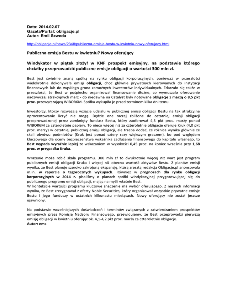 Data: 2014.02.07 Gazeta/Portal: obligacje.pl Autor: Emil Szweda http://obligacje.pl/news/2348/publiczna-emisja-bestu-w-kwietniu-nowy-oferujacy.html Publiczna emisja Bestu w kwietniu? Nowy oferujący Windykator w piątek złożył w KNF prospekt emisyjny, na podstawie którego chciałby przeprowadzić publiczne emisje obligacji o wartości 300 mln zł. Best jest świetnie znaną spółką na rynku obligacji korporacyjnych, ponieważ w przeszłości wielokrotnie dokonywała emisji obligacji, choć głównie prywatnych kierowanych do instytucji finansowych lub do wąskiego grona zamożnych inwestorów indywidualnych. Zdarzało się także w przeszłości, że Best w pośpiechu organizował finansowanie dłużne, co wymuszało oferowanie nadzwyczaj atrakcyjnych marż - do niedawna na Catalyst były notowane obligacje z marżą o 8,5 pkt proc. przewyższającą WIBOR6M. Spółka wykupiła je przed terminem kilka dni temu. Inwestorzy, którzy rozważają wzięcie udziału w publicznej emisji obligacji Bestu na tak atrakcyjne oprocentowanie liczyć nie mogą. Będzie one raczej zbliżone do ostatniej emisji obligacji przeprowadzonej przez zamknięty fundusz Bestu, który zaoferował 4,3 pkt proc. marży ponad WIBOR6M za czteroletnie papiery. To nieco więcej niż za czteroletnie obligacje oferuje Kruk (4,0 pkt proc. marży) w ostatniej publicznej emisji obligacji, ale trzeba dodać, że różnica wynika głównie ze skali obydwu podmiotów (Kruk jest ponad cztery razy większym graczem), bo pod względem kluczowego dla oceny bezpieczeństwa wskaźnika zadłużenia finansowego do kapitału własnego, to Best wypada wyraźnie lepiej ze wskazaniem w wysokości 0,45 proc. na koniec września przy 1,68 proc. w przypadku Kruka. Wrażenie może robić skala programu. 300 mln zł to dwukrotnie więcej niż wart jest program publicznych emisji obligacji Kruka i więcej niż obecna wartość aktywów Bestu. Z planów emisji wynika, że Best planuje szeroko zakrojoną ekspansję, którą zresztą redakcja Obligacje.pl anonsowała m.in. w raporcie o tegorocznych wykupach. Również w prognozach dla rynku obligacji korporacyjnych w 2014 r. pisaliśmy o planach spółki windykacyjnej przygotowującej się do publicznego programu emisji obligacji, mając na myśli właśnie Best. W kontekście wartości programu kluczowe znaczenie ma wybór oferującego. Z naszych informacji wynika, że Best zrezygnował z oferty Noble Securities, który organizował wszystkie prywatne emisje Bestu i jego funduszy w ostatnich kilkunastu miesiącach. Nowy oferujący nie został jeszcze ujawniony. Na podstawie wcześniejszych doświadczeń i terminów związanych z zatwierdzaniem prospektów emisyjnych przez Komisję Nadzoru Finansowego, przewidujemy, że Best przeprowadzi pierwszą emisję obligacji w kwietniu oferując ok. 4,1-4,2 pkt proc. marży za czteroletnie obligacje. Autor: ems