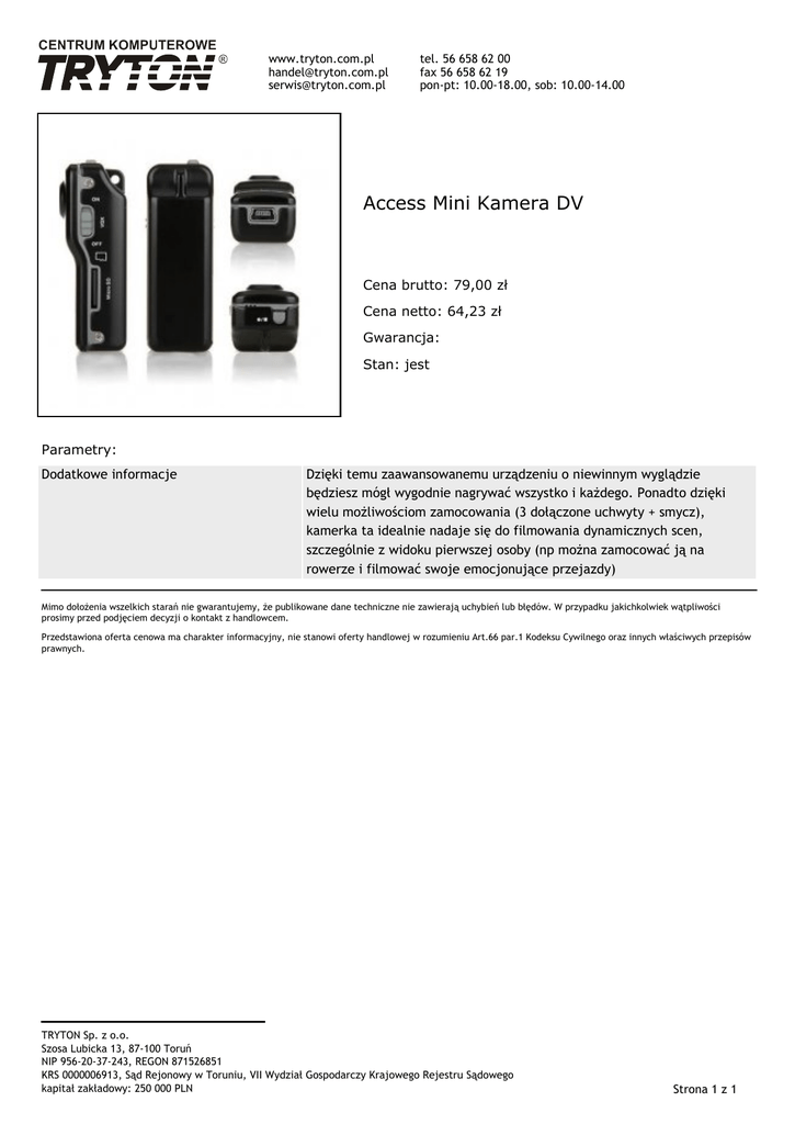 www.tryton.com.pl [email protected] [email protected] tel. 56 658 62 00 fax 56 658 62 19 pon-pt: 10.00-18.00, sob: 10.00-14.00 Access Mini Kamera DV Cena brutto: 79,00 zł Cena netto: 64,23 zł Gwarancja: Stan: jest Parametry: Dodatkowe informacje Dzięki temu zaawansowanemu urządzeniu o niewinnym wyglądzie będziesz mógł wygodnie nagrywać wszystko i każdego. Ponadto dzięki wielu możliwościom zamocowania (3 dołączone uchwyty + smycz), kamerka ta idealnie nadaje się do filmowania dynamicznych scen, szczególnie z widoku pierwszej osoby (np można zamocować ją na rowerze i filmować swoje emocjonujące przejazdy) Mimo dołożenia wszelkich starań nie gwarantujemy, że publikowane dane techniczne nie zawierają uchybień lub błędów. W przypadku jakichkolwiek wątpliwości prosimy przed podjęciem decyzji o kontakt z handlowcem. Przedstawiona oferta cenowa ma charakter informacyjny, nie stanowi oferty handlowej w rozumieniu Art.66 par.1 Kodeksu Cywilnego oraz innych właściwych przepisów prawnych. TRYTON Sp. z o.o. Szosa Lubicka 13, 87-100 Toruń NIP 956-20-37-243, REGON 871526851 KRS 0000006913, Sąd Rejonowy w Toruniu, VII Wydział Gospodarczy Krajowego Rejestru Sądowego kapitał zakładowy: 250 000 PLN Strona 1 z 1
