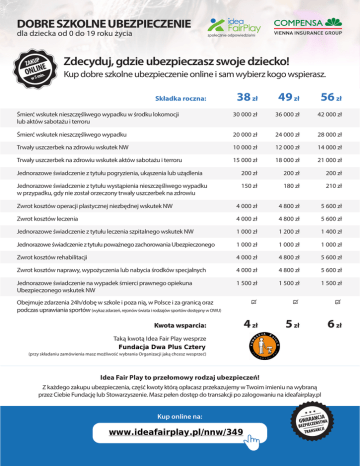 DOBRE SZKOLNE UBEZPIECZENIE dla dziecka od 0 do 19 roku życia Zdecyduj, gdzie ubezpieczasz swoje dziecko! Kup dobre szkolne ubezpieczenie online i sam wybierz kogo wspierasz. 38 zł 49 zł 56 zł Śmierć wskutek nieszczęśliwego wypadku w środku lokomocji lub aktów sabotażu i terroru 30 000 zł 36 000 zł 42 000 zł Śmierć wskutek nieszczęśliwego wypadku 20 000 zł 24 000 zł 28 000 zł Trwały uszczerbek na zdrowiu wskutek NW 10 000 zł 12 000 zł 14 000 zł Trwały uszczerbek na zdrowiu wskutek aktów sabotażu i terroru 15 000 zł 18 000 zł 21 000 zł Jednorazowe świadczenie z tytułu pogryzienia, ukąszenia lub użądlenia 200 zł 200 zł 200 zł Jednorazowe świadczenie z tytułu wystąpienia nieszczęśliwego wypadku w przypadku, gdy nie został orzeczony trwały uszczerbek na zdrowiu 150 zł 180 zł 210 zł Zwrot kosztów operacji plastycznej niezbędnej wskutek NW 4 000 zł 4 800 zł 5 600 zł Zwrot kosztów leczenia 4 000 zł 4 800 zł 5 600 zł Jednorazowe świadczenie z tytułu leczenia szpitalnego wskutek NW 1 000 zł 1 200 zł 1 400 zł Jednorazowe świadczenie z tytułu poważnego zachorowania Ubezpieczonego 1 000 zł 1 000 zł 1 000 zł Zwrot kosztów rehabilitacji 4 000 zł 4 800 zł 5 600 zł Zwrot kosztów naprawy, wypożyczenia lub nabycia środków specjalnych 4 000 zł 4 800 zł 5 600 zł Jednorazowe świadczenie na wypadek śmierci prawnego opiekuna Ubezpieczonego wskutek NW 1 500 zł 1 500 zł 1 500 zł 4 zł 5 zł 6 zł Składka roczna: Obejmuje zdarzenia 24h/dobę w szkole i poza nią, w Polsce i za granicą oraz podczas uprawiania sportów (wykaz zdarzeń, rejonów świata i rodzajów sportów dostępny w OWU) Kwota wsparcia: Taką kwotą Idea Fair Play wesprze Fundacja Dwa Plus Cztery (przy składaniu zamówienia masz możliwość wybrania Organizacji jaką chcesz wesprzeć) Idea Fair Play to przełomowy rodzaj ubezpieczeń! Z każdego zakupu ubezpieczenia, część kwoty którą opłacasz przekazujemy w Twoim imieniu na wybraną przez Ciebie Fundację lub Stowarzyszenie. Masz pełen dostęp do transakcji po zalogowaniu na ideafairplay.pl Kup online na: www.ideafairplay.pl/nnw/349