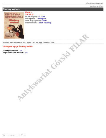 Informacje o wydawnictwie Utworzono 08-03-2017 Ślubny welon. Cena : 28,35 zł LA R Nr katalogowy : 37843 Dostępność : Dostępny Stan magazynowy : niski Średnia ocena : brak recenzji Warszawa 1997. Wydawnictwo ANTA. wyd.1. s.292. opr. oryg. kartonowa. 21 cm. FI Dostępne opcje Ślubny welon. An ty k w ar ia t G ór sk i Zweryfikowane: Tak. Wydawnictwo zwarte: Tak. Wygenerowano w programie www.oscGold.com