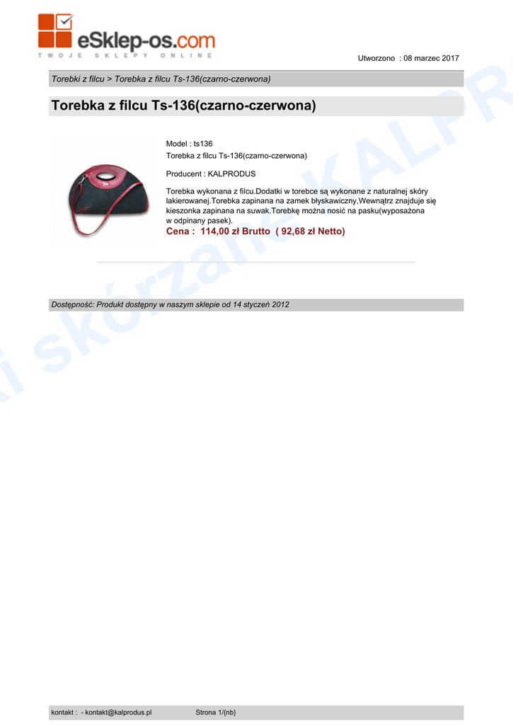 i k Utworzono : 08 marzec 2017 R P Torebki z filcu > Torebka z filcu Ts-136(czarno-czerwona) Torebka z filcu Ts-136(czarno-czerwona) Model : ts136 Torebka z filcu Ts-136(czarno-czerwona) K e Producent : KALPRODUS L A Torebka wykonana z filcu.Dodatki w torebce są wykonane z naturalnej skóry lakierowanej.Torebka zapinana na zamek błyskawiczny,Wewnątrz znajduje się kieszonka zapinana na suwak.Torebkę można nosić na pasku(wyposażona w odpinany pasek). n a Cena : 114,00 zł Brutto ( 92,68 zł Netto) z r ó k s Dostępność: Produkt dostępny w naszym sklepie od 14 styczeń 2012 kontakt : - [email protected] Strona 1/{nb}