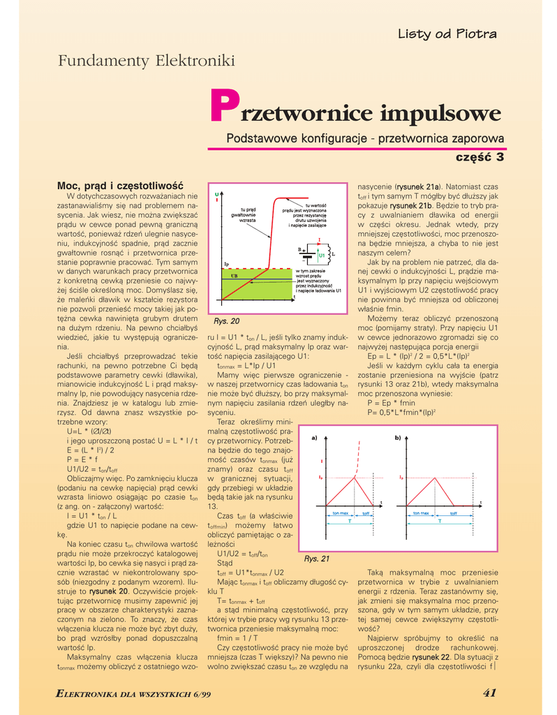 Listy od Piotra Fundamenty Elektroniki Przetwornice impulsowe Podstawowe konfiguracje − przetwornica zaporowa część 3 Moc, prąd i częstotliwość W dotychczasowych rozważaniach nie zastanawialiśmy się nad problemem na− sycenia. Jak wiesz, nie można zwiększać prądu w cewce ponad pewną graniczną wartość, ponieważ rdzeń ulegnie nasyce− niu, indukcyjność spadnie, prąd zacznie gwałtownie rosnąć i przetwornica prze− stanie poprawnie pracować. Tym samym w danych warunkach pracy przetwornica z konkretną cewką przeniesie co najwy− żej ściśle określoną moc. Domyślasz się, że maleńki dławik w kształcie rezystora nie pozwoli przenieść mocy takiej jak po− tężna cewka nawinięta grubym drutem na dużym rdzeniu. Na pewno chciałbyś wiedzieć, jakie tu występują ogranicze− nia. Jeśli chciałbyś przeprowadzać tekie rachunki, na pewno potrzebne Ci będą podstawowe parametry cewki (dławika), mianowicie indukcyjność L i prąd maksy− malny Ip, nie powodujący nasycenia rdze− nia. Znajdziesz je w katalogu lub zmie− rzysz. Od dawna znasz wszystkie po− trzebne wzory: U=L * (∆I/∆t) i jego uproszczoną postać U = L * I / t E = (L * I2) / 2 P=E*f U1/U2 = ton/toff Obliczajmy więc. Po zamknięciu klucza (podaniu na cewkę napięcia) prąd cewki wzrasta liniowo osiągając po czasie ton (z ang. on − załączony) wartość: I = U1 * ton / L gdzie U1 to napięcie podane na cew− kę. Na koniec czasu ton chwilowa wartość prądu nie może przekroczyć katalogowej wartości Ip, bo cewka się nasyci i prąd za− cznie wzrastać w niekontrolowany spo− sób (niezgodny z podanym wzorem). Ilu− struje to rysunek 20. Oczywiście projek− tując przetwornicę musimy zapewnić jej pracę w obszarze charakterystyki zazna− czonym na zielono. To znaczy, że czas włączenia klucza nie może być zbyt duży, bo prąd wzrósłby ponad dopuszczalną wartość Ip. Maksymalny czas włączenia klucza tonmax możemy obliczyć z ostatniego wzo− Rys. 20 ru I = U1 * ton / L, jeśli tylko znamy induk− cyjność L, prąd maksymalny Ip oraz war− tość napięcia zasilającego U1: tonmax = L*Ip / U1 Mamy więc pierwsze ograniczenie − w naszej przetwornicy czas ładowania ton nie może być dłuższy, bo przy maksymal− nym napięciu zasilania rdzeń uległby na− syceniu. Teraz określimy mini− malną częstotliwość pra− cy przetwornicy. Potrzeb− na będzie do tego znajo− mość czasów tonmax (już znamy) oraz czasu toff w granicznej sytuacji, gdy przebiegi w układzie będą takie jak na rysunku 13. Czas toff (a właściwie toffmin) możemy łatwo obliczyć pamiętając o za− leżności U1/U2 = toff/ton Rys. 21 Stąd toff = U1*tonmax / U2 Mając tonmax i toff obliczamy długość cy− klu T T= tonmax + toff a stąd minimalną częstotliwość, przy której w trybie pracy wg rysunku 13 prze− twornica przeniesie maksymalną moc: fmin = 1 / T Czy częstotliwość pracy nie może być mniejsza (czas T większy)? Na pewno nie wolno zwiększać czasu ton ze względu na ELEKTRONIKA DLA WSZYSTKICH 6/99 nasycenie (rrysunek 21a). Natomiast czas toff i tym samym T mógłby być dłuższy jak pokazuje rysunek 21b. Będzie to tryb pra− cy z uwalnianiem dławika od energii w części okresu. Jednak wtedy, przy mniejszej częstotliwości, moc przenoszo− na będzie mniejsza, a chyba to nie jest naszym celem? Jak by na problem nie patrzeć, dla da− nej cewki o indukcyjności L, prądzie ma− ksymalnym Ip przy napięciu wejściowym U1 i wyjściowym U2 częstotliwość pracy nie powinna być mniejsza od obliczonej właśnie fmin. Możemy teraz obliczyć przenoszoną moc (pomijamy straty). Przy napięciu U1 w cewce jednorazowo zgromadzi się co najwyżej następująca porcja energii Ep = L * (Ip)2 / 2 = 0,5*L*(Ip)2 Jeśli w każdym cyklu cała ta energia zostanie przeniesiona na wyjście (patrz rysunki 13 oraz 21b), wtedy maksymalna moc przenoszona wyniesie: P = Ep * fmin P= 0,5*L*fmin*(Ip)2 Taką maksymalną moc przeniesie przetwornica w trybie z uwalnianiem energii z rdzenia. Teraz zastanówmy się, jak zmieni się maksymalna moc przeno− szona, gdy w tym samym układzie, przy tej samej cewce zwiększymy częstotli− wość? Najpierw spróbujmy to określić na uproszczonej drodze rachunkowej. Pomocą będzie rysunek 22. Dla sytuacji z rysunku 22a, czyli dla częstotliwości fΩ 41 Listy od Piotra jednorazowo gromadzona porcja energii to: E=0,5 * L*lp2 a moc przenoszona to: P = 0,5 * L * fmin * lp2 Na rysunku 22b zobaczysz przykłado− we przebiegi przy częstotliwości pracy dwukrotnie większej niż na rysunku 22a. Obliczmy, jaka porcja energii jest prze− kazywana w każdym cyklu na wyjście. Nie możemy podstawić do wzoru przyro− stu ∆I, tylko musimy odjąć wartości ener− gii na końcu i początku czasu ton (albo toff): ∆E = Ep – Ea = 0,5*L*(Ip)2 − 0,5*L*(Ip/2)2 = 0,5*L* (Ip2 – 0,25Ip2) = 0,5*L* 0,75Ip2 = 0,375*L*Ip2 Porcja energii jest teraz mniejsza, ale ponieważ częstotliwość jest dwukrotnie większa (2fmin), więc w sumie przenoszo− na moc jest znacząco większa i wynosi: P2 = 0,75*L*fmin*Ip2 Rysunek 22c pokazuje przebieg prądu przy dziesięciokrotnym zwiększeniu czę− stotliwości (10fmin). Obliczamy najpierw porcję energii przekazywaną w każdym cyklu: ∆E = Ep – Eb = 0,5*L*(Ip)2 − 0,5*L*(0,9Ip)2 = 0,5*L* (Ip2 – 0,81Ip2) = 0,5*L* 0,19Ip2 = 0,095*L*Ip2 Potem moc dla częstotliwości 10fΩ: P10 = ∆E*10fmin = 0,95*L*fmin*Ip2 to jest prawie dwa razy więcej niż dla częstotliwości fmin! Jeśli dla danej cew− ki moc maksymalną przy częstotliwości fmin przyjmiemy jako 100%, samo zwiększanie częstotliwości pozwoli (teo− retycznie) uzyskać następujące moce: f = 2fmin: P2 =150% f = 3fmin: P3 =166% f = 5fmin: P5 =170% f = 10fmin: P10 =190% f = 100fmin P100 =199% Co prawda przebiegi pokazane na rysunku 22 dotyczą jednego przypadku, gdy U1=U2, ton=toff, jednak generalny wniosek jest s