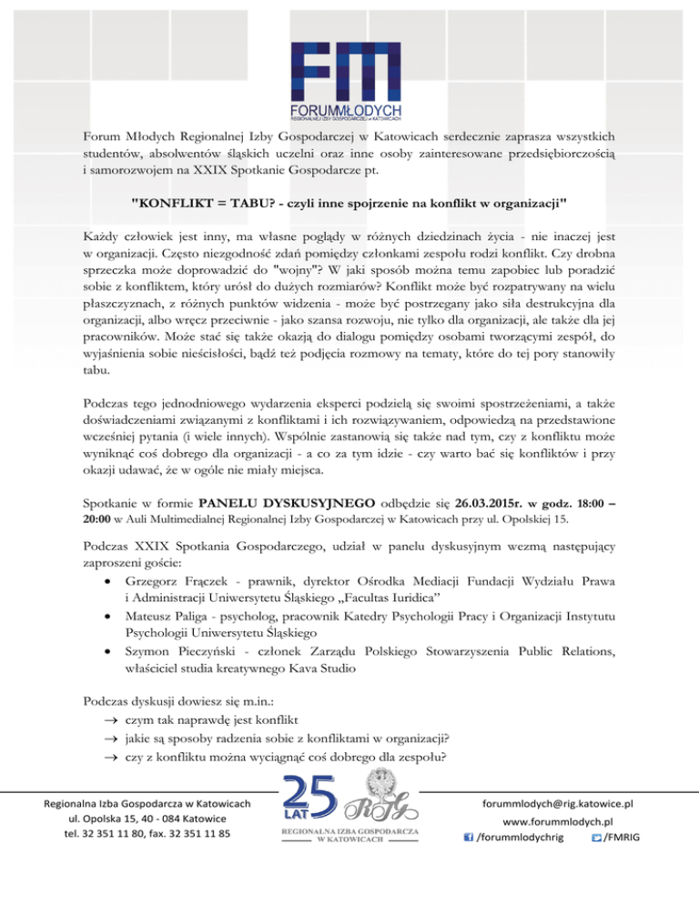 Forum Młodych Regionalnej Izby Gospodarczej w Katowicach serdecznie zaprasza wszystkich studentów, absolwentów śląskich uczelni oraz inne osoby zainteresowane przedsiębiorczością i samorozwojem na XXIX Spotkanie Gospodarcze pt. "KONFLIKT = TABU? - czyli inne spojrzenie na konflikt w organizacji" Każdy człowiek jest inny, ma własne poglądy w różnych dziedzinach życia - nie inaczej jest w organizacji. Często niezgodność zdań pomiędzy członkami zespołu rodzi konflikt. Czy drobna sprzeczka może doprowadzić do "wojny"? W jaki sposób można temu zapobiec lub poradzić sobie z konfliktem, który urósł do dużych rozmiarów? Konflikt może być rozpatrywany na wielu płaszczyznach, z różnych punktów widzenia - może być postrzegany jako siła destrukcyjna dla organizacji, albo wręcz przeciwnie - jako szansa rozwoju, nie tylko dla organizacji, ale także dla jej pracowników. Może stać się także okazją do dialogu pomiędzy osobami tworzącymi zespół, do wyjaśnienia sobie nieścisłości, bądź też podjęcia rozmowy na tematy, które do tej pory stanowiły tabu. Podczas tego jednodniowego wydarzenia eksperci podzielą się swoimi spostrzeżeniami, a także doświadczeniami związanymi z konfliktami i ich rozwiązywaniem, odpowiedzą na przedstawione wcześniej pytania (i wiele innych). Wspólnie zastanowią się także nad tym, czy z konfliktu może wyniknąć coś dobrego dla organizacji - a co za tym idzie - czy warto bać się konfliktów i przy okazji udawać, że w ogóle nie miały miejsca. Spotkanie w formie PANELU DYSKUSYJNEGO odbędzie się 26.03.2015r. w godz. 18:00 – 20:00 w Auli Multimedialnej Regionalnej Izby Gospodarczej w Katowicach przy ul. Opolskiej 15. Podczas XXIX Spotkania Gospodarczego, udział w panelu dyskusyjnym wezmą następujący zaproszeni goście: Grzegorz Frączek - prawnik, dyrektor Ośrodka Mediacji Fundacji Wydziału Prawa i Administracji Uniwersytetu Śląskiego „Facultas Iuridica” Mateusz Paliga - psycholog, pracownik Katedry Psychologii Pracy i Organizacji Instytutu Psychologii Uniwersytetu Śląskiego Szymon Pieczyński - członek Zarządu Polskiego Stowarzyszenia Public Relations, właściciel studia kreatywnego Kava Studio Podczas dyskusji dowiesz się m.in.: czym tak naprawdę jest konflikt jakie są sposoby radzenia sobie z konfliktami w organizacji? czy z konfliktu można wyciągnąć coś dobrego dla zespołu? Regionalna Izba Gospodarcza w Katowicach ul. Opolska 15, 40 - 084 Katowice tel. 32 351 11 80, fax. 32 351 11 85 [email protected] www.forummlodych.pl /forummlodychrig /FMRIG dlaczego niekiedy trudno się rozmawia o przyczynach niezgody między ludźmi? czy osoba "konfliktowa" może znaleźć swoje miejsce w zespole? WIĘCEJ INFORMACJI: https://www.facebook.com/events/1629639433936190/ REJESTRACJA: Rejestracja odbywa się poprzez link: http://bit.ly/XXIX_SG Zgłoszenia prosimy przesyłać do 25.03.2015r. do godz. 23:00. Decyduje kolejność zgłoszeń – lista uczestników zostanie zamknięta wcześniej w przypadku wyczerpania wolnych miejsc! Dodatkowe informacje i szczegóły Spotkania Gospodarczego dostępne są u koordynatora projektu: Paulina Mol tel. kom.: +48 663 607 015 e-mail: [email protected] * * * Spotkania Gospodarcze odbywają się cyklicznie w formie warsztatów, konferencji i seminariów. Skierowane są do młodych ludzi, którzy są zainteresowani tematyką przedsiębiorczości. Dzięki praktycznym poradom zapraszanych gości, którzy są związani ze światem biznesu i gospodarki, Forum Młodych RIG pragnie wskazać studentom drogę do kariery i prowadzić ich na ścieżkę sukcesu zawodowego. Spotkania Gospodarcze są zaplanowane w cyklu comiesięcznych konferencji w całym roku akademickim 2014/2015. Regionalna Izba Gospodarcza w Katowicach ul. Opolska 15, 40 - 084 Katowice tel. 32 351 11 80, fax. 32 351 11 85 [email protected] www.forummlodych.pl /forummlodychrig /FMRIG