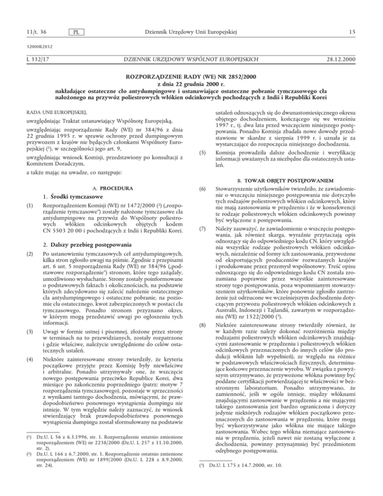 11/t. 36 Dziennik Urzędowy Unii Europejskiej PL 15 32000R2852 L 332/17 DZIENNIK URZĘDOWY WSPÓLNOT EUROPEJSKICH 28.12.2000 ROZPORZĄDZENIE RADY (WE) NR 2852/2000 z dnia 22 grudnia 2000 r. nakładające ostateczne cło antydumpingowe i ustanawiające ostateczne pobranie tymczasowego cła nałożonego na przywóz poliestrowych włókien odcinkowych pochodzących z Indii i Republiki Korei RADA UNII EUROPEJSKIEJ, uwzględniając Traktat ustanawiający Wspólnotę Europejską, uwzględniając rozporządzenie Rady (WE) nr 384/96 z dnia 22 grudnia 1995 r. w sprawie ochrony przed dumpingowym przywozem z krajów nie będących członkami Wspólnoty Europejskiej (1), w szczególności jego art. 9, uwzględniając wniosek Komisji, przedstawiony po konsultacji z Komitetem Doradczym, (5) ustaleń odnoszących się do dwunastomiesięcznego okresu objętego dochodzeniem, kończącego się we wrześniu 1997 r., tj. dwa lata przed wszczęciem niniejszego postępowania. Ponadto Komisja zbadała nowe dowody przedstawione w skardze z sierpnia 1999 r. i uznała je za wystarczające do rozpoczęcia niniejszego dochodzenia. Komisja prowadziła dalsze dochodzenie i weryfikację informacji uważanych za niezbędne dla ostatecznych ustaleń. a także mając na uwadze, co następuje: B. TOWAR OBJĘTY POSTĘPOWANIEM A. PROCEDURA (6) 1. Środki tymczasowe (1) Rozporządzeniem Komisji (WE) nr 1472/2000 (2) („rozporządzenie tymczasowe”) zostały nałożone tymczasowe cła antydumpingowe na przywóz do Wspólnoty poliestrowych włókien odcinkowych objętych kodem CN 5503 20 00 i pochodzących z Indii i Republiki Korei. (7) 2. Dalszy przebieg postępowania (2) Po ustanowieniu tymczasowych ceł antydumpingowych, kilka stron zgłosiło uwagi na piśmie. Zgodnie z przepisami art. 6 ust. 5 rozporządzenia Rady (WE) nr 384/96 („podstawowe rozporządzenie”) stronom, które tego zażądały, umożliwiono wysłuchanie. Strony zostały poinformowane o podstawowych faktach i okolicznościach, na podstawie których zdecydowano się zalecić nałożenie ostatecznego cła antydumpingowego i ostateczne pobranie, na poziomie cła ostatecznego, kwot zabezpieczonych w postaci cła tymczasowego. Ponadto stronom przyznano okres, w którym mogą przedstawić uwagi po ogłoszeniu tych informacji. (3) Uwagi w formie ustnej i pisemnej, złożone przez strony w terminach na to przewidzianych, zostały rozpatrzone i gdzie właściwe, należycie uwzględnione do celów ostatecznych ustaleń. (4) Niektóre zainteresowane strony twierdziły, że kryteria początkowe przyjęte przez Komisję były niewłaściwe i arbitralne. Ponadto utrzymywały one, że wszczęcie nowego postępowania przeciwko Republice Korei, dwa miesiące po zakończeniu poprzedniego (patrz: motyw 7 rozporządzenia tymczasowego), pozostaje w sprzeczności z wynikami tamtego dochodzenia, mówiącymi, że prawdopodobieństwo ponownego wystąpienia dumpingu nie istnieje. W tym względzie należy zaznaczyć, że wniosek stwierdzający brak prawdopodobieństwa ponownego wystąpienia dumpingu został sformułowany na podstawie (1) Dz.U. L 56 z 6.3.1996, str. 1. Rozporządzenie ostatnio zmienione rozporządzeniem (WE) nr 2238/2000 (Dz.U. L 257 z 11.10.2000, str. 2). (2) Dz.U. L 166 z 6.7.2000, str. 1. Rozporządzenie ostatnio zmienione rozporządzeniem (WE) nr 1899/2000 (Dz.U. L 228 z 8.9.2000, str. 24). (8) Stowarzyszenie użytkowników twierdziło, że zawiadomienie o wszczęciu niniejszego postępowania nie dotyczyło tych rodzajów poliestrowych włókien odcinkowych, które nie mają zastosowania w przędzeniu i że w konsekwencji te rodzaje poliestrowych włókien odcinkowych powinny być wyłączone z postępowania. Należy zauważyć, że zawiadomienie o wszczęciu postępowania, jak również skarga, wyraźnie przytaczają opis odnoszący się do odpowiedniego kodu CN, który uwzględnia wszystkie rodzaje poliestrowych włókien odcinkowych, niezależnie od formy ich zastosowania, przywożone od eksportujących producentów rozważanych krajów i produkowane przez przemysł wspólnotowy. Treść opisu odnoszącego się do odpowiedniego kodu CN została zrozumiana poprawnie przez wszystkie zainteresowane strony tego postępowania, poza wspomnianym stowarzyszeniem użytkowników, które ponownie zgłosiło zastrzeżenie już odrzucone we wcześniejszym dochodzeniu dotyczącym przywozu poliestrowych włókien odcinkowych z Australii, Indonezji i Tajlandii, zawartym w rozporządzeniu (WE) nr 1522/2000 (3). Niektóre zainteresowane strony twierdziły również, że w każdym razie należy dokonać rozróżnienia między rodzajami poliestrowych włókien odcinkowych znajdującymi zastosowanie w przędzeniu i poliestrowych włókien odcinkowych przeznaczonych do innych celów (do produkcji włóknin lub wypełnień), ze względu na różnice w podstawowych właściwościach fizycznych, determinujące końcowe przeznaczenie wyrobu. W związku z powyższym utrzymywano, że przywożone włókna powinny być poddane certyfikacji potwierdzającej te właściwości w bezstronnym laboratorium. Ponadto utrzymywano, że zamienność, jeśli w ogóle istnieje, między włóknami znajdującymi zastosowanie w przędzeniu a nie mającymi takiego zastosowania jest bardzo ograniczona i dotyczy jedynie niektórych rodzajów włókien początkowo przeznaczonych do zastosowania w przędzeniu, które mogą być wykorzystywane jako włókna nie mające takiego zastosowania. Wobec tego włókna niemające zastosowania w przędzeniu, jeżeli nawet nie zostaną wyłączone z dochodzenia, powinny przynajmniej być przedmiotem odrębnego postępowania. (3) Dz.U. L 175 z 14.7.2000, str. 10. 16 (9) (10) Dziennik Urzędowy Unii Europejskiej PL W przypadku wykorzystania towaru objętego postępowaniem, stwierdzono istotny poziom pokrywania się, zamienności i konkurencji między różnymi rodzajami poliestrowych włókien odcinkowych. Dochodzenie wykazało, że nie istnieje wyraźna granica podzia