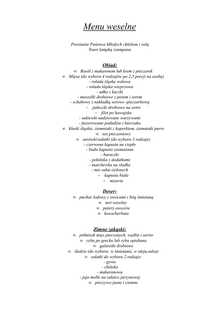 Menu weselne Powitanie Państwa Młodych chlebem i solą Toast lampką szampana Obiad: • • • Rosół z makaronem lub krem z pieczarek Mięsa (do wyboru 4 rodzajów po 2,5 porcji na osobę) - rolada śląska wołowa - rolada śląska wieprzowa - udka z kaczki - muszelki drobiowe z porem i serem - schabowy z nakładką serowo -pieczarkową − pałeczki drobiowe na ostro − filet po hawajsku - sakiewki nadziewane warzywami - faszerowane podudzia z kurczaka kluski śląskie, ziemniaki z koperkiem, ziemniaki purre • sos pieczeniowy • surówki/sałatki (do wyboru 3 rodzaje) - czerwona kapusta na ciepło - biała kapusta zasmażana - buraczki - pekińska z dodatkami - marchewka na słodko - mix sałat zielonych − kapusta biała − mizeria • • • Deser: puchar lodowy z owocami i bitą śmietaną • tort weselny • patery owoców • kawa/herbata Zimne zakąski: półmisek mięs pieczonych, wędlin i serów • ryba po grecku lub ryba opiekana • galaretki drobiowe śledzie (do wyboru: w śmietanie, w oleju,salsa) • sałatki do wyboru 2 rodzaje: - gyros - chińska - makaronowa - jaja molle na sałatce jarzynowej • pieczywo jasne i ciemne • • Kolacja I: mięsa (do wyboru 3 rodzaje po 1,5 porcji na osobę) - szaszłyk drobiowy - cordon blue - grillowana pierś z kurczaka -stek z karkówki w sosie własnym − kotlet de volaille − udko z kurczaka nadziewane • frytki lub ryż z warzywami bukiet warzyw, surówka z sałaty lodowej lub pekińskiej Kolacja II Udziec pieczony z ziemniaczkami i kapustą serwowany przez Szefa Kuchni Kolacja III: do wyboru 2 rodzaje: • barszcz z krokietem • bogracz • flaki • bigos • żurek z jajkiem Woda, soki, – bez ograniczeń Napoje gazowane- według zużycia Cena menu: 190zł/ osobę ( z poprawinami) Dodatkowo oferujemy: Stół Wiejski- 6zł/os. Na Państwa życzenie istnieje możliwość skomponowania i skalkulowania Menu według własnego pomysłu (po konsultacji z Szefem Kuchni).