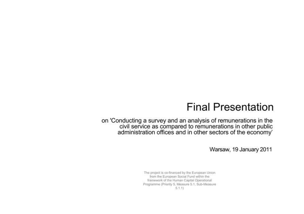 Final Presentation on 'Conducting a survey and an analysis of remunerations in the civil service as compared to remunerations in other public administration offices and in other sectors of the economy’ Warsaw, 19 January 2011 The project is co-financed by the European Union from the European Social Fund within the framework of the Human Capital Operational Programme (Priority 5, Measure 5.1, Sub-Measure 5.1.1) This is the Final Report for the project called 'Conducting a survey and an analysis of remuneration in the civil service as compared to remuneration in other public administration offices and in other sectors of the economy’ delivered following a commission by the Chancellery of the Prime Minister under the agreement No DSC/166/10 ID 112/DSC/10; financed from the project budget ‘Job evaluation and changes in the remuneration system of the government administration’, co-financed the European Union from the European Social Fund within the framework of the Human Capital Operational Programme (Priority 5, Measure 5.1, Sub-Measure 5.1.1); a source of valuable information on developing remuneration policy in the civil service; 1587 pages (including 1520 pages of statistical data for 29 functional regions and 57 areas of employment) it presents results of statistical analysis of data on both financial remuneration (i.e. total salary, base salary, regular supplements, bonuses and awards and other components of financial remuneration) and non-financial remuneration (additional allowances not included in the salary and training expenses) — received by employees on selected positions in the civil service, in other offices of public administration and in private sector of the economy; the following entities were covered by the survey: 62 — non-business entities (organisations being a part of the civil service and other organisations of the public administration) 31 — business entities (companies); the project presents results for 91 positions; the list of organisations included in the survey was consulted with and accepted by representatives of the Chancellery of the Prime Minister Copyright by HRM partners S.A. |2 Project Schedule Schedule of conducting a survey and an analysis of remunerations in the civil service as compared to remunerations in other public administration offices and other sectors of the economy The project’s duration Stage 1 – drawing up a list of positions and entities Stage 2 – Final Report’s Structure Stage 3 – Database Stage 4 – Sourcing data, conducting a comparative analysis Stage 5 – Survey close-out Final Report Approval Final Presentation Stages/actions completed [cze] = Jun Copyright by HRM partners S.A. [lip] = Jul [sie] = Aug [wrz] = Sep [paź] = Oct [lis] = Nov [gru] = Dec |3 Methodology applied MANAGEMENT SPECIALISTS SUPPORT According to the adopted methodology, the positions were divided into: M5 General M4 Integrating P5 Experienced Expert M3 Senior P4 Expert M2 Linear M1 Supervising P3 Independent T4 Leading P2 Junior T3 Experienced P1 Novice T2 Junior T1 Novice MANAGERIAL POSITIONS DIRECTORS/MANAGERS Copyright by SPECIALIST POSITIONS SUPPORT POSITIONS INDEPENDENT AND SUPPORT POSITIONS HRM partners S.A. Managerial, where employees achieve goals through managing people and assets they were entrusted with (listed in the M table, which includes five levels of competence labelled from M1 to M5) Independent, where employees are assessed on the basis of individual work results: Specialist (listed in the P table, which includes five levels of competence labelled from P1 to P5); Support (listed in T table — with four levels of competence, labelled from T1 to T4) In the civil service: managerial positions — these include senior positions in the civil service and middle management positions; they can also include coordinating positions, if they are a part of the managing level in an organisation specialist positions — these include coordinating, independent or specialist positions within the civil service support positions — these include support positions in the civil service. |4 Sample data 93 organisations: 48 civil service organisations 14 organisations from other sectors of public administration 31 business entities 38,364 employees 9,581 employed in the civil service 3,359 employed in other sectors of public administration 25,424 employed in business entities Copyright by HRM partners S.A. |5 Organisations included in the survey 1. ABB 2. Agora 3. ArcelorMittal Poland 4. National Archive in Poznań 5. National Archive in Warsaw 6. Bank Gospodarki Żywnościowej 7. Bank Pekao 8. BRE Bank 9. Budimex 10. Head Office of the National Health Fund (NFZ) 11. Dalkia 12. Energomontaż-Północ 13. Ernst & Young 14. Fiat Auto Poland 15. Generali Group 16. General Directorate of National Roads and Motorways (GDDKiA) 17. Chief Inspectorate for Environmental Protection 18. Chief Veterinary Inspectorate in Warsaw 19. Central Office of Measures 20. Central Statistical Office (GUS) 21. PZU Group 22. Hellmann 23. Hewitt Associates 24. Hewlett-Packard 25. ING Financial Services Copyright by HRM partners S.A. 26. Inter Cars 27. Tax Chamber in Gdańsk 28. Tax Chamber in Katowice 29. Tax Chamber in Poznań 30. Tax Chamber in Warsaw 31. Chancellery of the Senate 32. Regional Police Headquarters in Gdańsk 33. Regional Police Headquarters in Cracow 34. Kompania Piwowarska 35. Łódź Voivodeship Office 36. Office of the Marshal for Małopolska 37. Małopolskie Voivodeship Office 38. Masovian Voivodeship Office 39. Ministry of Finance 40. Ministry of Economy 41. Ministry of Agriculture and Rural Development 42. Ministry of the Interior and Administration 43. Ministry of Justice 44. Nestlé Polska 45. National Health Fund Branch in Katowice 46. Nowa Era 47. Regional Office of Measures in Gdańsk 48. Regional Office of Measures in Katowice 49. Orange 50. PHOENIX Pharma Polska |6 Organisations included in the survey 51. The First Tax Office in Gdynia 