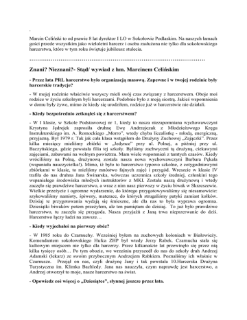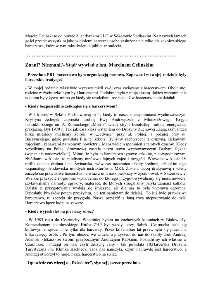 . Marcin Celiński to od prawie 8 lat dyrektor I LO w Sokołowie Podlaskim. Na naszych łamach gości przede wszystkim jako wieloletni harcerz i osoba zasłużona nie tylko dla sokołowskiego harcerstwa, które w tym roku świętuje jubileusz stulecia. ………………………………………………………………………………. Znani? Nieznani?- Stąd/ wywiad z hm. Marcinem Celińskim - Przez lata PRL harcerstwo było organizacją masową. Zapewne i w twojej rodzinie były harcerskie tradycje? - W mojej rodzinie właściwie wszyscy mieli swój czas związany z harcerstwem. Oboje moi rodzice w życiu szkolnym byli harcerzami. Podobnie było z moją siostrą. Jakieś wspomnienia w domu były żywe, mimo że kiedy się urodziłem, rodzice już w harcerstwie nie działali. - Kiedy bezpośrednio zetknąłeś się z harcerstwem? - W I klasie, w Szkole Podstawowej nr 1, kiedy to nasza niezapomniana wychowawczyni Krystyna Jędrejek zaprosiła druhnę Ewę Andrzejczuk z Młodzieżowego Kręgu Instruktorskiego im. A. Romockiego „Morro”, wtedy chyba licealistkę - młodą, energiczną, przyjazną. Był 1979 r. Tak jak cała klasa wstąpiłem do Drużyny Zuchowej „Zajączki”. Przez kilka miesięcy mieliśmy zbiórki w „Jedynce” przy ul. Polnej, a później przy ul. Baczyńskiego, gdzie powstała filia tej szkoły. Byliśmy zachwyceni tą drużyną, ciekawymi zajęciami, zabawami na wolnym powietrzu. Mam wiele wspomnień z tamtych czasów. Kiedy wróciliśmy na Polną, drużynową została nasza nowa wychowawczyni Barbara Pękała (wspaniała nauczycielka!). Mimo, iż było to harcerstwo typowo szkolne, z cotygodniowymi zbiórkami w klasie, to mieliśmy mnóstwo fajnych zajęć i przygód. Wreszcie w klasie IV trafiła do nas druhna Jana Świnarska, wówczas uczennica szkoły średniej, członkini tego wspaniałego środowiska młodych instruktorów z MKI. Została naszą drużynową i wtedy zaczęło się prawdziwe harcerstwo, a wraz z nim nasz pierwszy w życiu biwak w Skrzeszewie. Wielkie przeżycie i ogromne wydarzenie, do którego przygotowywaliśmy się niesamowicie: szykowaliśmy namioty, śpiwory, materace, do których strugaliśmy patyki zamiast kołków. Dzisiaj te przygotowania wydają się śmieszne, ale dla nas to była wyprawa ogromna. Dziesiątki biwaków potem przeżyłem, ale ten pamiętam do dzisiaj. To już było prawdziwe harcerstwo, tu zaczęła się przygoda. Nasza przyjaźń z Janą trwa nieprzerwanie do dziś. Harcerstwo łączy ludzi na zawsze… - Kiedy wyjechałeś na pierwszy obóz? - W 1985 roku do Czarnuchy. Wcześniej byłem na zuchowych koloniach w Białowieży. Komendantem sokołowskiego Hufca ZHP był wtedy Jerzy Rabek. Czarnucha stała się kultowym miejscem nie tylko dla harcerzy. Przez kilkanaście lat przewinęło się przez nią kilka tysięcy osób… Po tym obozie, we wrześniu przyszedł do nas do szkoły druh Andrzej Adamski (lekarz) ze swoim przybocznym Andrzejem Rabkiem. Poznaliśmy ich właśnie w Czarnusze. Przejął on nas, czyli drużynę Jany i tak powstała 10.Harcerska Drużyna Turystyczna im. Klimka Bachledy. Jana nas nauczyła, czym naprawdę jest harcerstwo, a Andrzej otworzył to moje, nasze harcerstwo na świat. - Opowiedz coś więcej o „Dziesiątce”, słynnej jeszcze przez lata. - Działaliśmy już wtedy przy Domu Harcerza. Mój zastęp nazywał się „Niedźwiedzie”. Pamiętam niezwykłe zbiórki, które prowadził Andrzej Adamski, szczególnie te nad starą, wojskową mapa Tatr: klęczeliśmy nad nią na podłodze, a nasz drużynowy opowiadał i wędrował palcem po szlakach, a my z nim... Andrzej Adamski to postać charyzmatyczna, miłośnik Tatr, turysta z krwi i kości. To wszystko zaszczepił nam, młodym chłopakom. Gdy po raz pierwszy wyjechaliśmy w Tatry, to była dla nas wyprawa życia! W „Dziesiątce” poznaliśmy też harcerstwo ogólnopolskie: słynny Harcerski Rajd Świętokrzyski, wielkie zloty, potem była pierwsza Polowa Zbiórka Harcerzy Starszych we Fromborku… Weszliśmy w harcerstwo po uszy. - Czy drużyna przetrwała przejście harcerzy do szkół średnich? - W zdecydowanej większości harcerze „Dziesiątki” kontynuowali naukę w LO w Sokołowie, ja uczęszczałem do szkoły w Siedlcach, jeszcze inni w Węgrowie. Drużyna nie tylko istniała nadal, ale z każdym rokiem była naprawdę coraz mocniejsza. W 1989 r. zdobyliśmy „Proporzec Komendanta Hufca” – wyróżnienie dla najlepszej hufcowej drużyny!… Po wyjeździe z Sokołowa Andrzeja Adamskiego drużynowym został Andrzej Rabek, po nim Melania Bujak. Ja byłem przybocznym. A kiedy Melka poszła na studia medyczne, w 1990 r. zostałem drużynowym. Nieco wcześniej, jako siedemnastolatek, po złożeniu zobowiązania instruktorskiego, założyłem swą własną drużynę w Szkole Podstawowej Nr 3. Wtedy szczepową tam była Danuta Zadrożna. Wielu z nas działając w starszoharcerskiej „Dziesiątce”, zakładało swoje drużyny harcerskie lub zuchowe. Kiedy zostałem drużynowym 10 HDT, swoją drużynę z „Trójki” włączyłem w jej skład. Mieliśmy już wtedy swoją własną harcówkę w Domu Harcerza! W tym czasie -można powiedzieć - zaczął się mój drugi etap w harcerskim życiu – byłem instruktorem, drużynowym. Przyboczną została wtedy wspaniała harcerka Kasia Malinowska (dziś Rudnicka). Tworzyliśmy wtedy niezły „tandem”, a nasza drużyna zaczęła organizować samodzielne obozy w Karkonoszach, na Dolnym Śląsku, Jurze Wieluńskiej, w Tatrach. Jednocześnie obowiązkowo co roku był obóz w Czarnusze! Uczestniczyliśmy we wszystkich najważniejszych przedsięwzięciach harcerskich w Polsce, na czele z Harcerskim Rajdem Świętokrzyskim i Polową Zbiórką Harcerstwa Starszego... Gdy harcerze zaczęli dorastać, zakładali swoje zastępy, więc drużyna rozrastała się. W 1995 r. na Światowym Zlocie Harcerstwa Polskiego w Zegrzu, gdzie reprezentowaliśmy Chorągiew Siedlecką ZHP, zde