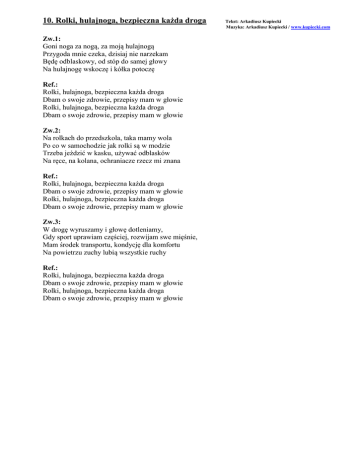 10. Rolki, hulajnoga, bezpieczna każda droga Zw.1: Goni noga za nogą, za moją hulajnogą Przygoda mnie czeka, dzisiaj nie narzekam Będę odblaskowy, od stóp do samej głowy Na hulajnogę wskoczę i kółka potoczę Ref.: Rolki, hulajnoga, bezpieczna każda droga Dbam o swoje zdrowie, przepisy mam w głowie Rolki, hulajnoga, bezpieczna każda droga Dbam o swoje zdrowie, przepisy mam w głowie Zw.2: Na rolkach do przedszkola, taka mamy wola Po co w samochodzie jak rolki są w modzie Trzeba jeździć w kasku, używać odblasków Na ręce, na kolana, ochraniacze rzecz mi znana Ref.: Rolki, hulajnoga, bezpieczna każda droga Dbam o swoje zdrowie, przepisy mam w głowie Rolki, hulajnoga, bezpieczna każda droga Dbam o swoje zdrowie, przepisy mam w głowie Zw.3: W drogę wyruszamy i głowę dotleniamy, Gdy sport uprawiam częściej, rozwijam swe mięśnie, Mam środek transportu, kondycję dla komfortu Na powietrzu zuchy lubią wszystkie ruchy Ref.: Rolki, hulajnoga, bezpieczna każda droga Dbam o swoje zdrowie, przepisy mam w głowie Rolki, hulajnoga, bezpieczna każda droga Dbam o swoje zdrowie, przepisy mam w głowie Tekst: Arkadiusz Kupiecki Muzyka: Arkadiusz Kupiecki / www.kupiecki.com