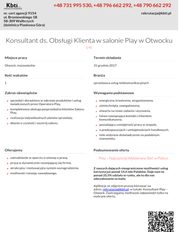 +48 731 995 530, +48 796 662 292, +48 790 662 292 nr. cert agencji 9154 ul. Broniewskiego 1B 58-309 Wałbrzych (dzielnica Piaskowa Góra) [email protected] Konsultant ds. Obsługi Klienta w salonie Play w Otwocku (/4) Miejsce pracy Termin składania Otwock, mazowieckie 31 grudnia 2017 Ilość wakatów Branża 1 sprzedawca usług telekomunikacyjnych Zakres obowiązków Wymagania podstawowe sprzedaż i doradztwo w zakresie produktów i usług świadczonych przez Operatora Play, energiczna, kreatywna, zorganizowana, uśmiechnięta, zaangażowana, kompleksowa obsługa posprzedażna klientów Salonu Play, otwarta na nowe zadania i wyzwania, realizacja indywidualnych planów sprzedaży, łatwo nawiązująca kontakt z klientem, komunikatywna, dbanie o czystość i wystrój salonu. posiadająca umiejętność pracy w zespole, o predyspozycjach i umiejętnościach handlowych, mile widziane doświadczenie na podobnym stanowisku. Oferujemy zatrudnienie w oparciu o umowę o pracę, Podsumowanie oferty Play – Najczęściej Wybierana Sieć w Polsce pracę w dynamicznie rozwijającej się firmie, atrakcyjny i motywacyjny system wynagrodzenia, możliwość rozwoju zawodowego. Z naszych dających nieograniczone możliwości usług korzysta już ponad 14,4 mln Polaków. Daje nam to ponad 25,5% udziału w rynku, ale to dla nas zdecydowanie za mało. Aplikacje ze zdjęciem proszę kierować na adres: [email protected], w tytule: Konsultant Play – Otwock. Zastrzegamy możliwość odpowiedzi tylko na wybrane oferty. +48 731 995 530, +48 796 662 292, +48 790 662 292 nr. cert agencji 9154 ul. Broniewskiego 1B 58-309 Wałbrzych (dzielnica Piaskowa Góra) [email protected]