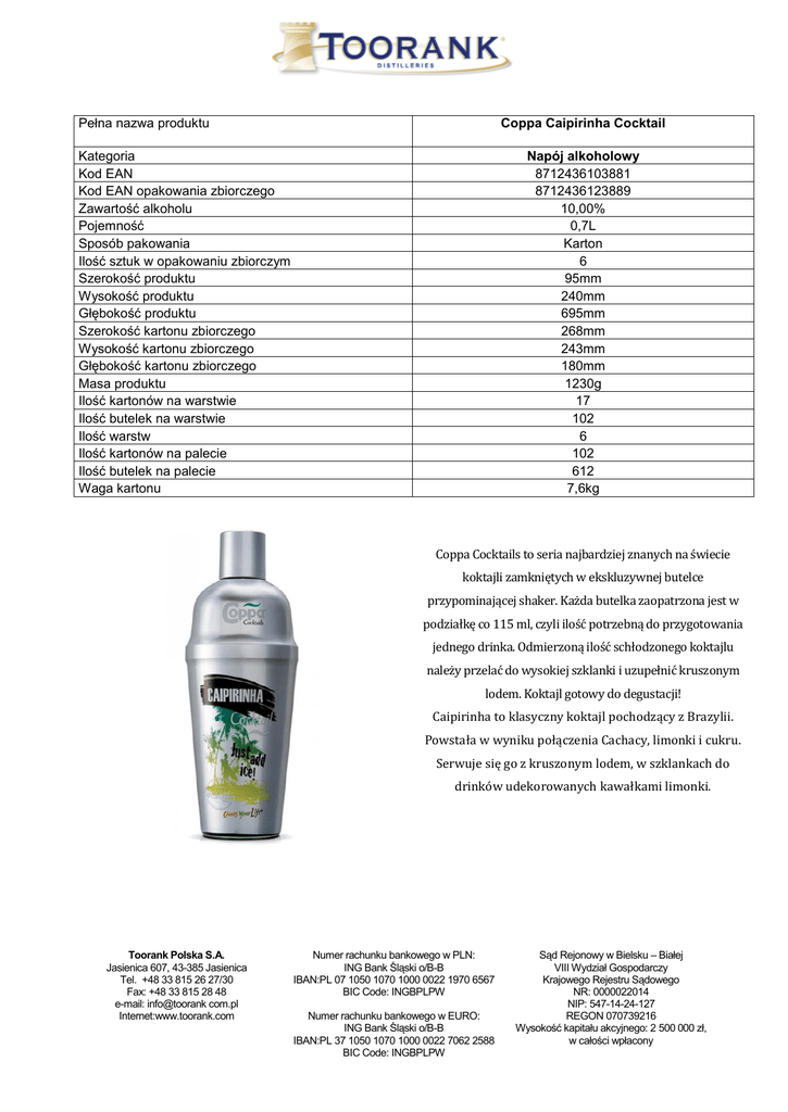 Pełna nazwa produktu Coppa Caipirinha Cocktail Napój alkoholowy 8712436103881 8712436123889 10,00% 0,7L Karton 6 95mm 240mm 695mm 268mm 243mm 180mm 1230g 17 102 6 102 612 7,6kg Kategoria Kod EAN Kod EAN opakowania zbiorczego Zawartość alkoholu Pojemność Sposób pakowania Ilość sztuk w opakowaniu zbiorczym Szerokość produktu Wysokość produktu Głębokość produktu Szerokość kartonu zbiorczego Wysokość kartonu zbiorczego Głębokość kartonu zbiorczego Masa produktu Ilość kartonów na warstwie Ilość butelek na warstwie Ilość warstw Ilość kartonów na palecie Ilość butelek na palecie Waga kartonu Coppa Cocktails to seria najbardziej znanych na świecie koktajli zamkniętych w ekskluzywnej butelce przypominającej shaker. Każda butelka zaopatrzona jest w podziałkę co 115 ml, czyli ilość potrzebną do przygotowania jednego drinka. Odmierzoną ilość schłodzonego koktajlu należy przelać do wysokiej szklanki i uzupełnić kruszonym lodem. Koktajl gotowy do degustacji! Caipirinha to klasyczny koktajl pochodzący z Brazylii. Powstała w wyniku połączenia Cachacy, limonki i cukru. Serwuje się go z kruszonym lodem, w szklankach do drinków udekorowanych kawałkami limonki. Toorank Polska S.A. Jasienica 607, 43-385 Jasienica Tel. +48 33 815 26 27/30 Fax: +48 33 815 28 48 e-mail: info@toorank com.pl Internet:www.toorank.com Numer rachunku bankowego w PLN: ING Bank Śląski o/B-B IBAN:PL 07 1050 1070 1000 0022 1970 6567 BIC Code: INGBPLPW Numer rachunku bankowego w EURO: ING Bank Śląski o/B-B IBAN:PL 37 1050 1070 1000 0022 7062 2588 BIC Code: INGBPLPW Sąd Rejonowy w Bielsku – Białej VIII Wydział Gospodarczy Krajowego Rejestru Sądowego NR: 0000022014 NIP: 547-14-24-127 REGON 070739216 Wysokość kapitału akcyjnego: 2 500 000 zł, w całości wpłacony
