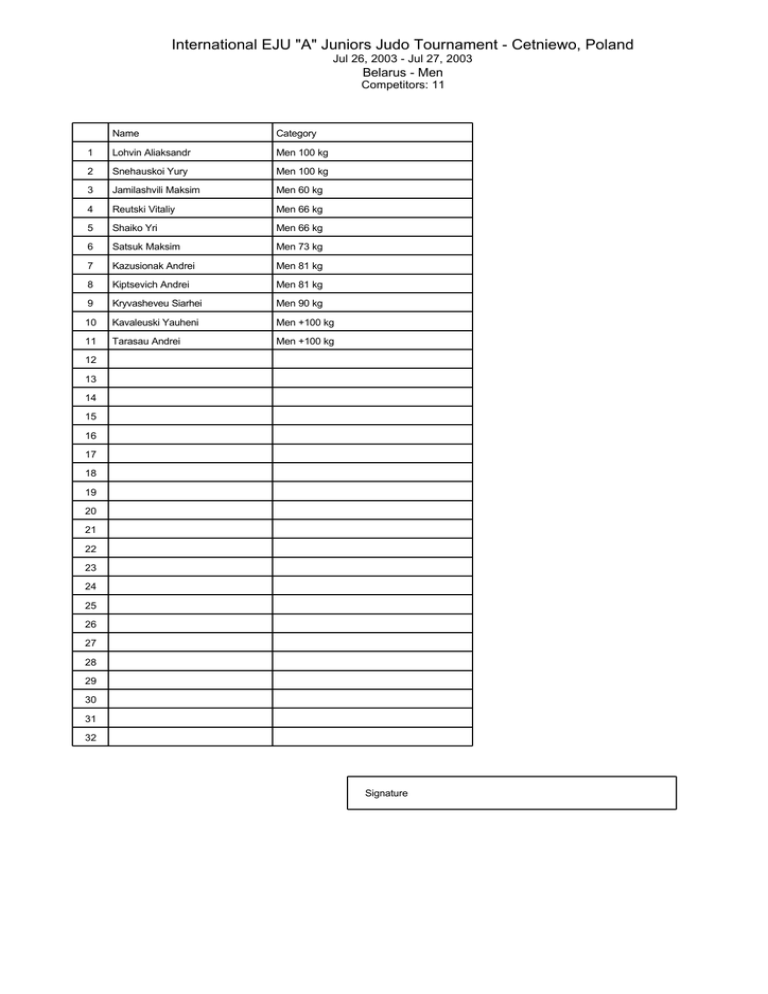 International EJU "A" Juniors Judo Tournament - Cetniewo, Poland Jul 26, 2003 - Jul 27, 2003 Belarus - Men Competitors: 11 Name Category 1 Lohvin Aliaksandr Men 100 kg 2 Snehauskoi Yury Men 100 kg 3 Jamilashvili Maksim Men 60 kg 4 Reutski Vitaliy Men 66 kg 5 Shaiko Yri Men 66 kg 6 Satsuk Maksim Men 73 kg 7 Kazusionak Andrei Men 81 kg 8 Kiptsevich Andrei Men 81 kg 9 Kryvasheveu Siarhei Men 90 kg 10 Kavaleuski Yauheni Men +100 kg 11 Tarasau Andrei Men +100 kg 12 13 14 15 16 17 18 19 20 21 22 23 24 25 26 27 28 29 30 31 32 Signature International EJU "A" Juniors Judo Tournament - Cetniewo, Poland Jul 26, 2003 - Jul 27, 2003 Belarus - Women Competitors: 9 Name Category 1 Kasukha Libou Women 48 kg 2 Kalevatava Iryna Women 52 kg 3 Razumova Ratstaryna Women 52 kg 4 Leuchanka Katsiaryna Women 57 kg 5 Dragun Yana Women 63 kg 6 Tarasova Alina Women 63 kg 7 Tsimashenko Sviatlana Women 70 kg 8 Aniskova Natalia Women 78 kg 9 Barysik Yuliya Women +78 kg 10 11 12 13 14 15 16 17 18 19 20 21 22 23 24 25 26 27 28 29 30 31 32 Signature