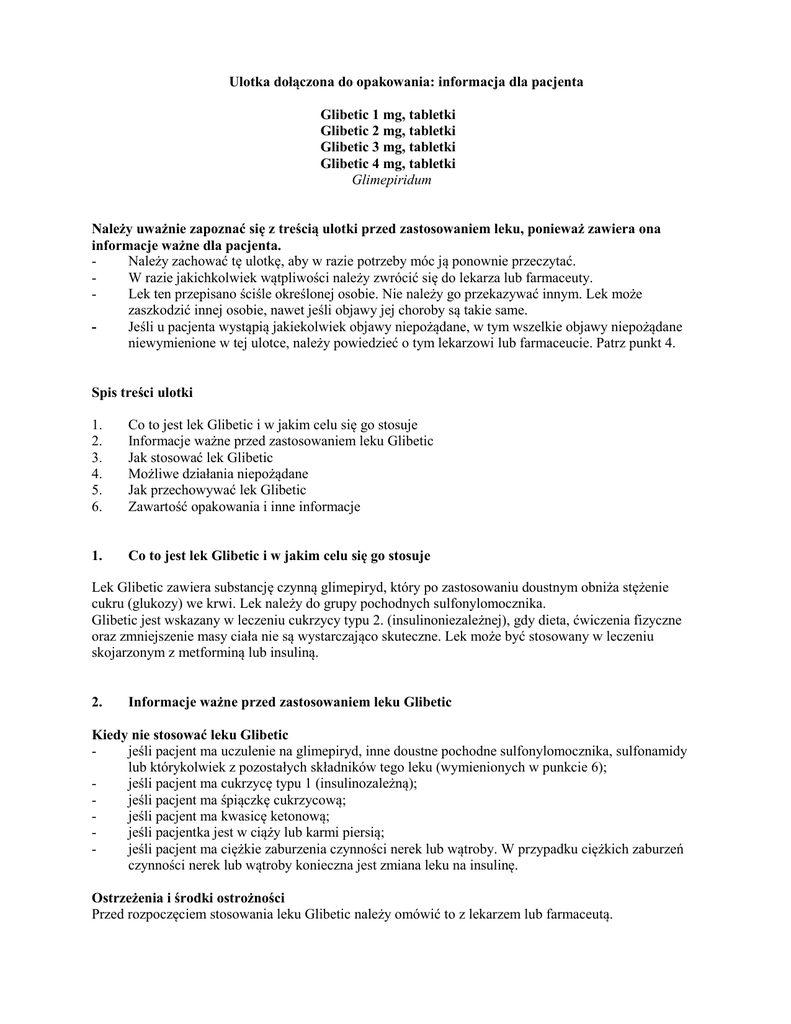 Ulotka dołączona do opakowania: informacja dla pacjenta Glibetic 1 mg, tabletki Glibetic 2 mg, tabletki Glibetic 3 mg, tabletki Glibetic 4 mg, tabletki Glimepiridum Należy uważnie zapoznać się z treścią ulotki przed zastosowaniem leku, ponieważ zawiera ona informacje ważne dla pacjenta. Należy zachować tę ulotkę, aby w razie potrzeby móc ją ponownie przeczytać. W razie jakichkolwiek wątpliwości należy zwrócić się do lekarza lub farmaceuty. Lek ten przepisano ściśle określonej osobie. Nie należy go przekazywać innym. Lek może zaszkodzić innej osobie, nawet jeśli objawy jej choroby są takie same. Jeśli u pacjenta wystąpią jakiekolwiek objawy niepożądane, w tym wszelkie objawy niepożądane niewymienione w tej ulotce, należy powiedzieć o tym lekarzowi lub farmaceucie. Patrz punkt 4. Spis treści ulotki 1. 2. 3. 4. 5. 6. Co to jest lek Glibetic i w jakim celu się go stosuje Informacje ważne przed zastosowaniem leku Glibetic Jak stosować lek Glibetic Możliwe działania niepożądane Jak przechowywać lek Glibetic Zawartość opakowania i inne informacje 1. Co to jest lek Glibetic i w jakim celu się go stosuje Lek Glibetic zawiera substancję czynną glimepiryd, który po zastosowaniu doustnym obniża stężenie cukru (glukozy) we krwi. Lek należy do grupy pochodnych sulfonylomocznika. Glibetic jest wskazany w leczeniu cukrzycy typu 2. (insulinoniezależnej), gdy dieta, ćwiczenia fizyczne oraz zmniejszenie masy ciała nie są wystarczająco skuteczne. Lek może być stosowany w leczeniu skojarzonym z metforminą lub insuliną. 2. Informacje ważne przed zastosowaniem leku Glibetic Kiedy nie stosować leku Glibetic jeśli pacjent ma uczulenie na glimepiryd, inne doustne pochodne sulfonylomocznika, sulfonamidy lub którykolwiek z pozostałych składników tego leku (wymienionych w punkcie 6); jeśli pacjent ma cukrzycę typu 1 (insulinozależną); jeśli pacjent ma śpiączkę cukrzycową; jeśli pacjent ma kwasicę ketonową; jeśli pacjentka jest w ciąży lub karmi piersią; jeśli pacjent ma ciężkie zaburzenia czynności nerek lub wątroby. W przypadku ciężkich zaburzeń czynności nerek lub wątroby konieczna jest zmiana leku na insulinę. Ostrzeżenia i środki ostrożności Przed rozpoczęciem stosowania leku Glibetic należy omówić to z lekarzem lub farmaceutą. Podczas leczenia lekiem Glibetic konieczne jest regularne badanie stężenia cukru we krwi. Lekarz może także zalecić badania krwi, żeby kontrolować liczbę komórek krwi i czynność wątroby. Pacjent powinien zwracać uwagę na plan leczenia zalecony przez lekarza, w celu osiągnięcia właściwego stężenia cukru we krwi. Oznacza to, że poza regularnym zażywaniem tabletek, pacjent powinien przestrzegać diety, wykonywać ćwiczenia fizyczne i, jeśli konieczne, zmniejszyć masę ciała. Należy również zadbać o regularne, zgodne z zaleceniami lekarza, badanie stężenia cukru we krwi (i ewentualnie w moczu). Podczas kilku pierwszych tygodni leczenia ryzyko zmniejszonego stężenia cukru we krwi (hipoglikemii) może być zwiększone, dlatego pacjent powinien być pod ścisłą obserwacją lekarza. Zmniejszenie stężenia cukru we krwi może wystąpić, jeśli: - pacjent nie spożywa regularnie posiłków lub pomija je całkowicie; - głodzi się; - jest niedożywiony; - zmieni dietę; - zwiększy aktywność fizyczną i nie zwiększy ilości spożywanych wodorowęglanów; - spożywa alkohol, zwłaszcza w połączeniu z pomijaniem posiłków; - w tym samym czasie zażywa inne leki lub preparaty pochodzenia naturalnego; - zażywa duże dawki leku Glibetic; - choruje na pewne choroby indukowane hormonalnie (czynnościowe zaburzenia tarczycy, przysadki lub kory nadnerczy); - ma zmniejszoną czynność nerek; - ma znacznie zmniejszoną czynność wątroby; - nie stosuje się do zaleceń lekarza lub tej ulotki dla pacjenta. Jeśli występuje takie ryzyko, należy poinformować o nim lekarza, aby w razie konieczności mógł dostosować dawkę glimepirydu lub zmienić cały plan leczenia. Jeśli u pacjenta wystąpi małe stężenie cukru we krwi (hipoglikemia) mogą wystąpić następujące objawy: ból głowy, uczucie głodu, wyczerpanie, nudności, wymioty, znużenie, senność, zaburzenia snu, niepokój, agresja, osłabienie koncentracji, uwagi i czasu reakcji, depresja, dezorientacja, zaburzenia mowy i widzenia, trudności z mówieniem lub rozumieniem mowy (afazja), drżenia, niedowład, zaburzenia narządów zmysłów, zawroty głowy, bezradność. Mogą również wystąpić następujące objawy: pocenie się, lepka skóra, niepokój, przyspieszone bicie serca, wysokie ciśnienie tętnicze, uczucie nieprawidłowo silnego lub nieregularnego bicia serca (kołatanie), nagły ból w klatce piersiowej, który może promieniować (dławica piersiowa) i zaburzenia rytmu serca. Jeśli stężenie cukru we krwi będzie nadal się zmniejszać, może wystąpić znaczna dezorientacja (delirium), drgawki pochodzenia mózgowego, utrata samokontroli, oddech pacjenta może stać się płytki i może się zwolnić czynność serca, pacjent może stracić przytomność. Obraz kliniczny ciężkiego zmniejszenia stężenia cukru we krwi może być podobny do udaru mózgu. W większości przypadków objawy zmniejszonego stężenia cukru we krwi ustępują bardzo szybko, jeśli pacjent spożyje cukier, np. cukier w kostkach, słodki sok, posłodzoną herbatę (sztuczne środki słodzące są nieskuteczne). Objawy zmniejszonego stężenia cukru we krwi mogą nie występować, być mniej nasilone lub powoli się rozwijać. Pacjent nie będzie świadomy, że stężenie cukru we krwi uległo zmniejszeniu. Może się to zdarzyć u pacjentów w podeszłym wieku, zażywających pewne leki (np. leki działające na ośrodkowy układ nerwowy lub leki blokujące receptory beta-adrenergiczne). Może to się również zdarzyć, jeśli pacjent choruje na pewne choroby układu wydzielania wewnętrznego (