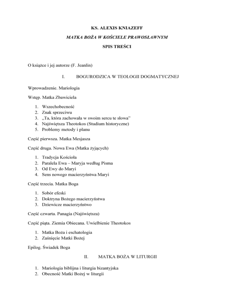 KS. ALEXIS KNIAZEFF MATKA BOŻA W KOŚCIELE PRAWOSŁAWNYM SPIS TREŚCI O książce i jej autorze (F. Jeanlin) I. BOGURODZICA W TEOLOGII DOGMATYCZNEJ Wprowadzenie. Mariologia Wstęp. Matka Zbawiciela 1. 2. 3. 4. 5. Wszechobecność Znak sprzeciwu „Ta, która zachowała w swoim sercu te słowa” Najświętsza Theotokos (Studium historyczne) Problemy metody i planu Część pierwsza. Matka Mesjasza Część druga. Nowa Ewa (Matka żyjących) 1. 2. 3. 4. Tradycja Kościoła Paralela Ewa – Maryja według Pisma Od Ewy do Maryi Sens nowego macierzyństwa Maryi Część trzecia. Matka Boga 1. Sobór efeski 2. Doktryna Bożego macierzyństwa 3. Dziewicze macierzyństwo Część czwarta. Panagia (Najświętsza) Część piąta. Ziemia Obiecana. Uwielbienie Theotokos 1. Matka Boża i eschatologia 2. Zaśnięcie Matki Bożej Epilog. Świadek Boga II. MATKA BOŻA W LITURGII 1. Mariologia biblijna i liturgia bizantyjska 2. Obecność Matki Bożej w liturgii III. MATKA BOŻA W KOŚCIELE KATOLICKIM (PRAWOSŁAWNY PUNKT WIDZENIA JAKO PRZYCZYNEK DO DIALOGU EKUMENICZNEGO) 1. Maryja – Matka Kościoła 2. Mater, advocata, testis 3. Matka Odkupiciela Inne prace tego samego autora Słownik terminologiczny Indeks osobowy