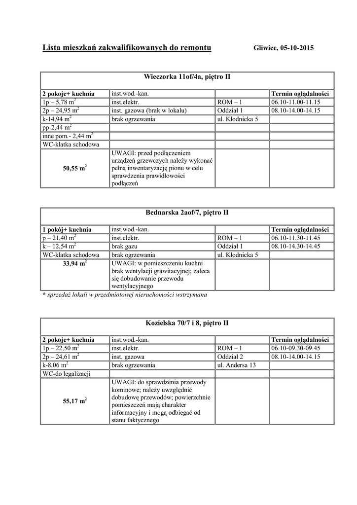 Lista mieszkań zakwalifikowanych do remontu Gliwice, 05-10-2015 Wieczorka 11of/4a, piętro II 2 pokoje+ kuchnia 1p – 5,78 m2 2p – 24,95 m2 k-14,94 m2 pp-2,44 m2 inne pom.- 2,44 m2 WC-klatka schodowa 50,55 m2 inst.wod.-kan. inst.elektr. inst. gazowa (brak w lokalu) brak ogrzewania ROM – 1 Oddział 1 ul. Kłodnicka 5 Termin oglądalności 06.10-11.00-11.15 08.10-14.00-14.15 UWAGI: przed podłączeniem urządzeń grzewczych należy wykonać pełną inwentaryzację pionu w celu sprawdzenia prawidłowości podłączeń Bednarska 2aof/7, piętro II inst.wod.-kan. inst.elektr. brak gazu brak ogrzewania UWAGI: w pomieszczeniu kuchni brak wentylacji grawitacyjnej; zaleca się dobudowanie przewodu wentylacyjnego * sprzedaż lokali w przedmiotowej nieruchomości wstrzymana 1 pokój+ kuchnia p – 21,40 m2 k – 12,54 m2 WC-klatka schodowa 33,94 m2 ROM – 1 Oddział 1 ul. Kłodnicka 5 Termin oglądalności 06.10-11.30-11.45 08.10-14.30-14.45 Kozielska 70/7 i 8, piętro II 2 pokoje+ kuchnia 1p – 22,50 m2 2p – 24,61 m2 k-8,06 m2 WC-do legalizacji 55,17 m2 inst.wod.-kan. inst.elektr. inst. gazowa brak ogrzewania UWAGI: do sprawdzenia przewody kominowe; należy uwzględnić dobudowę przewodów; powierzchnie pomieszczeń mają charakter informacyjny i mogą odbiegać od stanu faktycznego ROM – 1 Oddział 2 ul. Andersa 13 Termin oglądalności 06.10-09.30-09.45 08.10-14.00-14.15 Daszyńskiego 25/6, piętro I 3 pokoje+ kuchnia 1p – 17,32 m2 2p – 14,14 m2 3p – 9,08 m2 k-13,85 m2 pp-5,90 m2 łaz., WC-7,15 m2 67,44 m2 inst.wod.-kan. inst.elektr. inst. gazowa brak ogrzewania ROM – 1 Oddział 2 ul. Andersa 13 Termin oglądalności 06.10-10.30-10.45 08.10-15.30-15.45 UWAGI: na budynku prowadzone są prace związane z dobudową brakujących przewodów kominowych Plac Piastów 9/7, piętro II inst.wod.-kan. 2 pokoje+ kuchnia 1p – 21,30 m2 inst.elektr. ROM – 2 2 2p – 17,50 m inst. gazowa Oddział 1 k-14,50 m2 brak ogrzewania ul. Zabrska 15 2 pp-7,00 m łaz., WC-3,00 m2 64,00 m2 * sprzedaż lokali w przedmiotowej nieruchomości wstrzymana; rejon DTŚ Termin oglądalności 06.10-10.15-10.30 07.10-14.00-14.15 Łanowa 2/2, piętro I 1 pokój+ kuchnia p – 20,06 m2 k – 25,96 m2 łaz. z WC- wydzielona z części kuchni (zasłonięta kotarą)-do legalizacji 46,02 m2 inst.wod.-kan. inst.elektr. inst. gazowa brak ogrzewania UWAGI: przed podłączeniem urządzeń grzewczych należy wykonać pełną inwentaryzację pionu w celu sprawdzenia prawidłowości podłączeń ROM – 3 Oddział 2 ul. Andersa 13 Termin oglądalności 06.10-14.00-14.15 08.10-08.30-08.45 Rybnicka 1/2, parter 2 pokoje+ kuchnia 1p – 22,37 m2 2p – 22,41 m2 k-15,24 m2 pp-6,17 m2 łaz.(nielegalna) 3,96 m2 WC-klatka schodowa 70,15 m2 inst.wod.-kan. inst.elektr. inst. gazowa brak ogrzewania ROM – 3 Oddział 2 ul. Asnyka 15 Termin oglądalności 06.10-13.15-13.30 08.10-07.45-08.00 UWAGI: WC w lokalu do likwidacji Przemysłowa 1b/3, piętro I 1 pokój+ kuchnia p – 17,87 m2 *k – 15,99 m2 WC-klatka schodowa 33,86 m2 inst.wod.-kan. inst.elektr. inst. gazowa brak ogrzewania UWAGI: do sprawdzenia przewody kominowe; należy uwzględnić dobudowę przewodów; z części kuchni wydzielony został drugi pokój-należy zdemontować ściankę działową i przywrócić układ pomieszczeń do stanu pierwotnego; * powierzchnia kuchni po demontażu ścianki działowej ROM – 4 ul. Dziewanny 2 Termin oglądalności 05.10-15.00-15.15 08.10-09.00-09.15 Metalowców 7/1, parter BUDYNEK PRZY UL. METALOWCÓW 7 W SAMOISTNYM POSIADANIU MIASTA GLIWICE* 1 pokój+ kuchnia p – 19,94 m2 k – 5,44 m2 pp-5,10 m2 WC- 1,08 m2 inst.wod.-kan. inst.elektr. inst. gazowa (brak w lokalu) brak ogrzewania Termin oglądalności ROM – 10 06.10-14.30-14.45 ul. Zawadzkiego 9 08.10-10.00-10.15 UWAGI: do sprawdzenia przewody kominowe; należy uwzględnić dobudowę przewodów * Miasto Gliwice włada przedmiotową nieruchomością jak właściciel, lecz nim nie jest; aktualnie brak możliwości wykupu na własność w/w lokalu 31,56 m2 JEDNOKROTNA REZYGNACJA Z OBJĘCIA W NAJEM WSKAZANEGO DO REMONTU LOKALU MIESZKALNEGO SPOWODUJE SKREŚLENIE Z LISTY OSÓB OCZEKUJĄCYCH NA MIESZKANIE DO REMONTU. Prosimy o składanie podań w Biurze Podawczym Zakładu Gospodarki Mieszkaniowej z siedzibą przy Placu Inwalidów Wojennych 12. Termin składania podań do dnia 09 października 2015 roku