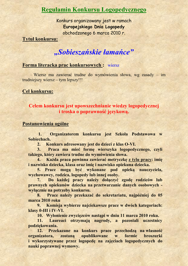 Regulamin Konkursu Logopedycznego Konkurs organizowany jest w ramach Europejskiego Dnia Logopedy obchodzonego 6 marca 2010 r. Tytuł konkursu: „Sobieszańskie łamańce” Forma literacka prac konkursowych : wiersz Wiersz ma zawierać trudne do wymówienia słowa, wg zasady – im trudniejszy wiersz – tym lepszy!!! Cel konkursu: Celem konkursu jest upowszechnianie wiedzy logopedycznej i troska o poprawność językową. Postanowienia ogólne 1. Organizatorem konkursu jest Szkoła Podstawowa w Sobiechach. 2. Konkurs adresowany jest do dzieci z klas O-VI. 3. Praca ma mieć formę wierszyka logopedycznego, czyli takiego, który zawiera trudne do wymówienia słowa. 4. Każda praca powinna zawierać metryczkę z tyłu pracy: imię i nazwisko dziecka, klasa oraz imię i nazwisko opiekuna dziecka. 5. Prace mogą być wykonane pod opieką nauczyciela, wychowawcy, rodzica, logopedy lub innej osoby. 7. Do każdej pracy należy dołączyć zgodę rodziców lub prawnych opiekunów dziecka na przetwarzanie danych osobowych wyłącznie na potrzeby konkursu. 8. Prace należy przekazać do sekretariatu, najpóźniej do 05 marca 2010 roku 9. Komisja wybierze najciekawsze prace w dwóch kategoriach: klasy 0-III i IV-VI. 10. Wyłonienie zwycięzców nastąpi w dniu 11 marca 2010 roku. 11. Laureaci otrzymają nagrody, a pozostali uczestnicy podziękowania. 12. Przekazane na konkurs prace przechodzą na własność organizatora, zostaną opublikowane w formie broszurki i wykorzystywane przez logopedę na zajęciach logopedycznych do nauki poprawnej wymowy.