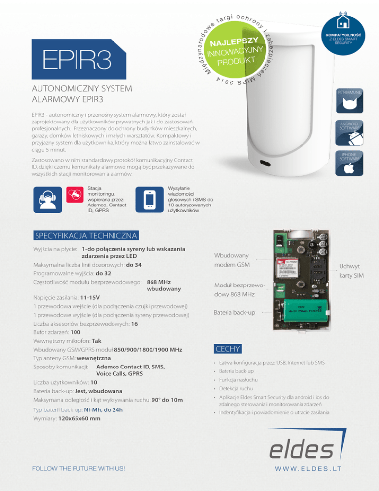 w n abezpiec ze i z dzynarodo rgi ochro y Y NAJLEPSZ JNY INNOWACY PRODUK T MI PS 2014 AUTONOMICZNY SYSTEM ALARMOWY EPIR3 ń M ię EPIR3 e ta KOMPATYBILNOŚĆ Z ELDES SMART SECURITY PET-IMMUNE EPIR3 - autonomiczny i przenośny system alarmowy, który został zaprojektowany dla użytkowników prywatnych jak i do zastosowań profesjonalnych. Przeznaczony do ochrony budynków mieszkalnych, garaży, domków letniskowych i małych warsztatów. Kompaktowy i przyjazny system dla użytkownika, ktróry można łatwo zainstalować w ciągu 5 minut. ANDROID SOFTWARE IPHONE SOFTWARE Zastosowano w nim standardowy protokół komunikacyjny Contact ID, dzięki czemu komunikaty alarmowe mogą być przekazywane do wszystkich stacji monitorowania alarmów. Stacja monitoringu, wspierana przez: Ademco, Contact ID, GPRS Wysyłanie wiadomości głosowych i SMS do 10 autoryzowanych użytkowników SPECYFIKACJA TECHNICZNA Wyjścia na płycie: 1-do połączenia syreny lub wskazania zdarzenia przez LED Maksymalna liczba linii dozorowych: do 34 Programowalne wyjścia: do 32 Częstotliwość modułu bezprzewodowego: 868 MHz wbudowany Napięcie zasilania: 11-15V 1 przewodowa wejście (dla podłączenia czujki przewodowej) 1 przewodowe wyjście (dla podłączenia syreny przewodowej) Liczba aksesoriów bezprzewodowych: 16 Bufor zdarzeń: 100 Wewnętrzny mikrofon: Tak Wbudowany GSM/GPRS moduł 850/900/1800/1900 MHz Typ anteny GSM: wewnętrzna Sposoby komunikacji: Ademco Contact ID, SMS, Voice Calls, GPRS Liczba użytkowników: 10 Bateria back-up: Jest, wbudowana Maksymana odległość i kąt wykrywania ruchu: 90° do 10m Typ baterii back-up: Ni-Mh, do 24h Wymiary: 120x65x60 mm FOLLOW THE FUTURE WITH US! Wbudowany modem GSM Uchwyt karty SIM Moduł bezprzewodowy 868 MHz Bateria back-up CECHY • Łatwa konfiguracja przez: USB, Internet lub SMS • Bateria back-up • Funkcja nasłuchu • Detekcja ruchu • Aplikacje Eldes Smart Security dla android i ios do zdalnego sterowania i monitorowania zdarzeń • Indentyfikacja i powiadomienie o utracie zasilania W W W. E L D E S . LT AUTONOMICZNY SYSTEM ALARMOWY EPIR3 I AKSESORIA MOŻLIWOŚĆ ROZSZERZENIE SYSTEMU DO 16 CZUJEK BEZPRZEWODOWYCH BEZPRZEWODOWA SYRENA WEWNĘTRZNA EWS3 BEZPRZEWODOWA CZUJKA DYMU EWF1 BEZPRZEWODOWA CZUJKA PIR EWP2 EPIR3 BEZPRZEWODOWA SYRENA ZEWNĘTRZNA EWS2 ŁATWE STEROWANIE ZA POMOCĄ APLIKACJI SMARTFONA. WSPARTE PRZEZ ELDES SMART SECURITY. ZASTOSOWANIE MIESZKANIA BEZPRZEWODOWA KLAWIATURA EKB3W BEZPRZEWODOWY PILOT EWK2 KONFIGURACJA W 3 PROSTYCH KROKACH BEZPRZEWODOWY MAGNETYCZNY CZUJNIK OTWARCIA DRZWI EWD2 YW Ł AT W ACJI L A INST ENIE Z UR Z ĄD TUJĄCE R Z YS W YKO TĘ SIM K AR DOMKI LETNISKOWE WŁÓŻ KARTĘ SIM GARAŻE STOISKA HANDLOWE PODŁĄCZ DO GNIAZDKA ZASILANIA PRZYCZEPY KEMPINGOWE JACHTY FOLLOW THE FUTURE WITH US! SYSTEM JEST GOTOWY DO PRACY OPAKOWANIE GOTOWE NA PÓŁKĘ W W W. E L D E S . LT
