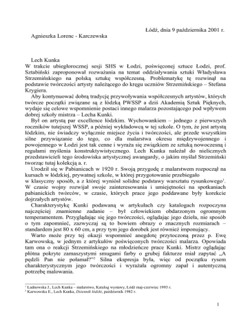 Łódź, dnia 9 października 2001 r. Agnieszka Lorenc - Karczewska Lech Kunka W trakcie ubiegłorocznej sesji SHS w Łodzi, poświęconej sztuce Łodzi, prof. Sztabiński zaproponował rozważania na temat oddziaływania sztuki Władysława Strzemińskiego na polską sztukę współczesną. Problematykę tę rozwinął na podstawie twórczości artysty należącego do kręgu uczniów Strzemińskiego – Stefana Krygiera. Aby kontynuować dobrą tradycję przywoływania współczesnych artystów, których twórcze początki związane są z łódzką PWSSP a dziś Akademią Sztuk Pięknych, wydaje się celowe wspomnienie postaci innego malarza pozostającego pod wpływem dobrej szkoły mistrza – Lecha Kunki. Był on artystą par excellence łódzkim. Wychowankiem – jednego z pierwszych roczników tutejszej WSSP, a później wykładowcą w tej szkole. O tym, że jest artystą łódzkim, nie świadczy wyłącznie miejsce życia i twórczości, ale przede wszystkim silne przywiązanie do tego, co dla malarstwa okresu międzywojennego i powojennego w Łodzi jest tak cenne i wyraża się związkiem ze sztuką nowoczesną i regułami myślenia konstruktywistycznego. Lech Kunka należał do nielicznych przedstawicieli tego środowiska artystycznej awangardy, o jakim myślał Strzemiński tworząc tutaj kolekcją a. r. Urodził się w Pabianicach w 1920 r. Swoją przygodę z malarstwem rozpoczął na kursach w łódzkiej, prywatnej szkole, w której przygotowanie przebiegało w klasyczny sposób, a z której wyniósł solidne podstawy warsztatu rysunkowego1. W czasie wojny rozwijał swoje zainteresowania i umiejętności na spotkaniach pabianickich twórców, w czasie, których prace jego poddawane były korekcie dojrzałych artystów. Charakterystykę Kunki podawaną w artykułach czy katalogach rozpoczyna najczęściej znamienne zadanie – był człowiekiem obdarzonym ogromnym temperamentem. Przyglądając się jego twórczości, oglądając jego dzieła, nie sposób o tym zapomnieć, zazwyczaj są to bowiem obrazy o znacznych rozmiarach – standardem jest 80 x 60 cm, a przy tym jego dorobek jest również imponujący. Warto może przy tej okazji wspomnieć anegdotę przytoczoną przez p. Ewę Karwowską, w jednym z artykułów poświęconych twórczości malarza. Opowiada tam ona o reakcji Strzemińskiego na młodzieńcze prace Kunki. Mistrz oglądając płótna pokryte zamaszystymi smugami farby o grubej fakturze miał zapytać „A pędzli Pan nie połamał?”2 Silna ekspresja była, więc od początku rysem charakterystycznym jego twórczości i wyrażała ogromny zapał i autentyczną potrzebę malowania. 1 2 Ładnowska J., Lech Kunka – malarstwo, Katalog wystawy, Łódź maj-czerwiec 1993 r. Karwowska E., Lech Kunka, Dziennik łódzki, październik 1982 r. 1 Do Wyższej Szkoły Stuk Plastycznych w Łodzi wstąpił w 1945 r. Z właściwą sobie energią zabrał się za studiowanie dotychczasowych doświadczeń artystycznych, na podstawie, których poszukiwał możliwości wykreowania własnego języka. Pragnienie to było motorem nieustannych poszukiwań. Miał szczęście, spotykając na swojej drodze artystycznej wielkie indywidualności: Strzemińskiego – którego był uczniem oraz Légera, w którego pracowni uczył się przez rok. Obaj mistrzowie wywarli ogromny wpływ na twórczość Kunki. Choć oczywiście nie można jednoznacznie wyróżnić okresów kiedy w obrazach uwidaczniają się wpływy każdego z nich, to warto, śledząc drogę twórczą Kunki, zwrócić uwagę na to jak przeplatają się realizacje oszczędne w formie, uporządkowane powstałe pod wpływem szkoły Strzemińskiego oraz te, wykorzystujące bogactwo barw i materii, zbliżone do prac Légera. 3 Wpływ szkoły Strzemińskiego wyraził się przede wszystkim w konstruktywistycznym światopoglądzie. Istotne były oczywiście również: dobrze opanowany warsztat, rozumienie i umiejętne stosowanie zasad kompozycji, umiejętność syntezy w przekształcaniu bryły oraz wrażliwość w zakresie tworzenia iluzji przestrzennej poprzez stosowanie plam walorowych, Strzemiński wpajał swoim wychowankom przekonanie o konieczności rozwinięcia własnej indywidualności twórczej, jednak nie inaczej jak na podstawie umiejętnego analizowania zjawisk wizualnych. Dlatego też tak ogromną wagę przywiązywał do wiedzy w zakresie historii sztuki. W jego rozumieniu rozwój możliwy jest jedynie w oparciu o tradycję i dorobek ludzkiej natury. Strzemiński w ramach głoszonej przez siebie teorii widzenia, uczył sztuki nowoczesnej ze szczególnym ujęciem abstrakcji geometrycznej oraz grafiki funkcjonalnej. W dziełach mistrza, z których wzory czerpali jego uczniowie znać było to, że spośród pięciu par pojęć Wölfflinowskich wybierał on zdecydowanie: płaszczyznowość, formy zamknięte, jasność i jedność, wahając się jedynie między linearyzmem a malarskością. Strzemiński opowiadał się za abstrakcją, choć sztukę rozpatrywał w kategoriach przydatności w życiu społecznym. Szkoła łódzka oparła swój program o potencjał artystyczny i o analityczny dorobek teoretycznych twórców sztuki nowoczesnej. Pierwsze świadome rozważania o niej możliwe były dzięki bogatym zbiorom grupy a. r., wśród, których znajdowały się dzieła Légera, Arpa, Ernsta i innych. Ponieważ na artystów miały wpływ liczne wynalazki i naukowe odkrycia, stąd potrzeba wynajdowania nowych środków wyrazu dla ich obrazowania. Strzemiński zwracał uwagę na ciągłość ewolucji form i jej przekształcenia w ramach jednego kierunku. Jego studenci zapoznawali się z wszystkimi fazami kubizmu. Ówczesne prace Kunki świadczą o zafascynowaniu postawą mistrza, ale także o umiejętności twórczego wykorzystania poznanych wzorów dla pogłębienia rozumienia kolejnych etapów rozwoju sztuki abstrakcyjnej, którą wybrał i konsekwentnie kontynuował. Stąd wywodzą się jego dzieła przywołujące na myśl 