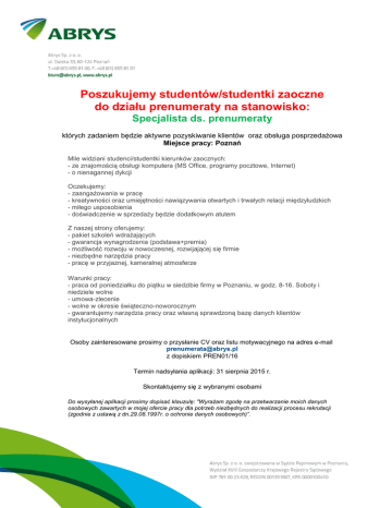 Poszukujemy studentów/studentki zaoczne do działu prenumeraty na stanowisko: Specjalista ds. prenumeraty których zadaniem będzie aktywne pozyskiwanie klientów oraz obsługa posprzedażowa Miejsce pracy: Poznań Mile widziani studenci/studentki kierunków zaocznych: - ze znajomością obsługi komputera (MS Office, programy pocztowe, Internet) - o nienagannej dykcji Oczekujemy: - zaangażowania w pracę - kreatywności oraz umiejętności nawiązywania otwartych i trwałych relacji międzyludzkich - miłego usposobienia - doświadczenie w sprzedaży będzie dodatkowym atutem Z naszej strony oferujemy: - pakiet szkoleń wdrażających - gwarancja wynagrodzenia (podstawa+premia) - możliwość rozwoju w nowoczesnej, rozwijającej się firmie - niezbędne narzędzia pracy - pracę w przyjaznej, kameralnej atmosferze Warunki pracy: - praca od poniedziałku do piątku w siedzibie firmy w Poznaniu, w godz. 8-16. Soboty i niedziele wolne - umowa-zlecenie - wolne w okresie świąteczno-noworocznym - gwarantujemy narzędzia pracy oraz własną sprawdzoną bazę danych klientów instytucjonalnych Osoby zainteresowane prosimy o przysłanie CV oraz listu motywacyjnego na adres e-mail [email protected] z dopiskiem PREN01/16 Termin nadsyłania aplikacji: 31 sierpnia 2015 r. Skontaktujemy się z wybranymi osobami Do wysyłanej aplikacji prosimy dopisać klauzulę: "Wyrażam zgodę na przetwarzanie moich danych osobowych zawartych w mojej ofercie pracy dla potrzeb niezbędnych do realizacji procesu rekrutacji (zgodnie z ustawą z dn.29.08.1997r. o ochronie danych osobowych)”.