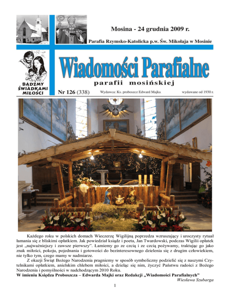 KaŜdego roku w polskich domach Wieczerzę Wigilijną poprzedza wzruszający i uroczysty rytuał łamania się z bliskimi opłatkiem. Jak powiedział ksiądz i poeta, Jan Twardowski, podczas Wigilii opłatek jest „najwaŜniejszy i zawsze pierwszy”. Łamiemy go ze czcią i ze czcią poŜywamy, traktując go jako znak miłości, pokoju, pojednania i gotowości do bezinteresownego dzielenia się z drugim człowiekiem, nie tylko tym, czego mamy w nadmiarze. Z okazji Świąt BoŜego Narodzenia pragniemy w sposób symboliczny podzielić się z naszymi Czytelnikami opłatkiem, anielskim chlebem miłości, a dzieląc się nim, Ŝyczyć Państwu radości z BoŜego Narodzenia i pomyślności w nadchodzącym 2010 Roku. W imieniu Księdza Proboszcza – Edwarda Majki oraz Redakcji „Wiadomości Parafialnych” Wiesława Szubarga 1 Narodziny w Ciszy poszukującej schronienia, w którym bezpiecznie mogłaby urodzić Króla, nie było miejsca tam, gdzie wspólnie z Józefem pukali. Po dziś dzień zawstydzeni dźwigamy cięŜar obojętności tych, którzy zatwardzili swe serce na narodziny Dziecka, a później, powodowani nienawiścią, ukrzyŜowali Tego, który urodził się na to, Ŝeby zbawić świat. Wbrew temu, co wydarzyć się miało i co się wydarzyło, Chrystus ukochał człowieka tak bardzo, Ŝe stał się jednym z nas, aby nas uczynić sobą. I tak to BoŜe Narodzenie niespodziewanie stało się i za kaŜdym razem staje się wielkim podniesieniem ludzkiej natury: „Skoro Bóg tak bardzo siebie uniŜył, rodząc się jako dziecko – o ileŜ wywyŜszył godność ludzką”. Od chwili tych najwaŜniejszych w historii ludzkości narodzin minęło wiele czasu, na tyle duŜo, abyśmy zrozumieli sens i znaczenie faktu, Ŝe Król urodził się w nędznej szopie, w ciszy i pokorze i Ŝe witać Go przed bogaczami zaszczyt mieli najuboŜsi, czyli skromni, czystego serca, pełni nieśmiałości, bezkompromisowi, dziecięco szczerzy, potrafiący kochać, współczuć, gotowi do tego, aby dzielić się tym, czego mają za mało, wolni od pychy tych, którzy duŜo posiadają. Przypomnijmy jeszcze, Ŝe narodził się wśród zwierząt, które choć bezrozumne potrafiły samą swą obecnością, tym, Ŝe są, istnieją, wielbić maleńką Dziecinę. Tej pięknej nocy, nocy narodzin podąŜmy symbolicznie Do Betlejem Judzkiego, aby oddać pokłon Zbawicielowi, tak jak przed wiekami uczynili to mędrcy: „Gdy zaś Jezus narodził się w Betlejem Judzkim za króla Heroda, oto mędrcy ze Wschodu przybyli do Jerozolimy i pytali: Gdzie jest ten nowo narodzony król Ŝydowski? Widzieliśmy bowiem gwiazdę jego na Wschodzie i przyszliśmy oddać mu pokłon” (Mat 2, 1-2). Cała ta podróŜ do Betlejem Judzkiego ma szansę naprawdę odbyć się po raz kolejny, gdy zasiądziemy do Wigilijnej Wieczerzy i zastanowimy się nad sensem tego wszystkiego, co się wydarzyło. Dzieląc się z bliskimi opłatkiem, pamiętajmy, Ŝe jest on, jak powiedział Jan Twardowski, „najwaŜniejszy i zawsze pierwszy”, a połoŜony ze czcią „na talerzu, na bochenku chleba, na pasemku słomy lub siana, na ziarnach zbóŜ rozsypanych na obrusie albo zawiązanych w serwetkę, w zaleŜności od tradycji regionalnej i rodzinnej” stanowi symbol pojednania i przebaczenia, symbol gotowości do dzielenia się z innymi ludźmi nie tylko tym, czego mamy w nadmiarze. Gdy wreszcie oczy nasze spoczną na oświetlonej choince, niech jej światło przypomni nam, Ŝe „Bóg nawiedził nas w światłości niebiańskiej, by oświecić tych, którzy są w ciemnościach i którzy mrokiem śmierci są spowici” (Łk 1,78-79). Radujmy się i wyśpiewujmy naszą radość słowami kolędy, która ogrzeje zziębnięte rączki i nóŜki Dzieciątka, wypełni radością serce Maryi Matki, najpiękniejszej i najlepszej spośród matek. Gdy to się stanie, niech słowa kolędy uniosą się wysoko i swobodnie popłyną ponad dachami naszych domów ponad górami i rzekami, ponad równinami i lasami i wzniosą się aŜ pod niebiosa. Niech otuli ona w tę zimową noc cały świat i niech ukołysze go do spokojnego snu, snu, który nas pokrzepi i sprawi, Ŝe czuwać będziemy, gdy Chrystus powróci w dniu Sądu Ostatecznego, bo jak powiedział Jan Chrzciciel: „między wami stanął ten, który ma przyjść” (J 1,26). Radość, która stanie się naszym udziałem w Wigilijną Noc zapewne nas wzmocni i pozwoli nam patrzeć w przyszłość z nadzieją, jakiej przecieŜ ciągle i niezmiennie od wieków łakniemy. Wiesława Szubarga „W owym czasie wyszło rozporządzenie Cezara Augusta, Ŝeby przeprowadzić spis ludności w całym państwie. Pierwszy ten spis odbył się wówczas, gdy wielkorządcą Syrii był Kwiryniusz. Wybierali się więc wszyscy, aby się dać zapisać, kaŜdy do swego miasta. Udał się takŜe Józef z Galilei, z miasta Nazaret, do Judei, do miasta Dawidowego, zwanego Betlejem, poniewaŜ pochodził z domu i rodu Dawida, Ŝeby się dać zapisać z poślubioną sobie Maryją, która była brzemienna. Kiedy tam przebywali, nadszedł dla Maryi czas rozwiązania. Porodziła swego pierworodnego Syna, owinęła Go w pieluszki i połoŜyła w Ŝłobie, gdyŜ nie było dla nich miejsca w gospodzie” (Łk 2, 1-7). mały człowiek w ramionach wielkich miłości wiernej przyszedł przypomnieć Ŝe kochać coś znaczy i Ŝe miłością świat zbawić moŜna ks. Jan Twardowski Tak oto „Bóg się rodzi moc truchleje”. Te słowa jednej z najpiękniejszych kolęd napisanych przez Franciszka Karpińskiego uświadamiają nam, co wydarzyło się ponad dwa tysiące lat temu w stajence betlejemskiej, w której narodził się „Prawdziwy Bóg i prawdziwy człowiek - z ciałem i duszą rozumną. Współistotny z Ojcem według Bóstwa i współistotny z nami, ludźmi, według człowieczeństwa... Przed wiekami zrodzony z Ojca według natury BoŜej, w ostatnich zaś czasach zrodzony jako człowiek dla naszego zbawienia przez Maryję Dziewicę, BoŜ