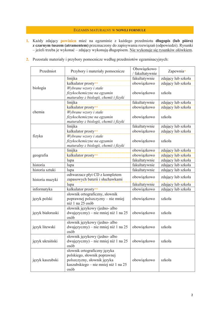 EGZAMIN MATURALNY W NOWEJ FORMULE 1. Każdy zdający powinien mieć na egzaminie z każdego przedmiotu długopis (lub pióro) z czarnym tuszem (atramentem) przeznaczony do zapisywania rozwiązań (odpowiedzi). Rysunki – jeżeli trzeba je wykonać – zdający wykonują długopisem. Nie wykonuje się rysunków ołówkiem. 2. Pozostałe materiały i przybory pomocnicze według przedmiotów egzaminacyjnych: Przedmiot biologia chemia fizyka geografia historia historia sztuki historia muzyki informatyka język polski język białoruski język litewski język ukraiński język kaszubski Przybory i materiały pomocnicze linijka kalkulator prosty** Wybrane wzory i stałe fizykochemiczne na egzamin maturalny z biologii, chemii i fizyki linijka kalkulator prosty** Wybrane wzory i stałe fizykochemiczne na egzamin maturalny z biologii, chemii i fizyki linijka kalkulator prosty** Wybrane wzory i stałe fizykochemiczne na egzamin maturalny z biologii, chemii i fizyki linijka kalkulator prosty** lupa lupa lupa odtwarzacz płyt CD z kompletem zapasowych baterii i słuchawkami lupa kalkulator prosty** słownik ortograficzny, słownik poprawnej polszczyzny – nie mniej niż 1 na 25 osób słownik językowy (jedno- albo dwujęzyczny) – nie mniej niż 1 na 25 osób słownik językowy (jedno- albo dwujęzyczny) – nie mniej niż 1 na 25 osób słownik językowy (jedno- albo dwujęzyczny) – nie mniej niż 1 na 25 osób słownik ortograficzny języka polskiego, słownik poprawnej polszczyzny, słownik języka kaszubskiego – nie mniej niż 1 na 25 osób Obowiązkowo / fakultatywnie fakultatywnie obowiązkowo zdający lub szkoła zdający lub szkoła obowiązkowo szkoła fakultatywnie obowiązkowo zdający lub szkoła zdający lub szkoła obowiązkowo szkoła fakultatywnie obowiązkowo zdający lub szkoła zdający lub szkoła obowiązkowo szkoła obowiązkowo obowiązkowo fakultatywnie fakultatywnie fakultatywnie zdający lub szkoła zdający lub szkoła zdający lub szkoła zdający lub szkoła zdający lub szkoła obowiązkowo zdający lub szkoła fakultatywnie obowiązkowo zdający lub szkoła zdający lub szkoła obowiązkowo szkoła obowiązkowo szkoła obowiązkowo szkoła obowiązkowo szkoła obowiązkowo szkoła Zapewnia* 2 język łemkowski język łaciński i kultura antyczna matematyka wiedza o społeczeństwie słownik ortograficzny języka polskiego, słownik poprawnej polszczyzny, słownik polsko-łemkowski i łemkowsko-polski – nie mniej niż 1 na 25 osób słownik łacińsko-polski – dla każdego zdającego; atlas historyczny – nie mniej niż 1 na 25 osób linijka cyrkiel kalkulator prosty** Wybrane wzory matematyczne kalkulator prosty** obowiązkowo szkoła obowiązkowo szkoła obowiązkowo obowiązkowo obowiązkowo obowiązkowo zdający lub szkoła zdający lub szkoła zdający lub szkoła szkoła fakultatywnie zdający lub szkoła * Przewodniczący zespołu egzaminacyjnego (dyrektor szkoły) informuje zdających, czy dane przybory i materiały pomocnicze zapewnia szkoła, czy każdy zdający przynosi własne. ** Kalkulator prosty – jest to kalkulator, który umożliwia wykonywanie tylko dodawania, odejmowania, mnożenia, dzielenia, ewentualnie obliczanie procentów lub pierwiastków kwadratowych z liczb. 3. Z dodatkowych materiałów oraz przyborów pomocniczych mogą korzystać zdający, którym dostosowano warunki przeprowadzania egzaminu maturalnego. Zdający korzystają ze sprzętu, którego używali w procesie dydaktycznym. Uprawnieni do dostosowania osoby niesłyszące osoby słabosłyszące osoby niewidome i słabowidzące osoby słabowidzące osoby, o których mowa w art. 94a ust. 1a ustawy (cudzoziemcy) wszyscy uprawnieni do dostosowania Przybory i materiały pomocnicze słownik języka polskiego, słownik wyrazów obcych, słownik wyrazów bliskoznacznych – nie mniej niż 1 na 25 osób odtwarzacz płyt CD ze słuchawkami w przypadku egzaminu z języka obcego nowożytnego (jeżeli dostosowanie takie zostało przyznane) sprzęt i oprogramowanie specjalistyczne (odpowiednie do ustalonego dla danego zdającego dostosowania warunków przeprowadzania egzaminu) przybory optyczne, z których zdający korzysta na co dzień słownik dwujęzyczny (polsko-obcojęzyczny i obcojęzyczno-polski) w wersji papierowej lub elektronicznej (z wyjątkiem egzaminu z języków mniejszości narodowych, języka mniejszości etnicznej, języka regionalnego i języków obcych nowożytnych) komputer lub komputer ze specjalistycznym oprogramowaniem, jeżeli takie dostosowanie zostało przyznane Obowiązkowo / fakultatywnie Zapewnia* obowiązkowo szkoła obowiązkowo zdający lub szkoła obowiązkowo szkoła fakultatywnie zdający fakultatywnie zdający lub szkoła obowiązkowo szkoła * Przewodniczący zespołu egzaminacyjnego (dyrektor szkoły) informuje zdających, czy dane przybory i materiały pomocnicze zapewnia szkoła, czy każdy zdający przynosi własne. 4. Osoby z chorobami przewlekłymi, chore lub niesprawne czasowo mogą korzystać z zaleconego przez lekarza sprzętu medycznego i leków koniecznych ze względu na chorobę. 3 EGZAMIN MATURALNY W STAREJ FORMULE 1. Każdy zdający powinien mieć na egzaminie z każdego przedmiotu długopis (lub pióro) z czarnym tuszem (atramentem), przeznaczony do zapisywania rozwiązań (odpowiedzi). Rysunki – jeżeli trzeba je wykonać – zdający wykonują długopisem. Nie wykonuje się rysunków ołówkiem. 2. Pozostałe materiały i przybory pomocnicze według przedmiotów egzaminacyjnych: Przedmiot biologia chemia fizyka i astronomia geografia historia historia sztuki historia muzyki informatyka język polski język białoruski język litewski język ukraiński język kaszubski język łemkowski Przybory i materiały pomocnicze linijka linijka kalkulator prosty** Karta wybranych tablic chemicznych linijka kalkulator prosty** Karta wybranych wzorów i stałych fizycznych linijka kalkulator prosty** lupa lupa lupa odtwarzacz płyt CD z kompl