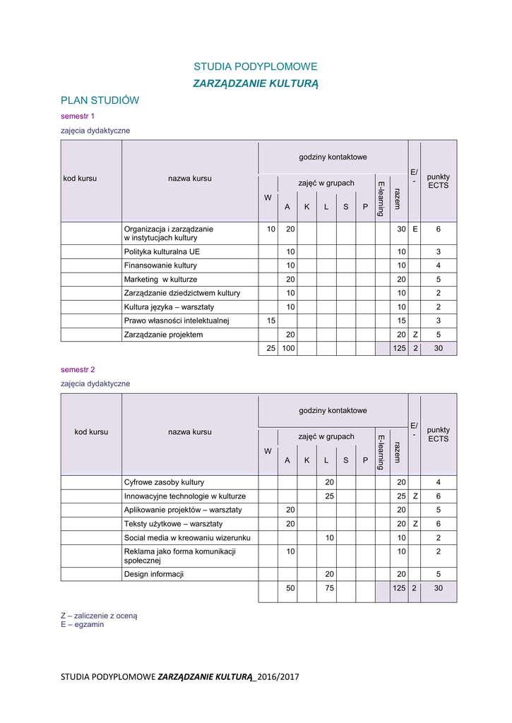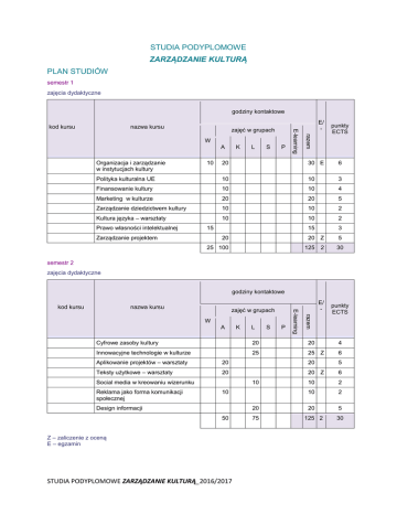 STUDIA PODYPLOMOWE ZARZĄDZANIE KULTURĄ PLAN STUDIÓW semestr 1 zajęcia dydaktyczne godziny kontaktowe nazwa kursu zajęć w grupach A Organizacja i zarządzanie w instytucjach kultury L S P punkty ECTS 20 30 E 6 Polityka kulturalna UE 10 10 3 Finansowanie kultury 10 10 4 Marketing w kulturze 20 20 5 Zarządzanie dziedzictwem kultury 10 10 2 Kultura języka – warsztaty 10 10 2 15 3 20 Z 5 Prawo własności intelektualnej 10 K E/ razem W E-learning kod kursu 15 Zarządzanie projektem 20 25 100 125 2 30 semestr 2 zajęcia dydaktyczne godziny kontaktowe nazwa kursu zajęć w grupach A K L S P E/ razem W E-learning kod kursu punkty ECTS Cyfrowe zasoby kultury 20 20 4 Innowacyjne technologie w kulturze 25 25 Z 6 Aplikowanie projektów – warsztaty 20 20 5 Teksty użytkowe – warsztaty 20 20 Z 6 10 2 10 2 20 5 Social media w kreowaniu wizerunku Reklama jako forma komunikacji społecznej 10 10 Design informacji 20 50 Z – zaliczenie z oceną E – egzamin STUDIA PODYPLOMOWE ZARZĄDZANIE KULTURĄ_2016/2017 75 125 2 30