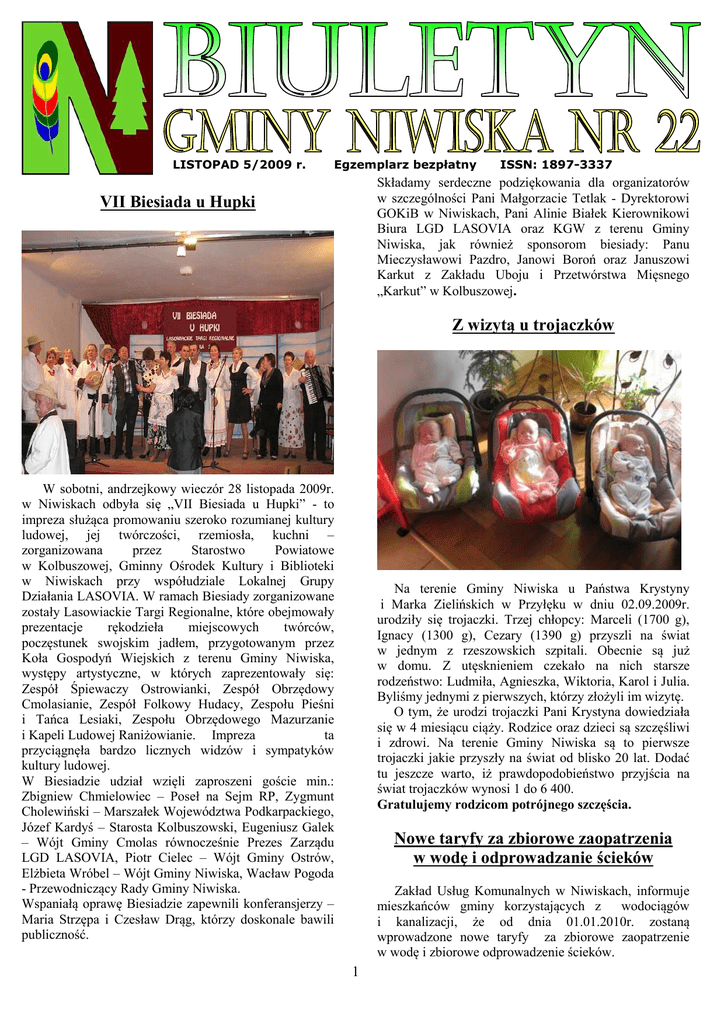 LISTOPAD 5/2009 r. Egzemplarz bezpłatny ISSN: 1897-3337 Składamy serdeczne podziękowania dla organizatorów w szczególności Pani Małgorzacie Tetlak - Dyrektorowi GOKiB w Niwiskach, Pani Alinie Białek Kierownikowi Biura LGD LASOVIA oraz KGW z terenu Gminy Niwiska, jak również sponsorom biesiady: Panu Mieczysławowi Pazdro, Janowi Boroń oraz Januszowi Karkut z Zakładu Uboju i Przetwórstwa Mięsnego „Karkut” w Kolbuszowej. VII Biesiada u Hupki Z wizytą u trojaczków W sobotni, andrzejkowy wieczór 28 listopada 2009r. w Niwiskach odbyła się „VII Biesiada u Hupki” - to impreza służąca promowaniu szeroko rozumianej kultury ludowej, jej twórczości, rzemiosła, kuchni – zorganizowana przez Starostwo Powiatowe w Kolbuszowej, Gminny Ośrodek Kultury i Biblioteki w Niwiskach przy współudziale Lokalnej Grupy Działania LASOVIA. W ramach Biesiady zorganizowane zostały Lasowiackie Targi Regionalne, które obejmowały prezentacje rękodzieła miejscowych twórców, poczęstunek swojskim jadłem, przygotowanym przez Koła Gospodyń Wiejskich z terenu Gminy Niwiska, występy artystyczne, w których zaprezentowały się: Zespół Śpiewaczy Ostrowianki, Zespół Obrzędowy Cmolasianie, Zespół Folkowy Hudacy, Zespołu Pieśni i Tańca Lesiaki, Zespołu Obrzędowego Mazurzanie i Kapeli Ludowej Raniżowianie. Impreza ta przyciągnęła bardzo licznych widzów i sympatyków kultury ludowej. W Biesiadzie udział wzięli zaproszeni goście min.: Zbigniew Chmielowiec – Poseł na Sejm RP, Zygmunt Cholewiński – Marszałek Województwa Podkarpackiego, Józef Kardyś – Starosta Kolbuszowski, Eugeniusz Galek – Wójt Gminy Cmolas równocześnie Prezes Zarządu LGD LASOVIA, Piotr Cielec – Wójt Gminy Ostrów, Elżbieta Wróbel – Wójt Gminy Niwiska, Wacław Pogoda - Przewodniczący Rady Gminy Niwiska. Wspaniałą oprawę Biesiadzie zapewnili konferansjerzy – Maria Strzępa i Czesław Drąg, którzy doskonale bawili publiczność. Na terenie Gminy Niwiska u Państwa Krystyny i Marka Zielińskich w Przyłęku w dniu 02.09.2009r. urodziły się trojaczki. Trzej chłopcy: Marceli (1700 g), Ignacy (1300 g), Cezary (1390 g) przyszli na świat w jednym z rzeszowskich szpitali. Obecnie są już w domu. Z utęsknieniem czekało na nich starsze rodzeństwo: Ludmiła, Agnieszka, Wiktoria, Karol i Julia. Byliśmy jednymi z pierwszych, którzy złożyli im wizytę. O tym, że urodzi trojaczki Pani Krystyna dowiedziała się w 4 miesiącu ciąży. Rodzice oraz dzieci są szczęśliwi i zdrowi. Na terenie Gminy Niwiska są to pierwsze trojaczki jakie przyszły na świat od blisko 20 lat. Dodać tu jeszcze warto, iż prawdopodobieństwo przyjścia na świat trojaczków wynosi 1 do 6 400. Gratulujemy rodzicom potrójnego szczęścia. Nowe taryfy za zbiorowe zaopatrzenia w wodę i odprowadzanie ścieków Zakład Usług Komunalnych w Niwiskach, informuje mieszkańców gminy korzystających z wodociągów i kanalizacji, że od dnia 01.01.2010r. zostaną wprowadzone nowe taryfy za zbiorowe zaopatrzenie w wodę i zbiorowe odprowadzenie ścieków. 1 Lp. 1. Taryfowa grupa odbiorców usług Wyszczególnienie 2. 3. Miejsce składania wniosków: Biuro Lokalnej Grupy Działania LASOVIA, 36-147 Niwiska 487 (budynek GOKiB), w godzinach 7.00 -15:00. Cena/stawka w zł (brutto) Kompletny wniosek wraz z wymaganymi załącznikami należy składać bezpośrednio w terminie i miejscu określonym w niniejszym ogłoszeniu. Wnioski należy składać na formularzu udostępnionym na stronach internetowych: Urzędu Marszałkowskiego Województwa Podkarpackiego pod adresem: www.si.podkapackie.pl oraz Lokalnej Grupy Działania LASOVIA pod adresem: www.lasovia.com.pl. Wnioski można również pobrać bezpośrednio w instytucjach wskazanych powyżej. Kryteria wyboru małych projektów przez Lokalną Grupę Działania, określone w Lokalnej Strategii Rozwoju oraz wykaz dokumentów niezbędnych do wyboru operacji udostępnione są na stronie Urzędu Marszałkowskiego Województwa Podkarpackiego pod adresem: www.si.podkarpackie.pl oraz Lokalnej Grupy Działania LASOVIA pod adresem: www.lasovia.com.pl. Limit dostępnych środków na operacje z zakresu małych projektów w 2009r. wynosi 75 000 zł (słownie: siedemdziesiąt pięć tysięcy złotych). Szczegółowe informacje dotyczące naboru można uzyskać w siedzibie Biura Lokalnej Grupy Działania LASOVIA, 36-147 Niwiska 487 oraz pod numerem telefonu 017 22 79 022 w godzinach 7:00 – 15.00. 4 I. ZBIOROWE ZAOPATRZENIE W WODĘ 1. 2. 3. 4. Gospodarstwa domowe cena za 1m3 zaopatrzenia w wodę 2,09 Pozostali odbiorcy cena za 1m3 zaopatrzenia w wodę 2,35 Gospodarstwa domowe stawka opłaty abonamentowej Pozostali odbiorcy stawka opłaty abonamentowej 2,09 5,09 II. ZBIOROWE ODPROWADZENIE ŚCIEKÓW 1. 2. Gospodarstwa domowe cena za 1 m3 odprowadzenia ścieków 1,66 Pozostali odbiorcy cena za 1 m3 odprowadzenia ścieków 2,65 W cenach i stawkach opłat zawarty jest podatek od towarów i usług w wysokości 7 %. Kalendarze i Albumy Gminy Niwiska Informujemy, że w Gminnym Ośrodku Kultury i Biblioteki w Niwiskach są do nabycia Kalendarz Gminy Niwiska na 2010 rok w cenie 12 zł, a także Album Gminy Niwiska w cenie 20 zł. Ogłoszenie o naborze wniosków Zarząd Województwa Podkarpackiego informuje o możliwości składania wniosków o przyznanie pomocy w ramach działania „Wdrażanie lokalnych strategii rozwoju” objętego Programem Rozwoju Obszarów Wiejskich 2007 - 2013 w zakresie Małych projektów, tj. operacji, które nie odpowiadają warunkom przyznania pomocy w ramach działań Osi 3, ale przyczyniają się do osiągnięcia celów tej osi REKLAMY PRZEDSIĘBIORCÓW Usługi fryzjerskie „Małgorzata” Czwartek 1300 – 1800 Piątek 900 – 1600 Sobota 900 – 1400 za pośrednictwem Budynek GS Niwiska, I piętro Lokalnej Grupy Działania LASOVIA, działającej na terenie gmin: Cmolas, Niwiska, Ostrów. Termin składania wniosków: Od 9 grudnia 2009 r. do 23 grudnia