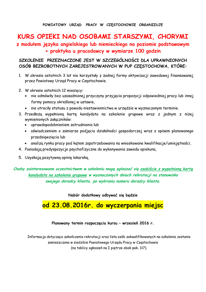 POWIATOWY URZĄD PRACY W CZĘSTOCHOWIE ORGANIZUJE KURS OPIEKI NAD OSOBAMI STARSZYMI, CHORYMI z modułem języka angielskiego lub niemieckiego na poziomie podstawowym + praktyka u pracodawcy w wymiarze 100 godzin SZKOLENIE PRZEZNACZONE JEST W SZCZEGÓLNOŚCI DLA UPRAWNIONYCH OSÓB BEZROBOTNYCH ZAREJESTROWANYCH W PUP CZĘSTOCHOWA, KTÓRE: 1. W okresie ostatnich 3 lat nie korzystały z żadnej formy aktywizacji zawodowej finansowanej przez Powiatowy Urząd Pracy w Częstochowie. 2. W okresie ostatnich 12 miesięcy: nie odmówiły bez uzasadnionej przyczyny przyjęcia propozycji odpowiedniej pracy lub innej formy pomocy określonej w ustawie, nie utraciły statusu z powodu niestawiennictwa w urzędzie w wyznaczonym terminie. 3. Przedłożą wypełnioną kartę kandydata na szkolenie grupowe wraz z jednym z niżej wymienionych załączników: uprawdopodobnieniem zatrudnienia lub oświadczeniem o zamiarze podjęcia działalności gospodarczej wraz z opisem planowanego przedsięwzięcia lub analizą rynku pracy pod kątem zapotrzebowania na wnioskowane kwalifikacje/umiejętności, 4. Posiadają predyspozycje psychofizyczne do wykonywania zawodu opiekuna, 5. Uzyskają pozytywną opinię lekarską. Osoby zainteresowane uczestnictwem w szkoleniu mogą zgłaszać się osobiście z wypełnioną kartą kandydata na szkolenie grupowe w wyznaczonych dniach rekrutacji na stanowisko swojego doradcy klienta, po wybraniu numeru doradcy klienta. Nabór dodatkowy odbywać się będzie od 23.08.2016r. do wyczerpania miejsc Planowany termin rozpoczęcia kursu – wrzesień 2016 r. Informacja dotycząca zakończenia rekrutacji oraz lista osób zakwalifikowanych na szkolenie zostanie zamieszczona w siedzibie Powiatowego Urzędu Pracy w Częstochowie (na tablicy ogłoszeń na I piętrze obok pok. 117).