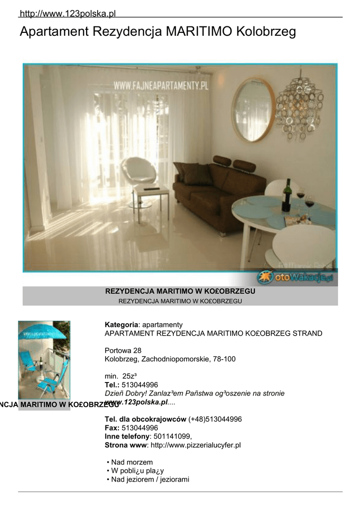 http://www.123polska.pl Apartament Rezydencja MARITIMO Kolobrzeg REZYDENCJA MARITIMO W KO£OBRZEGU REZYDENCJA MARITIMO W KO£OBRZEGU Kategoria: apartamenty APARTAMENT REZYDENCJA MARITIMO KO£OBRZEG STRAND Portowa 28 Kolobrzeg, Zachodniopomorskie, 78-100 min. 25z³ Tel.: 513044996 Dzieñ Dobry! Zanlaz³em Pañstwa og³oszenie na stronie www.123polska.pl.... NCJA MARITIMO W KO£OBRZEGU Tel. dla obcokrajowców (+48)513044996 Fax: 513044996 Inne telefony: 501141099, Strona www: http://www.pizzerialucyfer.pl • Nad morzem • W pobli¿u pla¿y • Nad jeziorem / jeziorami http://www.123polska.pl • W centrum miasta • Nad rzek± • Przy g³ównej drodze • W miejscowo¶ci uzdrowiskowej Rabaty/Promocje: -Dla sta³ych go¶ci rabaty!-Dla pobytów powy¿ej 7 dni ceny negocjowane!Cena:-Czerwiec/Wrzesieñ 180 z³ doba-Lipiec/Sierpieñ 290 z³ doba-Pa¼dziernikPROMOCJA!!! 99 z³ YDENCJA MARITIMO W KO£OBRZEGU doba-ListopadPROMOCJA!!! 99 z³ doba-GrudzieñPROMOCJA!!! 99 z³ doba-StyczeñPROMOCJA!!! 99 z³ dobaTelefon kontaktowy 512013989www.otowakacje.pl/kolobrzeg-apartament-rezydencja-maritim o-kolobrzeg-strand-id290634 Standard obiektu (ilo¶æ gwiazdek): ***** Obiekt: ca³oroczny Pe³en opis obiektu YDENCJA MARITIMO W KO£OBRZEGU REZYDENCJA MARITIMO W KO£OBRZEGUIch_spreche_Deutsch.Wenn_es_irgendwelche_Fragen_r ufen_Sie_bitte.Auf_alle_Ihre_Fragen_beantworten!Tel.513044996Ul.Port owa 28 Ko³obrzegApartament (dwu pokojowy) 4 osobowy w odleg³o¶ci oko³o 100 metrów od pla¿y i latarni morskiej.Rezydencja MARITIMO jest usytuowana w samym sercu miasta, którym jest Ko³obrzeski Port. W s±siedztwie zielonych parków, uroczych knajpek z ogródkami, restauracji, najlepszych sma¿alni ryb, salonów z bi¿uteri±, zak³adów YDENCJA MARITIMO W KO£OBRZEGU kosmetycznych, spa, gabinetów fizykoterapii oraz salonów fryzjerskich.Zaledwie 100m do Latarni Morskiej i miejskiej pla¿y.Ta doskona³a lokalizacja przypadnie do gustu mi³o¶nikom morskich klimatów, piêknych widoków i pla¿owania.Do centrum miasta zaledwie 10 minut spacerem przez parki z uroczymi fontannami.Wyposa¿enie:Salon wyposa¿ony w komfortowe meble, po³±czony z aneksem kuchennym. Zabudowany, nowoczesny aneks wyposa¿ony jest w niezbêdne naczynia, lodówkê, zmywarkê, p³ytê ceramiczn±, kuchenkê mikrofalow±, ekspres do kawy, czajnik bezprzewodowy. Dope³nieniem czê¶ci kuchennej jest stó³ i cztery krzes³a. W pokoju znajduje siê rozk³adana sofa, fotel, stolik kawowy, ENCJA MARITIMO W KO£OBRZEGU telewizor SONY Led.z przegl±darka internetowa.Darmowy internet!Dostêp do telewizji satelitarnej.W sypialni ³o¿e 2-osobowe, komoda z szufladami.W ³azience toaleta, prysznic, umywalka,suszarka do w³osów. W przedpokoju przestronna, zabudowana szafa na ubrania.Z ka¿dego pokoju jest wyj¶cie na balkon.Dodatkowo w wyposa¿eniu apartamentu: ¿elazko, deska do prasowania, suszarka do ubrañ, sprzêt pla¿owy. Na naszych najm³odszych go¶ci czekaj± ³ó¿eczka turystyczne i foteliki do karmienia.Jasne kolory mieszkania w po³±czeniu z morskim YDENCJA MARITIMO W KO£OBRZEGU turkusem tworz± niepowtarzaln± wakacyjn± atmosferê i relaksuj±cy klimat podczas wypoczywania.Naszym go¶ciom zapewniamy po¶ciel oraz rêczniki.W pobli¿u znajduje siê parking strze¿ony od 15-30 z³ /dobê-Dla sta³ych go¶ci rabaty!-Dla pobytów powy¿ej 7 dni ceny negocjowane!Cena:-Czerwiec/Wrzesieñ 180 z³ doba-Lipiec/Sierpieñ 290 z³ doba-Pa¼dziernikPROMOCJA!!! 99 z³ doba-ListopadPROMOCJA!!! 99 z³ doba-GrudzieñPROMOCJA!!! 99 z³ doba-StyczeñPROMOCJA!!! 99 z³ dobaTelefon kontaktowy 512013989www.otowakacje.pl/kolobrzeg-apartament-rezydencja-maritim http://www.123polska.pl o-kolobrzeg-strand-id290634 YDENCJA MARITIMO W KO£OBRZEGU Oferowane pokoje: 2-osobowe: 2 pokoi(-je) Ilo¶æ Apartamentów: 1 Cena za ca³o¶æ: Cena za dobê (za ca³o¶æ): 99 z³ Ca³kowieta ilo¶c miejsc noclegowych: ok. 4 Cena za osobê (w SEZONIE): w pokoju 2-osob: 25 z³ Cennik: inne -Dla sta³ych go¶ci rabaty!-Dla pobytów powy¿ej 7 dni ceny negocjowane!Cena:-Czerwiec/Wrzesieñ 180 z³ doba-Lipiec/Sierpieñ 290 z³ doba-Pa¼dziernikPROMOCJA!!! 99 z³ doba-ListopadPROMOCJA!!! 99 z³ doba-GrudzieñPROMOCJA!!! 99 z³ doba-StyczeñPROMOCJA!!! 99 z³ dobaTelefon kontaktowy 512013989www.otowakacje.pl/kolobrzeg-apartament-rezydencja-maritim o-kolobrzeg-strand-id290634 Wy¿ywienie: • Mo¿liwo¶æ zorganizowania obiadów (w innym obiekcie) • Aneks kuchenny w pokojach/domkach Na terenie obiektu: • basen kryty • sauna • jakuzzi • salon odnowy biologicznej • solarium • parking Pozosta³e: • obiekt dostosowany dla turystów niepe³nosprawnych • zakaz palenia w ca³ym obiekcie • mówimy po niemiecku W KA¯DYM pokoju apartamencie domku: • toaleta • ³azienka • prysznic • aneks kuchenny • lodówka • czajnik elektryczny • garnki • podstawowe naczynia • sztuæce • telewizor • balkon • dostêp do internetu http://www.123polska.pl Opis otoczenia Apartament (dwu pokojowy) 4 osobowy w odleg³o¶ci oko³o 100 metrów od pla¿y i latarni morskiej.Rezydencja MARITIMO jest usytuowana w samym sercu miasta, którym jest Ko³obrzeski Port. W s±siedztwie zielonych parków, uroczych knajpek z ogródkami, restauracji, najlepszych sma¿alni ryb, salonów z bi¿uteri±, zak³adów kosmetycznych, spa, gabinetów fizykoterapii oraz salonów fryzjerskich.Zaledwie 100m do Latarni Morskiej i miejskiej pla¿y.Ta YDENCJA MARITIMO W KO£OBRZEGU doskona³a lokalizacja przypadnie do gustu mi³o¶nikom morskich klimatów, piêknych widoków i pla¿owania.Do centrum miasta zaledwie 10 minut spacerem przez parki z uroczymi fontannami. Atrakcje turystyczne: Latarnia morski i wiele innych. Dojazd: Prosty,kierunek port. do supermarketu / marketu: 010 km do morza: 0100 km do pla¿y strze¿onej: 0100 km szlaki turystyczne: 0100 km restauracje / kawiarnie / bary: 050 km dyskoteka / dancing / klub nocny: 0100 km s³u¿by medyczne: 0800 km poczta: 050 km bank / bankomat: 0