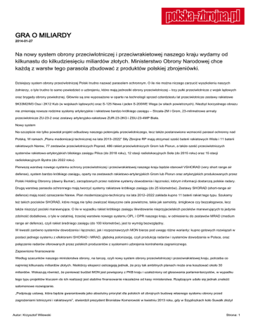 GRA O MILIARDY 2014-01-27 Na nowy system obrony przeciwlotniczej i przeciwrakietowej naszego kraju wydamy od kilkunastu do kilkudziesięciu miliardów złotych. Ministerstwo Obrony Narodowej chce każdą z warstw tego parasola zbudować z produktów polskiej zbrojeniówki. Dzisiejszy system obrony przeciwlotniczej Polski trudno nazwać parasolem ochronnym. O ile nie można niczego zarzucić wyszkoleniu naszych żołnierzy, o tyle trudno to samo powiedzieć o uzbrojeniu, które mają jednostki obrony przeciwlotniczej – trzy pułki przeciwlotnicze z wojsk lądowych oraz brygady obrony powietrznej. Głównie są one wyposażone w oparte na technologii sprzed czterdziestu lat przeciwlotnicze zestawy rakietowe 9K33M2/M3 Osa i 2K12 Kub (w wojskach lądowych) oraz S-125 Newa i jeden S-200WE Wega (w siłach powietrznych). Niezbyt korzystnego obrazu nie zmieniają nowsze rodzime systemy artyleryjskie i rakietowe bardzo krótkiego zasięgu – Strzała-2M i Grom, 23-milimetrowe armaty przeciwlotnicze ZU-23-2 oraz zestawy artyleryjsko-rakietowe ZUR-23-2KG i ZSU-23-4MP Biała. Nowy system Na szczęście nie tylko powstał projekt odbudowy naszego potencjału przeciwlotniczego, lecz także postanowiono wzmocnić parasol ochronny nad Polską. W ramach „Planu modernizacji technicznej na lata 2013–2022” Siły Zbrojne RP mają otrzymać sześć baterii rakietowych Wisła i 11 baterii rakietowych Narew, 77 zestawów przeciwlotniczych Poprad, 486 rakiet przeciwlotniczych Grom lub Piorun, a także sześć przeciwlotniczych systemów rakietowo-artyleryjskich bliskiego zasięgu Pilica (do 2018 roku), 12 stacji radiolokacyjnych Soła (do 2015 roku) oraz 15 stacji radiolokacyjnych Bystra (do 2022 roku). Pierwszą warstwę nowego systemu ochrony przeciwlotniczej i przeciwrakietowej naszego kraju będzie stanowił VSHORAD (very short range air defense), system bardzo krótkiego zasięgu, oparty na zestawach rakietowo-artyleryjskich Grom lub Piorun oraz artyleryjskich produkowanych przez Polski Holding Obronny (dawny Bumar), zarządzanych przez rodzime systemy dowodzenia i łączności, którym informacji dostarczą polskie radary. Drugą warstwę parasola ochronnego mają tworzyć systemy rakietowe krótkiego zasięgu (do 25 kilometrów). Zestawy SHORAD (short-range air defence) mają nosić oznaczenie Narew. Plan modernizacyjno-techniczny na lata 2012–2022 zakłada kupno 11 baterii rakiet tego typu. Szukamy też takich pocisków SHORAD, które mogą nie tylko zwalczać klasyczne cele powietrzne, takie jak samoloty, śmigłowce czy bezzałogowce, lecz także niszczyć pociski manewrujące. O ile w wypadku rakiet krótkiego zasięgu likwidowanie nieprzyjacielskich pocisków manewrujących to jedynie zdolność dodatkowa, o tyle w ostatniej, trzeciej warstwie nowego systemu OPL i OPR naszego kraju, w odniesieniu do zestawów MRAD (medium range air defence), czyli rakiet średniego zasięgu (do 100 kilometrów), jest to wymóg bezwzględny. W kwestii zarówno systemów dowodzenia i łączności, jak i rozpoznawczych MON bierze pod uwagę różne warianty: kupno gotowych rozwiązań w postaci jednego systemu z efektorami SHORAD i MRAD, głęboką polonizację, czyli produkcję radarów i systemów dowodzenia w Polsce, oraz połączenie radarów oferowanych przez polskich producentów z systemami uzbrojenia kontrahenta zagranicznego. Zapewnione finansowanie Według szacunków naszego ministerstwa obrony, na tarczę, czyli nowy system obrony przeciwlotniczej i przeciwrakietowej kraju, potrzeba co najmniej kilkunastu miliardów złotych. Niektórzy eksperci ostrzegają jednak, że przy tak ambitnych planach może ona kosztować około 30 miliardów. Wskazują również, że ponieważ budżet MON jest powiązany z PKB kraju i uzależniony od głosowania parlamentarzystów, w wypadku tego typu projektów kluczem do ich realizacji jest stabilne finansowanie niezależne od kasy ministerstwa. Rządzącym udało się jednak znaleźć salomonowe rozwiązanie. „Podpisuję ustawę, która będzie gwarantowała jako absolutny priorytet dla polskich sił zbrojnych budowę własnego systemu obrony przed zagrożeniami lotniczymi i rakietowymi”, stwierdził prezydent Bronisław Komorowski w kwietniu 2013 roku, gdy w Szypliszkach koło Suwałk złożył Autor: Krzysztof Wilewski Strona: 1 podpis pod nowelizacją ustawy o modernizacji technicznej i finansowaniu sił zbrojnych. Wprowadziła ona wymóg, że w ramach 1,95 procent PKB, który co roku w budżecie państwa jest zapisywany na obronność, kwoty wynikające ze wzrostu gospodarczego muszą być przeznaczane na wyposażenie wojska w środki obrony przeciwrakietowej i przeciwlotniczej. Przyjmując jako wyznacznik budżet MON z 2013 roku, na OPL i OPR resort obrony musi przeznaczyć około pięciu procent ze swoich środków. Szansa dla Polski Zarówno prezydent RP Bronisław Komorowski, jak i premier Donald Tusk oraz minister obrony narodowej Tomasz Siemoniak podkreślają, że w naszym interesie jest, aby przy tak dużych wydatkach na zbrojenia jak najwięcej pieniędzy zostało w Polsce. O ile jednak w wypadku systemów VSHORAD już wiadomo, że będą to rodzime rozwiązania, ponieważ będziemy kontynuowali zakupy już wprowadzonego do służby uzbrojenia tego typu, o tyle zestawy SHORAD i MRAD musimy pozyskać w sposób gwarantujący każdej zainteresowanej firmie możliwość zdobycia lukratywnego kontraktu, ale bez łamania unijnych przepisów, takich jak dyrektywa 2009/81/WE. Aby chronić polskie interesy, Ministerstwo Obrony Narodowej jako wymóg bezwzględny stawia ewentualnym kontraktorom polonizację i transfer technologii do naszego kraju (i rodzimych firm). Latem 2013 roku Inspektorat Uzbrojenia MON w ramach dialogu technicznego zaprosił producentów zestawów rakietowych średniego zasięgu do rozmów na ten temat. „Celem dialogu technicznego jest zidentyfikowanie uwarunkowań związanych z ewentualnym transferem wiedzy, technologii oraz produkcji 
