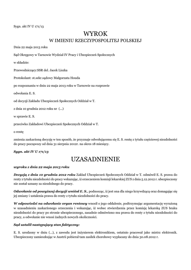 Sygn. akt IV U 171/13 WYROK W IMIENIU RZECZYPOSPOLITEJ POLSKIEJ Dnia 22 maja 2013 roku Sąd Okręgowy w Tarnowie Wydział IV Pracy i Ubezpieczeń Społecznych w składzie: Przewodniczący:SSR del. Jacek Liszka Protokolant: st.sekr.sądowy Małgorzata Houda po rozpoznaniu w dniu 22 maja 2013 roku w Tarnowie na rozprawie odwołania E. S. od decyzji Zakładu Ubezpieczeń Społecznych Oddział w T. z dnia 10 grudnia 2012 roku nr (...) w sprawie E. S. przeciwko Zakładowi Ubezpieczeń Społecznych Oddział w T. o rentę zmienia zaskarżoną decyzję w ten sposób, że przyznaje odwołującemu się E. S. rentę z tytułu częściowej niezdolności do pracy począwszy od dnia 31 sierpnia 2012r. na okres 18 miesięcy. Sygn. akt IV U 171/13 UZASADNIENIE wyroku z dnia 22 maja 2013 roku Decyzją z dnia 10 grudnia 2012 roku Zakład Ubezpieczeń Społecznych Oddział w T. odmówił E. S. prawa do renty z tytułu niezdolności do pracy wskazując, iż orzeczeniem komisji lekarskiej ZUS z dnia 5.12.2012 r. ubezpieczony nie został uznany za niezdolnego do pracy. Odwołanie od powyższej decyzji wniósł E. S., podnosząc, iż jest ona dla niego krzywdzącą oraz domagając się jej zmiany i ustalenia prawa do renty z tytułu niezdolności do pracy. W odpowiedzi na odwołanie organ rentowy wnosił o jego oddalenie, podtrzymując argumentację wyrażoną w uzasadnieniu zaskarżonego orzeczenia i wskazując, iż wobec stwierdzenia przez komisję lekarską ZUS braku niezdolności do pracy po stronie ubezpieczonego, zasadnie odmówiono mu prawa do renty z tytułu niezdolności do pracy, a odwołanie nie wnosi żadnych nowych okoliczności. Sąd ustalił następujący stan faktyczny: E. S. urodzony w dniu (...), z zawodu jest inżynierem elektronikiem, ostatnio pracował jako mistrz elektronik. Ubezpieczony zamieszkując w Austrii pobierał tam zasiłek chorobowy wypłacany do dnia 30.08.2012 r. Dowód: - akta ZUS, - zaświadczenia instytucji austriackich stwierdzające pobieranie zasiłku chorobowego – k. 25, 29. W dniu 10.04.2012 roku ubezpieczony wystąpił z wnioskiem do ZUS o ustalenie prawa do renty z tytułu niezdolności do pracy. Zarówno orzeczeniem lekarza orzecznika ZUS z dnia 27.08.2012 r., jak i orzeczeniem komisji lekarskiej ZUS z dnia 5.12.2012 r. ubezpieczony nie został uznany za niezdolnego do pracy w wyniku czego ZUS wydał decyzję z dnia 10.12.2012 r. odmawiającą wnioskodawcy prawa do renty. Od tej decyzji ubezpieczony złożył odwołanie. Dowód: akta ZUS W toku niniejszego postępowania sądowego u odwołującego się stwierdzono: - ciężkie zwężenie zastawki aortalnej, - stan po leczeniu czerniaka skóry (operacji i terapii interferonem). Badany z ciężką stenozą zastawki aortalnej, z maksymalnym gradientem przez zastawkowym 75 mm Hg oraz łagodną niedomykalnością aortalną. W badaniu echokardiograficznym wykonanym w dniu 5.12.2012 r. opisano masywne zwapnienie płatków zastawki aortalnej, z dużym zwężeniem lewego ujścia tętniczego dającym maksymalny gradient przez zastawkowy 75 mm Hg oraz przerost lewej komory serca. Należy przy tym zaznaczyć, że maksymalny gradient przez zastawkowy powyżej 64 mm Hg uznawany jest za wskaźnik ciężkiego zwężenia zastawki aortalnej i wskazanie do zabiegu operacyjnego wymiany zastawki. Chory po operacji czerniaka złośliwego skóry pleców i po terapii interferonowej związanej z licznymi efektami ubocznymi. W czasie leczenia występowały bóle stawów, mięśni, osłabienie i gorączka. Występujące u odwołującego schorzenia naruszają sprawność jego organizmu w stopniu powodującym częściową niezdolność do pracy na okres 18 miesięcy od daty wyczerpania zasiłku chorobowego. Dowód: - opinia sądowo – lekarska z dnia 12.03.2013 r. – k. 12-13, - dokumentacja medyczna – k. 10-11, - dokumentacja lekarska – akta ZUS. Sąd, ustalając stan faktyczny niniejszej sprawy, podzielił w całości wnioski płynące z opinii biegłych lekarzy sądowych z zakresu kardiologii oraz z zakresu chorób wewnętrznych, którzy po osobistym przebadaniu ubezpieczonego oraz wnikliwej analizie dokumentacji zgromadzonej w aktach rentowych, przy wykorzystaniu fachowej wiedzy medycznej, dokonali prawidłowej diagnozy jego schorzeń. Opinia sporządzona została przez biegłych sądowych posiadających odpowiednie kwalifikacje oraz doświadczenie zawodowe, jest przy tym rzetelna, kompletna i wewnętrznie spójna. Odnosząc się do zarzutów zgłoszonych przez ZUS w piśmie z dnia 15.04.2013 r. (akta sądowe k. 26-27) do powyższej opinii biegłych sądowych należy stwierdzić, iż były one niezasadne i w żaden sposób nie podważyły wartości dowodowej opinii. Przede wszystkim nie miały one charakteru merytorycznego, a podniesiono w nich jedynie, iż w postępowaniu orzeczniczym w ZUS nie dysponowano wynikiem badania echa serca z dnia 5.12.2012 r. Powyższa okoliczność nie ma jednak znaczenia dla niniejszego postępowania, bowiem skoro zaskarżona decyzja ZUS jest datowana na dzień 10.12.2012 r. (a więc już po przedmiotowym badaniu) brak podstaw do traktowania tego badania jako nowej okoliczności w sprawie po myśli art. 47714 § 4 kpc. Opinia spełniła nadto wymogi przewidziane dla tego rodzaju środków dowodowych określone w art.278 kpc i art.285 kpc, zaś w toku postępowania nie ujawniły się żadne okoliczności, które mogłyby podważać zaufanie do wiedzy czy bezstronności biegłych. Dowody z dokumentów zalegających w aktach Zakładu Ubezpieczeń Społecznych nie budziły wątpliwości Sądu co do ich autentyczności, a ponadto nie były kwestionowane przez strony postępowania. Sąd Okręgowy rozważył, co następuje: Odwołanie zasługuje na uwzględnienie. Zgodnie art. 57 ust 1 ustawy z dnia 17 grudnia 1998 roku o emeryturach i rentach z Funduszu Ubezpieczeń Społecznych (tekst jedn. Dz.U. z 2009 roku, Nr 153, poz.1227 ze zmianami) renta z tytułu niezdolności do pracy przysługuje ubezpieczonemu, k