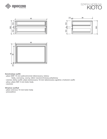 SZAFKA MOBILNA KIOTO Konstrukcja szafki - płyta MDF 19 mm jednostronnie lakierowana, kolory: biały, czerwony, czarny, lakier nawierzchniowy połyskowy - wieniec dolny szafki: płyta laminowana 18 mm lakierowana zgodnie z kolorem szafki - plecy: płyta HDF 4 mm kolor biały - zawiesie Wnętrze szuflad - płyta wiórowa 10 mm kolor biały - prowadnice