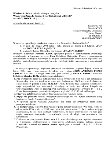 Gliwice, dnia 08.03.2004 roku Wiesław Strózik w imieniu własnym oraz jako Wiceprezes Zarządu Fundacji Kardiologicznej „SERCE” 44-100 GLIWICE, ul. (……..) Adres do wiadomości Redakcji ! Szanowny Pan Marek NYCZ Redaktor Naczelny Dziennika „Trybuna Śląska” ul. Młyńska 1 40-098 KATOWICE W związku z publikacją artykułów prasowych w Dzienniku „Trybuna Śląska”: 1. w dniu 10 lutego 2004 roku - jako anonsu do tekstu pod tytułem „DON ANTONIO PRZED SĄDEM” i 2. w dniu 13 lutego 2004 roku, pod tytułem „UPADŁY ANIOŁ” autorstwa Redaktora Marcina Króla, uprzejmie proszę o zamieszczenie poniższego oświadczenia w kierowanym przez Pana Redaktora Dzienniku. Proszę o umieszczenie oświadczenia w miejscu podobnym do miejsca zamieszczenia omawianych artykułów, bez skrótów i czcionką identyczną co do kształtu i wielkości jakie zastosowano w omawianych tekstach. „...W związku z publikacją artykułów prasowych w Dzienniku „Trybuna Śląska” w dniu 10 lutego 2004 roku - jako anonsu do tekstu pod tytułem „DON ANTONIO PRZED SĄDEM” i w dniu 13 lutego 2004 roku, pod tytułem „UPADŁY ANIOŁ” autorstwa Redaktora Marcina Króla, niniejszym oświadczam: 1. Nie wyraziłem zgody na publikowanie moich wypowiedzi bez mojej ich autoryzacji. Stanowisko takie przekazałem w rozmowie Redaktorowi Królowi oraz Redaktorowi Naczelnemu w piśmie z dnia 11.02.2004 roku. Pomimo tego Dziennik opublikował moje wypowiedzi bez autoryzacji, wkładając w moje usta słowa, których nie wypowiedziałem. Jest to przestępstwo naruszające dyspozycję artykułu 14 § 1 i 2 Prawa Prasowego oraz pomówienie ścigane z artykułu 212 § 2 Kodeksu Karnego. 2. Nigdy nie pełniłem obowiązków Przewodniczącego Fundacji Serce. 3. Nigdy nie pełniłem funkcji wiceprzewodniczącego ani nie byłem członkiem Rady Nadzorczej Spółki Akcyjnej „Grudynia”. 4. W sprawie Spółki Akcyjnej „Grudynia” nie toczy się przeciwko mnie żadne postępowanie karne. 5. To postępowanie, o którym Pan Redaktor pisze dotyczy zdarzeń z 1993 roku, toczy się od kwietnia 1996, a nie od 1997 roku, więc już prawie osiem !!! lat i czekam na jego zakończenie, bo nie mam żadnych wątpliwości, że będę uniewinniony. Na tym jego etapie zasadność wszczęcia i prowadzenia przez tak długi czas pozostawię bez komentarza. 6. Ponieważ to postępowanie karne trwa i do dnia dzisiejszego nie wydano orzeczenia w I instancji, opublikowanie w omawianych artykułach mojego pełnego imienia i nazwiska stanowi naruszenie prawa wynikające z artykułu 13 § 1 i 2 Prawa Prasowego. 7. Użycie w artykule podtytułu „...Podwójne życie fundacji...” jest pomówieniem. Fundacja Kardiologiczna SERCE nigdy nie prowadziła działalności, która mogłaby być dwuznacznie interpretowana. 8. Fundacja Kardiologiczna SERCE nigdy nie pokrywała kosztów leczenia obcokrajowców przebywających w Śląskim Centrum Chorób Serca, a wcześniej Wojewódzkim Ośrodku Kardiologii w Zabrzu. 9. Pan Profesor Stanisław P. nigdy nie podpisywał w imieniu Fundacji Kardiologicznej SERCE żadnych rachunków. 10. Fundacja Kardiologiczna SERCE nigdy nie przesyłała żadnych rachunków do firm ubezpieczeniowych. 11. Żadne firmy ubezpieczeniowe nie przelały na konto Fundacji Kardiologicznej SERCE żadnych pieniędzy. 12. Wyliczenia rzekomo otrzymanych wpływów w wysokości 20 tysięcy marek za leczenie, które miało kosztować 1 tysiąc złotych to zwykła szkalująca Fundację Kardiologiczną SERCE beletrystyka wyczerpująca znamiona pomówienia. 13. Prokuratura Rejonowa w Zabrzu nigdy nie prowadziła śledztwa przeciwko Fundacji Kardiologicznej SERCE, ani w tej sprawie, ani w żadnej innej. 14. Nie można było dopatrywać się znamion przestępstwa, ani z tego powodu umarzać rzekomo prowadzonego postępowania, bo go nie było. 15. Fundacja Kardiologiczna SERCE nigdy nie zaciągała żadnych kredytów pod zastaw posiadanych nieruchomości. 16. Nieprawdą jest, że w ten sposób pozbyła się budynku w Zabrzu przy ulicy Knurowskiej. 17. Nieprawdą jest, że „...Fundacja nie spłacała kredytu, więc bank zajął nieruchomość i wystawił na sprzedaż...”. Żaden bank ani pod tę nieruchomość, ani pod żadną inną nie udzielał Fundacji Kardiologicznej SERCE żadnego kredytu. Tylko dlatego do dziś nie wiadomo na jakie cele przeznaczone zostały rzekome pieniądze. 18. Nigdy nie byłem oskarżony o przywłaszczenie wyposażenia magazynu stanowiącego majątek firmy VIDEOCOM. Wyposażenie dwóch oddzielnych magazynów oraz nazwę i logo firmy VIDEOCOM jako prawa niemajątkowe sprzedałem do Gliwickiego Centrum Kapitałowego jako firmy leasingowej, która następnie wyleasingowała te wartości dwóm innym podmiotom gospodarczym. Zarzuty stawiane przez Prokuraturę okazały się całkowicie bezzasadne w związku z tym zapadł wyrok uniewinniający. 19. Nigdy nie wyłudziłem od Spółki VIPRO żadnych pieniędzy. Nigdy nie posługiwałem się podrobionymi dokumentami. W tej sprawie również zapadł wyrok uniewinniający. Osoba, która wspólnie z Policją i Prokuraturą pomawiała mnie o te czyny, pomimo popełnienia szeregu przestępstw przeciwko wymiarowi sprawiedliwości ściganych w trybie oskarżenia publicznego nigdy nie stanęła przed obliczem Temidy. Nieudolność czy celowe działanie ? 20. Nieprawdą jest, że krótko po tej sprawie dostałem posadę w radzie nadzorczej Spółki Grudynia i nieprawdą jest, że zasiadałem w niej niecałe dwa lata. Ani nie otrzymałem takiej posady, ani nie byłem członkiem tej rady. 21. W 1995 roku Fundacja Kardiologiczna SERCE sprowadziła z zagranicy System Monitoringu Kardiologicznego, który mógł ratować życie chorym z dolegliwościami serca. Środki przeznaczone na jego uruchomienie z naruszeniem prawa zostały Fundacji zajęte z tytułu niezapłaconego cła, z którego na podstawie obowiązujących przepisów Fundacja była zwolniona. Postępowanie toczy si