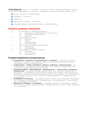 Informacja jest to wiadomość tworząca wiedzę odzwierciedlającą procesy i zdarzenia zachodzące w otoczeniu. Informacja w pracy biurowej powinna być: jasna, zwięzła i wyczerpująca, dokładna i rzetelna, kompletna, dostarczona szybko i terminowo, sklasyfikowana, zaewidencjonowana i przechowywana. Kryteria podziału informacji: 1. 2. 3. 4. Ze względu na sposób pozyskania: a) pierwotne niepodlegające rejestracji, b) pierwotne rejestrowane, c) zbiorcze. ze względu na formę: a) pisemne, b) ustne, c) telefoniczne, d) elektroniczne. ze względu na sposób przekazania: a) pośrednie, b) bezpośrednie. ze względu na sformalizowanie: a) formalne, b) pół-formalne, c) nieformalne. Przykład Załatwianie korespondencji: a) przyjmowanie informacji przychodzących z zewnątrz – pracownicy biurowi codziennie przyjmują informację w postaci pism przychodzących pocztą, telefaksem, pocztą elektroniczną, b) rozdzielanie i obieg informacji wewnątrz jednostki organizacyjnej – po rozdzieleniu, otrzymane pisma kierowane są do komórek organizacyjnych, a w nich do poszczególnych pracowników, c) ewidencjonowanie, opracowywanie, przetwarzanie i dostarczanie informacji kierownictwu – otrzymane pisma rejestrowane są w dzienniku podawczym w kancelarii, a następnie w dziennikach podawczych komórek organizacyjnych. Przekazane pisma pracownikom podlegają przez nich obróbce tj. przetwarzają je w projekty decyzji, które muszą być przedstawione do aprobaty przez kierownictwo, d) gromadzenie informacji – otrzymane pisma i kopie pism wysłanych gromadzone są w teczkach, skoroszytach, segregatorach i przechowywane u pracowników lub w zakładowym archiwum, e) wysyłanie informacji na zewnątrz – projekty decyzji po akceptacji przez kierowników komórek organizacyjnych formułowane są w pisma, które wysyłane są na zewnątrz. Informacja w procesie decyzyjnym Podejmowanie decyzji wariantów na podstawie i agregacji informacji: • • to dokonywanie wyboru jednego spośród wielu otrzymanych informacji, stąd potrzeba selekcji selekcja informacji polega na wybieraniu tylko potrzebnych informacji i jednoczesnym eliminowaniu zbędnych, agregacja informacji polega na łączeniu informacji pojedynczych w informacje zbiorcze. Proces decyzyjny 2. Decyzja 3. Polecenie 5. Kontrola 4. Działanie 1. Informacja Zasady obiegu pism Obieg pisma to jest droga od momentu wpływu do danej jednostki organizacyjnej do momentu załatwienia sprawy i wysłania odpowiedzi. Czynności związane z obiegiem pism wykonują pracownicy róŜnych komórek organizacyjnych. Komórki te nazywane są punktami zatrzymania. Typowe punkty zatrzymania: ✔ ✔ ✔ ✔ ✔ ✔ kancelaria ogólna, sekretariat, szef jednostki organizacyjnej, kierownik komórki organizacyjnej, pracownik załatwiający sprawę, aprobant. Informacja w procesie decyzyjnym Kierownik pionowo w dół np. polecenia, instrukcje, wytyczne pionowo w górę np. sprawozdania, raporty, notatki Wykonawca na tym samym poziomie Wykonawca Czynności związane z obiegiem pism dzielimy na trzy fazy: ✔ przyjmowanie pism, ✔ rozdzielanie i rozpatrywanie pism, ✔ wysyłanie pism. Elementy racjonalnego obiegu pism: ✔ ✔ ✔ ✔ liczba punktów zatrzymania powinna być jak najmniejsza i ograniczona do niezbędnych, droga obiegu pisma jak najkrótsza, pismo powinno przechodzić przez dany punkt zatrzymania tylko raz, czas wykonywania czynności manipulacyjnych skrócony dzięki korzystaniu ze środków technicznych, ✔ pracownicy o wysokich kwalifikacjach, ✔ właściwy podział zadań i obowiązków.