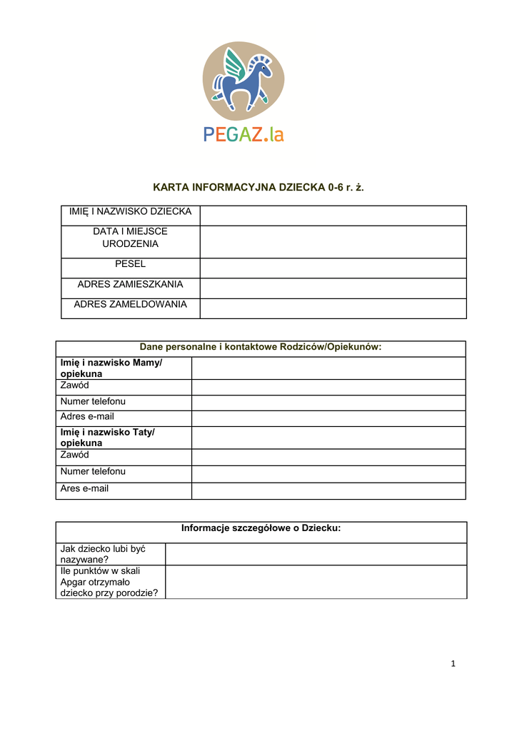KARTA INFORMACYJNA DZIECKA 0-6 r. ż. IMIĘ I NAZWISKO DZIECKA DATA I MIEJSCE URODZENIA PESEL ADRES ZAMIESZKANIA ADRES ZAMELDOWANIA Dane personalne i kontaktowe Rodziców/Opiekunów: Imię i nazwisko Mamy/ opiekuna Zawód Numer telefonu Adres e-mail Imię i nazwisko Taty/ opiekuna Zawód Numer telefonu Ares e-mail Informacje szczegółowe o Dziecku: Jak dziecko lubi być nazywane? Ile punktów w skali Apgar otrzymało dziecko przy porodzie? 1 Czy ciąża przebiegała prawidłowo? Tak Nie (proszę podać przebyte choroby) Czy poród odbył się bez komplikacji? Tak Nie (jakie komplikacje?) Czy dziecko było karmione naturalnie? Tak (jak długo?) Nie Tak (w jakim wieku?) Nie Tak Nie Czy dziecko ma rodzeństwo? Czy dziecko chodziło do żłobka? Czy dziecko miało/ma kontakty z rówieśnikami? Jak dziecko reaguje na rozstanie z rodzicami? Dziecko jest : Czy dziecko ma wadę wzroku? Czy dziecko śpi w ciągu dnia? Tak, często Tak, rzadko Praworęczne Nie Leworęczne Tak (Jaką? Czy zalecane jest noszenie okularów?) Nie Tak (W jakich godzinach?) Nie Dziecko (proszę wskazać odpowiedzi): Potrafi samo się ubrać. Ubiera się z niewielką pomocą osób dorosłych. Konieczna jest pomoc przy ubieraniu. Samo radzi sobie z jedzeniem. Trzeba je karmić. Praktycznie je wszystko, nie ma specjalnych upodobań. Jest wiele potraw, które dziecko nie lubi i nie chce jeść, np. Zalecenia odnośnie postępowania z dzieckiem: Pamięta o potrzebach fizjologicznych i radzi sobie samo. Zapomina o zgłaszaniu potrzeb fizjologicznych (trzeba je pilnować). 2 Dziecko: Interesuje się: Jakie sytuacje edukacyjnowychowawcze do tej pory przysparzały dziecku najwięcej trudności? Lubi bawić się (czym? w jaki sposób?) Proszę opisać sytuacje, których dziecko nie lubi, bądź się boi. Jakie stosują Państwo metody uspokajania w takich sytuacjach? Czy dziecko często choruje? Tak (na co?) Nie Tak (jakiego?) Nie Tak (na co jest uczulone?) Nie Poważne przebyte choroby: Czy dziecko jest pod stałą opieką specjalisty ? Czy dziecko jest alergikiem? Inne ważne informacje o dziecku, które chcą Państwo nam przekazać: Czy dziecko posiada: Orzeczenie o niepełnosprawności. Tak ( w jakim zakresie?) Nie Opinia o potrzebie wczesnego wspomagania rozwoju. Orzeczenie o kształceniu specjalnym. Tak (w jakim zakresie?) Nie Tak Nie 3 W jakich godzinach pasuje Państwu przyprowadzanie dziecka na zajęcia terapeutyczne? Dodatkowe informacje Prosimy o wypisanie osób upoważnionych do odbioru Dziecka z Poradni PEGAZ (imię i nazwisko, stopień pokrewieństwa, numer dowodu osobistego): …………………………………………………………………………………………………………… …………………………………………………………………………………………………………… …………………………………………………………………………………………………………… …………………………………………………………………………………………………………… Data......................................... Czytelny podpis rodziców................................................... Oświadczam, że przedłożone przeze mnie informacje są zgodne ze stanem faktycznym i wyrażam zgodę na przetwarzanie moich i mojego dziecka danych osobowych przez Grupę Edukacyjną Edu-Art Sp. z o.o. z siedzibą w Gdyni przy ul. Koperkowej 2/AB, w celu przetwarzania ich na potrzeby pedagogiczne i edukacyjne, na potrzeby świadczenia usług firmy, w tym do celów marketingowo-reklamowych związanych z ofertami Grupy Edukacyjnej Edu-Art. Sp. z o.o. i podmiotów współpracujących. PO ZAKWALIFIKOWANIU SIĘ DZIECKA DO PORADNI PEGAZ.LA ZOBOWIĄZUJE SIĘ DO: 1. Przestrzegania postanowień statutu poradni. 2. Podawania do wiadomości Poradni wszelkich zmian w podanych wyżej informacjach. 3. Przyprowadzania do poradni tylko zdrowego dziecka. 4. Przyprowadzania i odbierania dziecka z w godzinach ustalonych wraz z specjalistą prowadzącym zajęcia. Data......................................... Czytelny podpis rodziców ................................................... Serdecznie dziękujemy za wypełnienie ankiety oraz prosimy o Państwa sugestie i uwagi, które posłużą usprawnieniu pracy Poradni. 4 5