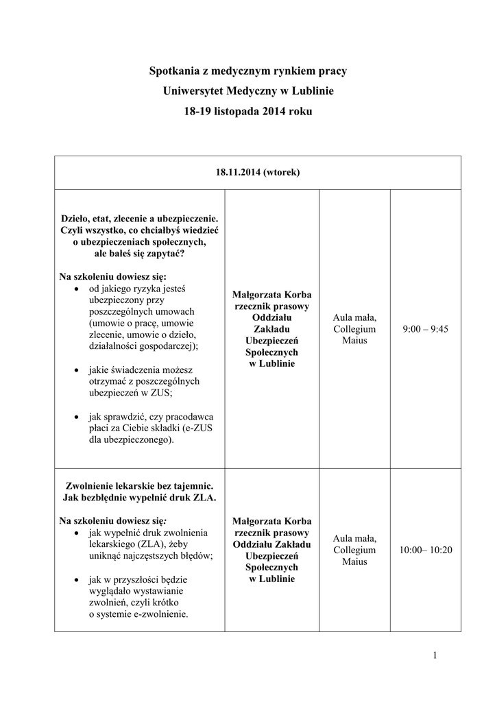 Spotkania z medycznym rynkiem pracy Uniwersytet Medyczny w Lublinie 18-19 listopada 2014 roku 18.11.2014 (wtorek) Dzieło, etat, zlecenie a ubezpieczenie. Czyli wszystko, co chciałbyś wiedzieć o ubezpieczeniach społecznych, ale bałeś się zapytać? Na szkoleniu dowiesz się: od jakiego ryzyka jesteś ubezpieczony przy poszczególnych umowach (umowie o pracę, umowie zlecenie, umowie o dzieło, działalności gospodarczej); jakie świadczenia możesz otrzymać z poszczególnych ubezpieczeń w ZUS; jak sprawdzić, czy pracodawca płaci za Ciebie składki (e-ZUS dla ubezpieczonego). Małgorzata Korba rzecznik prasowy Oddziału Zakładu Ubezpieczeń Społecznych w Lublinie Aula mała, Collegium Maius 9:00 – 9:45 Małgorzata Korba rzecznik prasowy Oddziału Zakładu Ubezpieczeń Społecznych w Lublinie Aula mała, Collegium Maius 10:00– 10:20 Zwolnienie lekarskie bez tajemnic. Jak bezbłędnie wypełnić druk ZLA. Na szkoleniu dowiesz się: jak wypełnić druk zwolnienia lekarskiego (ZLA), żeby uniknąć najczęstszych błędów; jak w przyszłości będzie wyglądało wystawianie zwolnień, czyli krótko o systemie e-zwolnienie. 1 Pielęgniarka/pielęgniarz i położna – czy te zawody mają przyszłość? Na spotkaniu porozmawiamy na temat: dyplom i co dalej? – kształcenie podyplomowe; czy i jakie specjalizacje mają przyszłość konkurencyjność zawodu pielęgniarki i położnej w Unii Europejskiej. Andrzej Tytuła Przewodniczący Okręgowej Rady Pielęgniarek i Położnych w Lublinie Aula mała, Collegium Maius 10:30 – 11:30 Niemożliwe? Choroby zawodowe u pracowników służby zdrowia Na warsztacie dowiesz się: czym jest choroba zawodowa; kiedy możesz się ubiegać o stwierdzenie choroby zawodowej; badania profilaktyczne pracownika a czynniki szkodliwe występujące w środowisku pracy; czy każdy pracownik podlega takim samym badaniom profilaktycznym; najczęściej występujące choroby zawodowe u pracowników służby zdrowia na terenie województwa lubelskiego; czy można zapobiegać chorobom zawodowym, a jeśli tak, to w jaki sposób. Przedstawiciel Wojewódzkiej Stacji SanitarnoEpidemiologicznej w Lublinie Aula mała, Collegium Maius 11:30 – 12:30 2 „Staż lekarski bez tajemnic” Uczestnicząc w spotkaniu dowiesz się: jakie są zadania NIL i okręgowych Izb Lekarskich, w szczególności związane z pracą młodych lekarzy i lekarzy stażystów; jakie są prawa i obowiązki lekarza i lekarza stażysty w stosunku do NIL i Okręgowych Izb Lekarskich; gdzie i do kogo zgłaszać się po pomoc/odpowiedź w razie problemów, które najczęściej dotyczą młodych lekarzy; w jakich terminach się zgłaszać, do kogo się udać, jakie dokumenty przygotować; kto i gdzie może odbywać staż na terenie województwa lubelskiego; jakie są najczęstsze błędy popełniane przez studentów i lekarzy stażystów podczas aplikowania na staż, a także w trakcie stażu i jak ich uniknąć; do kogo zgłaszać się w razie problemów związanych z odbywaniem stażu podyplomowego. Leszek Buk Wiceprezes Okręgowej Rady Lekarskiej, dr n.med. Monika Bojarska-Łoś Aula Rektorat, Al. Racławickie 1 15:00 – 16:30 Przedstawiciele Wydziału Zdrowia Lubelskiego Urzędu Wojewódzkiego Aula Rektorat, Al. Racławickie 1 16:30 – 18:00 Specjalizacja po kierunku lekarskim Zapraszamy studentów kierunku lekarskiego na spotkanie z przedstawicielami Wydziału Zdrowia Urzędu Wojewódzkiego w Lublinie. Spotkanie będzie rozwinięciem zeszłorocznego wydarzenia „Czy wierzysz w życie po studiach?”. 3 Dowiesz się wszystkiego o specjalizacjach modułowych, trybach odbywania specjalizacji, wymaganych dokumentach i najczęstszych błędach popełnianych podczas aplikowania na rezydenturę. „Porozmawiajmy o ERASMUSIE” Jeśli chcesz dowiedzieć się: o możliwościach jakie otwierają się przed stypendystami programu; jak udział w programach wymian zwiększa atrakcyjność uczestników na polskim i międzynarodowym rynku pracy; o perspektywach zatrudnienia w instytucjach, w których realizowana jest mobilność. Zapraszamy na spotkanie i do stoiska Justyna Warda UM w Lublinie Erasmus+ Zespół ds. Współpracy Będziecie mogli dowiedzieć się, z Zagranicą na czym polega program wymian międzynarodowych, kto może brać w nich udział oraz jakie są procedury aplikacyjne w naszej Uczelni. Przedstawimy również wachlarz możliwości, jakie daje udział w programie, które przekładają się na przyszłą karierę zawodową stypendystów. Sala 7, Katedra i Zakład Anatomii Prawidłowej Człowieka, Collegium Maius 13:15 – 14:00 Dajemy możliwość spotkania stypendystów programu LLP Erasmus, którzy podzielą się swoimi wrażeniami z odbytych studiów i praktyk oraz odpowiedzą na pytania związane z wyjazdem. Zapraszamy i liczymy na Waszą obecność! 4 Agencje zatrudnienia bez tajemnic, czyli jak korzystać z ich usług szukając pracy? Uczestnicząc w wykładzie dowiesz się: jaką pracę można znaleźć, korzystając z usług agencji zatrudnienia; kto płaci za takie usługi; czym kierować się przy wyborze agencji; jak sprawdzić, czy agencja działa legalnie? Anna Turska Wojewódzki Urząd Pracy w Lublinie Sala 6, Katedra i Zakład Anatomii Prawidłowej Człowieka, Collegium Maius Rada Doktorantów UM w Lublinie Sala 112, Katedra i Zakład Biofizyki, Collegium Maius 13:15 – 14:00 Jak skutecznie aplikować na studia doktoranckie? Uczestnicząc w spotkaniu dowiesz się: dlaczego warto i co oferuje UM w Lublinie swoim doktorantom; jak obecnie wygląda nabór; czego można się spodziewać; jak się przygotować; jakich błędów nie popełniać; ważne daty i „osoby ”; co po studiach doktoranckich. 12:00 – 13:00 Profesjonalne i praktyczne porady, z pierwszej ręki na temat różnych aspektów studiów doktoranckich w UM w Lublinie. Podczas konsultacji będzie można zapoznać się z doświadczeniami starszych kolegów i koleżanek dotyczących studiów doktoranckich. 5