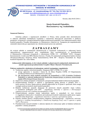 STOWARZYSZENIE INŻYNIERÓW I TECHNIKÓW KOMUNIKACJI RP ODDZIAŁ W KROŚNIE Polish Association of Engineers & Technicians of Transportation Department in Krosno 38-400 Krosno, ul. Lewakowskiego 53 Tel./fax 13/432-30-12 e-mail: [email protected], www.klubdiagnosty.pl REGON: 370018453 NIP: 684-10-59-472 Krosno, dnia 04.03.2016 r. Stacje Kontroli Pojazdów, Rzeczoznawcy wg. rozdzielnika Szanowni Państwo, Jesteśmy jednym z najstarszych ośrodków w Polsce, który posiada duże doświadczenie w zakresie udzielania niezbędnych wyjaśnień i wskazówek dotyczących stosowania w praktyce przepisów związanych z przeprowadzaniem badań technicznych pojazdów oraz funkcjonowaniem stacji kontroli pojazdów. Ponadto informujemy, że Ministerstwo właściwe ds. Transportu już niejednokrotnie zmieniało stanowiska po zapoznaniu się z dostarczonymi przez nas opiniami. ZAPRAS ZAMY do wzięcia udziału w seminariach szkoleniowych w terminach wykazanych w załączonej karcie zgłoszeniowej, organizowanych przy współudziale firm uczestniczących w posiedzeniach w Ministerstwie Cyfryzacji związanych z wdrożeniem CEPIK 2.0 - „SUNRISE” P.H.U. Grzegorz Krzemieniecki z Łodzi oraz BPG Maxine Gawron z Toszka. W seminariach prelegentem będzie również Wiceprzewodniczący Krajowej Sekcji Samochodowej SITK RP - Krajowy Konsultant ds. Stacji Kontroli Pojazdów inż. Artur Sałata. Jednocześnie informujemy, że do wzięcia udziału w planowanych seminariach szkoleniowych zostali zaproszeni przedstawiciele Urzędów Miast i Starostw Powiatowych. Podczas seminariów szkoleniowych planujemy omówić następujące zagadnienia: 1) Techniczne aspekty wdrożenia projektu Integracja SKP z CEPIK 2.0, w tym: a) uwagi zgłoszone w styczniu i lutym br. do Biura Projektu CEPiK 2.0 Departamentu Ewidencji Państwowych Ministerstwa Cyfryzacji. b) jak przygotować stację kontroli pojazdów do komunikacji z CEP (Centralna Ewidencja Pojazdów) w zakresie podłączenia do Środowiska Integracyjnego za pomocą zestawionego tunelu VPN (Virtual Private Network). 2) Najnowsze zmiany przepisów związanych z przeprowadzaniem badań technicznych pojazdów. 3) Przeprowadzanie kontroli w oparciu o sporządzoną opinię prawną w grudniu 2015 r., która zawiera 30 stron. Radca prawny udzielił odpowiedzi na 18 pytań w sprawach, które mogą wystąpić podczas kontroli stacji kontroli pojazdów. 4) Badanie techniczne pojazdu służącego do przewozu innych pojazdów (typu Lohra), w kontekście podlegania pod UDT. - zagadnienie omówimy w oparciu o obowiązujące regulacje prawne oraz wymianę korespondencji z UDT. 5) Przeprowadzanie pomiaru emisji zadymienia spalin w pojazdach (w tym również w ciągnikach rolniczych) w kontekście prowadzonych kontroli zadymienia spalin przez organy kontroli ruchu drogowego – zagadnienie omówimy w oparciu o sporządzoną opinię. 6) Pojazdy zasilane gazem a bezpieczeństwo diagnosty samochodowego - zagadnienie omówimy w oparciu o wymianę korespondencji z Państwową Inspekcją Pracy oraz w oparciu o opinię TDT w Warszawie. 7) Przedstawienie naszych działań w zakresie dążenia do waloryzacji opłat za badania techniczne pojazdów i zmiany przepisów. NASZYM CELEM JEST DĄŻENIE DO ELIMINACJI NIEWŁAŚCIWYCH PRZEPISÓW REGULUJĄCYCH ZASADY PRZEPROWADZANIA BADAŃ TECHNICZNYCH ORAZ REJESTRACJI POJAZDÓW 8) Czytelne wypełnianie pokwitowań za zatrzymany dowód rejestracyjny w oparciu o wymianę korespondencji pomiędzy naszym Stowarzyszeniem a Komendą Główną Policji. 9) Pobieranie opłat przed badaniem technicznym i wyznaczanie terminów płatności, które mają wejść w życie 1 stycznia 2017 roku oraz planowane kontrole podmiotów prowadzących stacje kontroli pojazdów - zagadnienie omówimy w oparciu o wyjaśnienia Ministerstwa Finansów, które zostały skierowane do naszego Stowarzyszenia. 10) Przeprowadzenie dodatkowego badania technicznego pojazdu bez tablic – dotyczy ustalenia danych technicznych. Koszt uczestnictwa w seminarium szkoleniowym wynosi: a) 299 zł brutto od osoby, b) 270 zł brutto od osoby, w sytuacji, gdy w seminarium szkoleniowym uczestniczą 2 osoby skierowane przez jednego pracodawcę, c) 240 zł brutto od osoby, w sytuacji, gdy w seminarium szkoleniowym uczestniczą 3 lub więcej osób skierowanych przez jednego pracodawcę. Cena obejmuje: udział w seminarium szkoleniowym i lunch. Koszty dojazdu pokrywa uczestnik. Udział w seminarium szkoleniowym dla dwóch osób zgłoszonych przez podmiot prowadzący stację kontroli pojazdów i posiadający zawartą umowę o współpracy z SITK RP Oddział w Krośnie jest bezpłatny. Każdy uczestnik otrzyma między innymi: 1. prezentację opracowaną przez Ministerstwo Spraw Wewnętrznych „Komunikacja SKP z CEPIK 2.0” udostępnioną naszemu Stowarzyszeniu, 2. wersję testową programu SKP PRO wraz z aktami prawnymi i normatywnymi, 3. certyfikat potwierdzający udział w seminarium szkoleniowym, 4. notes konferencyjny, 5. projekt rozporządzenia zmieniającego rozporządzenie w sprawie warunków technicznych pojazdów oraz zakresu ich niezbędnego wyposażenia - projekt ma na celu zaktualizowanie przepisów w zakresie warunków technicznych w stosunku do obowiązujących regulacji UE (dyrektyw i rozporządzeń) oraz regulaminów EKG ONZ, aby zapobiec sytuacjom, w których wymagania homologacyjne pojazdów będą różne niż krajowe warunki techniczne pojazdów, weryfikowane w toku okresowych badań technicznych pojazdu. Ponadto projekt reguluje kwestię dopuszczenia przewozu kontenerów 45 stopowych w operacjach transportu intermodalnego (transportu kombinowanego). 6. najnowszy projekt (z 2016 roku) zmieniający rozporządzenie w sprawie zakresu i sposobu przeprowadzania badań technicznych pojazdów oraz wzorów dokumentów stosowanych przy tych badaniach. Wśród uczestników rozlosowane będą upominki. Kartę zgłoszeniową należy przesłać pocztą, mailem lub faxem w terminie wskazanym w karcie. Każdy 