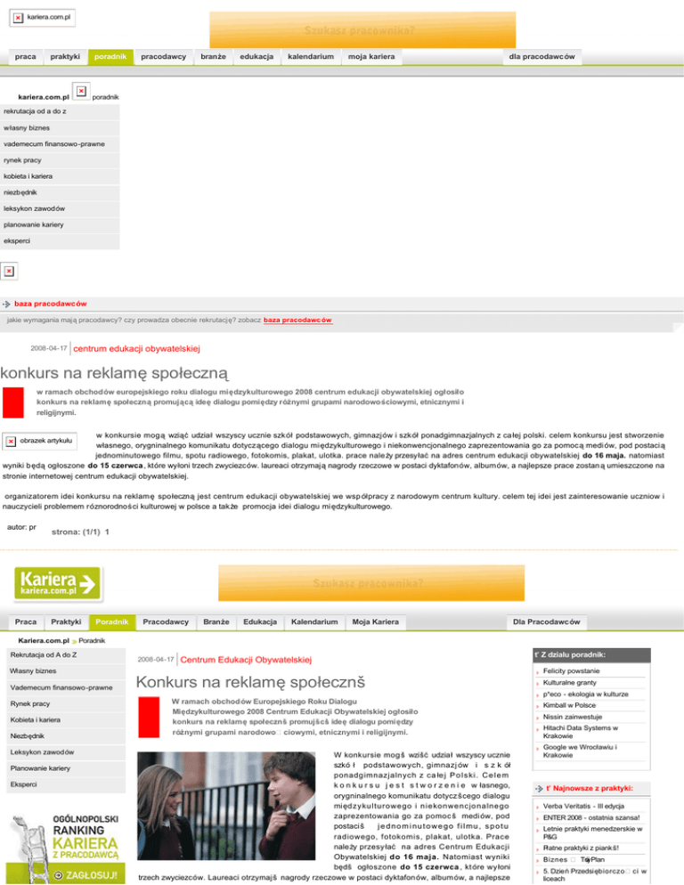kariera.com.pl praca praktyki kariera.com.pl poradnik pracodawcy branże edukacja kalendarium moja kariera dla pracodawców poradnik rekrutacja od a do z własny biznes vademecum finansowo-prawne rynek pracy kobieta i kariera niezbędnik leksykon zawodów planowanie kariery eksperci baza pracodawców jakie wymagania mają pracodawcy? czy prowadza obecnie rekrutacj ę? zobacz baza pracodawc ów 2008-04-17 centrum edukacji obywatelskiej konkurs na reklamę społeczną w ramach obchodów europejskiego roku dialogu międzykulturowego 2008 centrum edukacji obywatelskiej ogłosiło konkurs na reklamę społeczną promującą ideę dialogu pomiędzy różnymi grupami narodowościowymi, etnicznymi i religijnymi. w konkursie mog ą wziąć udział wszyscy ucznie szkół podstawowych, gimnazj ów i szkół ponadgimnazjalnych z całej polski. celem konkursu jest stworzenie własnego, orygninalnego komunikatu dotyczącego dialogu mi ędzykulturowego i niekonwencjonalnego zaprezentowania go za pomoc ą medi ów, pod postacią jednominutowego filmu, spotu radiowego, fotokomis, plakat, ulotka. prace nale ży przesyłać na adres centrum edukacji obywatelskiej do 16 maja. natomiast wyniki będą ogłoszone do 15 czerwca , które wyłoni trzech zwyciezców. laureaci otrzymają nagrody rzeczowe w postaci dyktafonów, albumów, a najlepsze prace zostaną umieszczone na stronie internetowej centrum edukacji obywatelskiej. organizatorem idei konkursu na reklam ę spo łeczną jest centrum edukacji obywatelskiej we wsp ółpracy z narodowym centrum kultury. celem tej idei jest zainteresowanie uczniow i nauczycieli problemem r óznorodności kulturowej w polsce a także promocja idei dialogu międzykulturowego. obrazek artykułu autor: pr Praca strona: (1/1) 1 Praktyki Kariera.com.pl Poradnik Pracodawcy Branże Edukacja Kalendarium Moja Kariera Dla Pracodawców Poradnik Rekrutacja od A do Z 2008-04-17 Centrum Edukacji Obywatelskiej Własny biznes Vademecum finansowo-prawne ť Z dzialu poradnik: Felicity powstanie Konkurs na reklamę społecznš Kulturalne granty p*eco - ekologia w kulturze Rynek pracy Kobieta i kariera Niezbędnik Leksykon zawodów Planowanie kariery Eksperci W ramach obchodów Europejskiego Roku Dialogu Międzykulturowego 2008 Centrum Edukacji Obywatelskiej ogłosiło konkurs na reklamę społecznš promujšcš ideę dialogu pomiędzy różnymi grupami narodowo ciowymi, etnicznymi i religijnymi. W konkursie mog š wzišć udział wszyscy ucznie szkó ł podstawowych, gimnazj ów i s z k ół ponadgimnazjalnych z ca łe j P o l s k i . C e l e m k o n k u r s u j e s t s t w o r z e n i e w łasnego, orygninalnego komunikatu dotycz šcego dialogu międzykulturowego i niekonwencjonalnego zaprezentowania go za pomoc š medi ów, pod postaciš j e d n o m i n u t o w e g o f i l m u , s p o t u radiowego, fotokomis, plakat, ulotka. Prace należy przesy łać na adres Centrum Edukacji Obywatelskiej do 16 maja. Natomiast wyniki będš ogłoszone do 15 czerwca , kt óre wy łoni trzech zwyciezców. Laureaci otrzymajš nagrody rzeczowe w postaci dyktafonów, album ów, a najlepsze Kimball w Polsce Nissin zainwestuje Hitachi Data Systems w Krakowie Google we Wrocławiu i Krakowie ť Najnowsze z praktyki: Verba Veritatis - III edycja ENTER 2008 - ostatnia szansa! Letnie praktyki menedzerskie w P&G Płatne praktyki z piankš! Biznes Tw ój Plan 5. Dzień Przedsiębiorczo liceach ci w prace zostanš umieszczone na stronie internetowej Centrum Edukacji Obywatelskiej. Organizatorem idei konkursu na reklam ę spo łecznš jest Centrum Edukacji Obywatelskiej we wsp ółpracy z Narodowym Centrum Kultury. Celem tej idei jest zainteresowanie uczniow i nauczycieli problemem r óznorodno ci kulturowej w Polsce a tak że promocja idei dialogu międzykulturowego. Autor: pr Wygraj nagrody - Moneta Aurea strona: (1/1) 1 Brak komentarzy Baza pracodawców Jakie wymagania majš pracodawcy? Czy prowadza obecnie rekrutację? Zobacz Baza pracodawców Do tego artykułu nikt jeszcze nie dodał komentarza. Mo żesz by ć pierwszy! Dodaj komentarz O nas | Kontakt | Reklama | Polityka prywatno ci | Regulamin | Newsletter | Publikacje | Partnerzy | Wymiana tre Š Copyright GRUPA MODUS 2006 i RSS ci